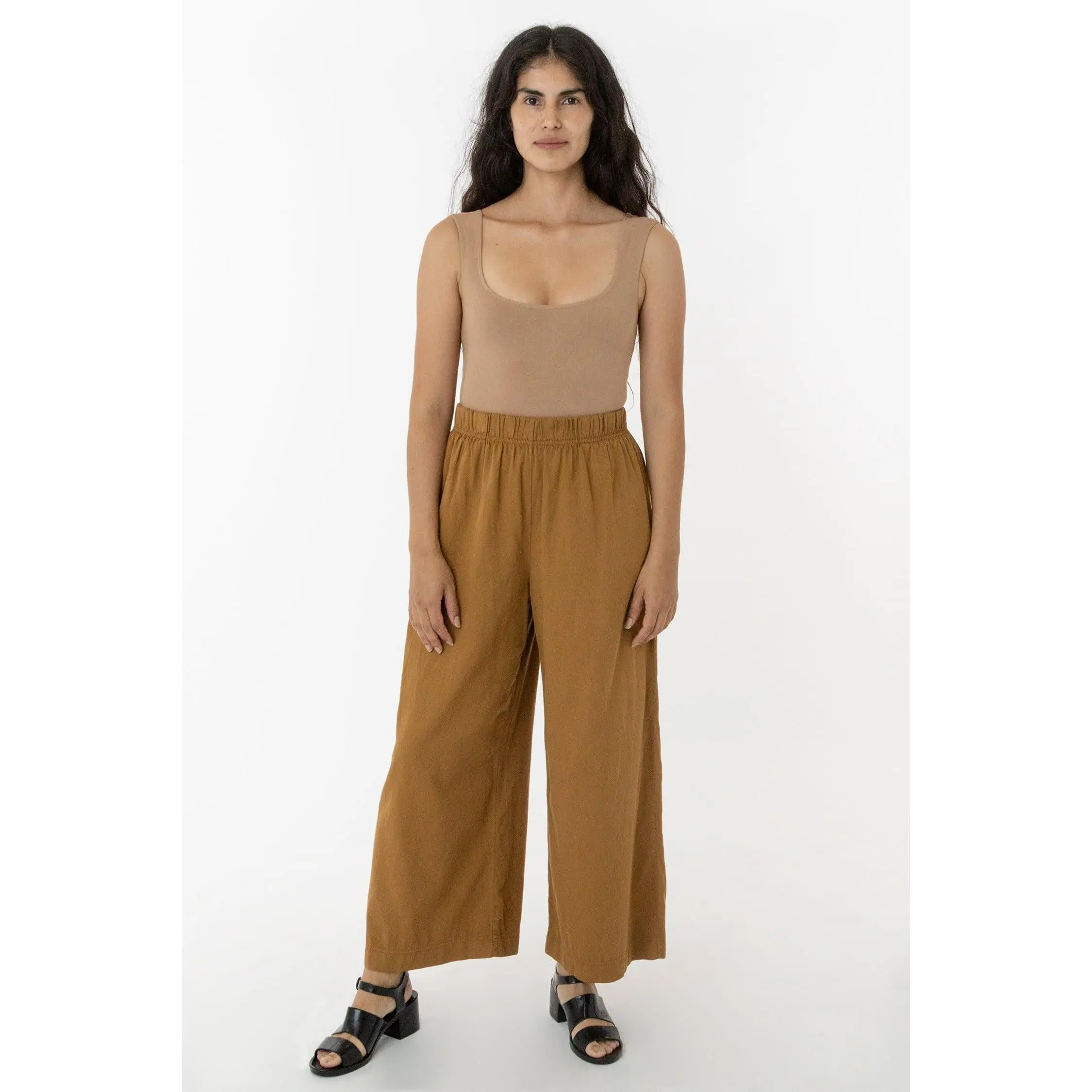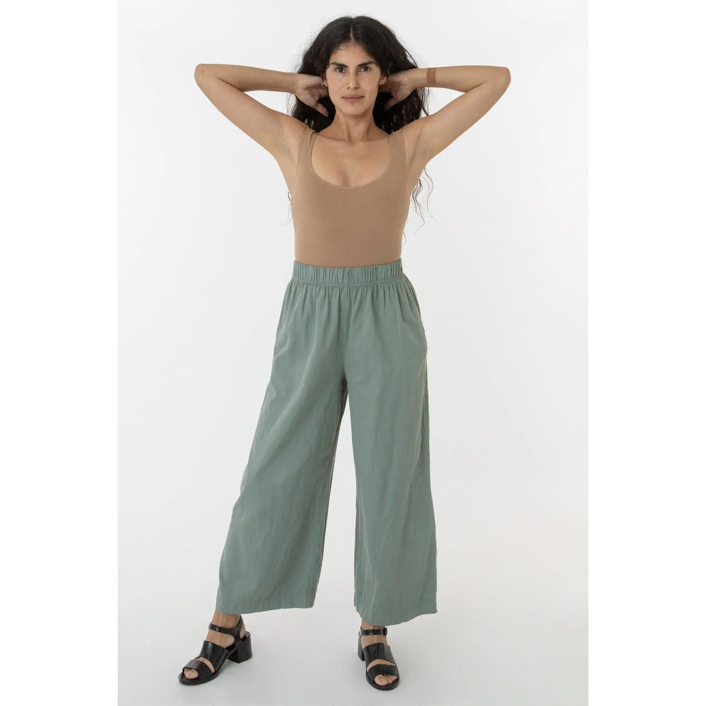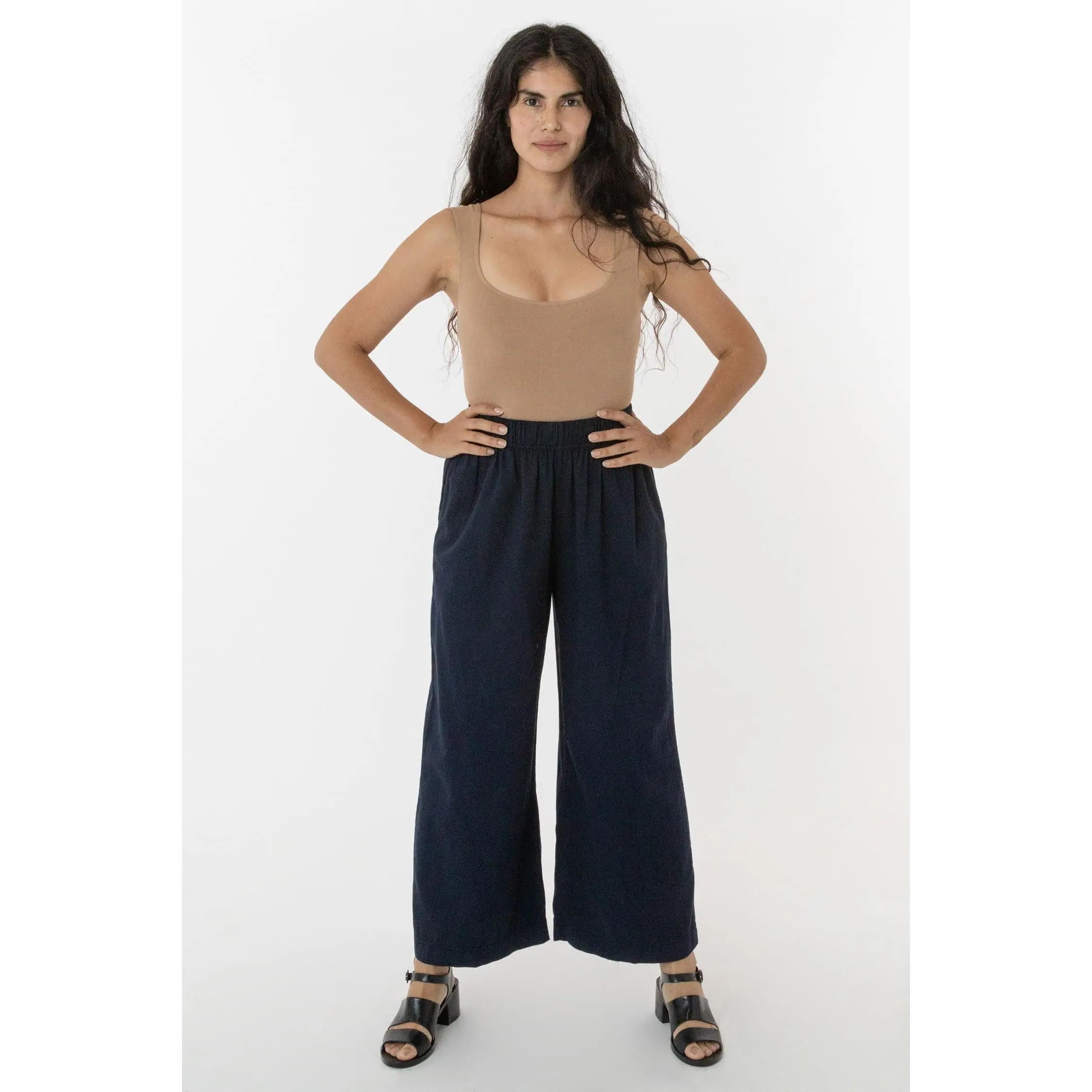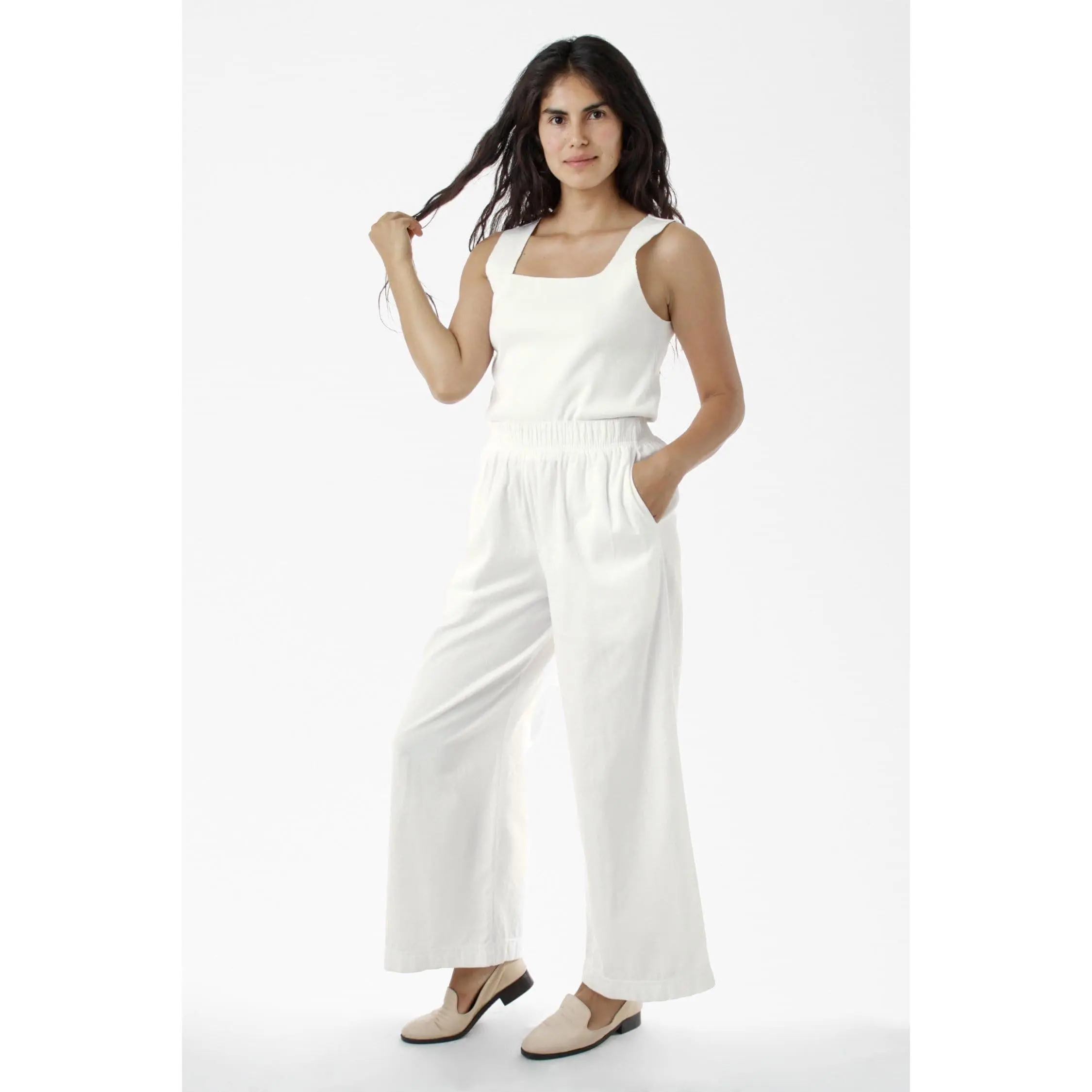This relaxed cotton twill pant features a breezy wide leg fit and a 2 inch soft elastic waist for everyday comfort. This style can be worn for an everyday vacation look with our cotton spandex bodysuit styles or dressed up with a sweater or blouse. Comes with two side pockets.