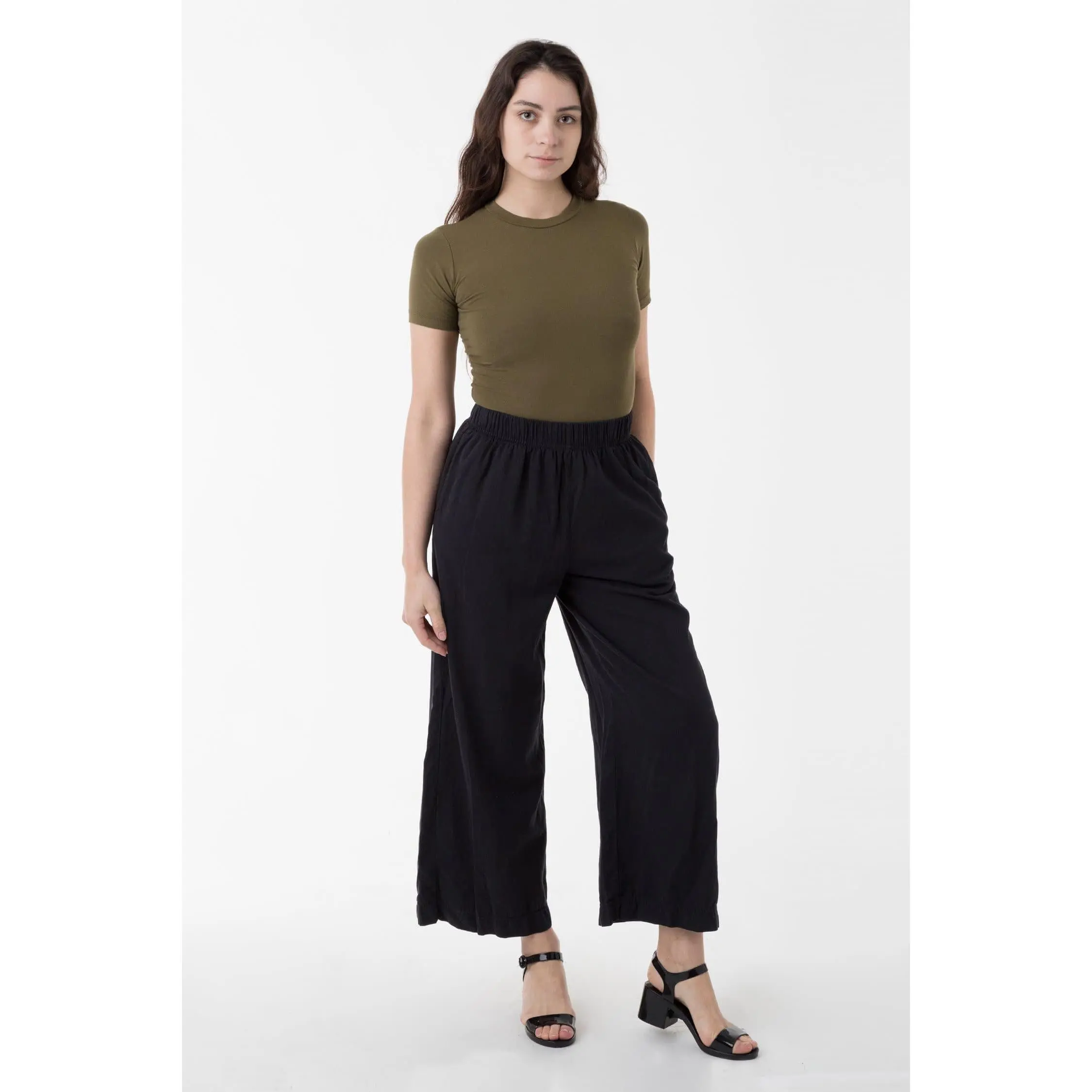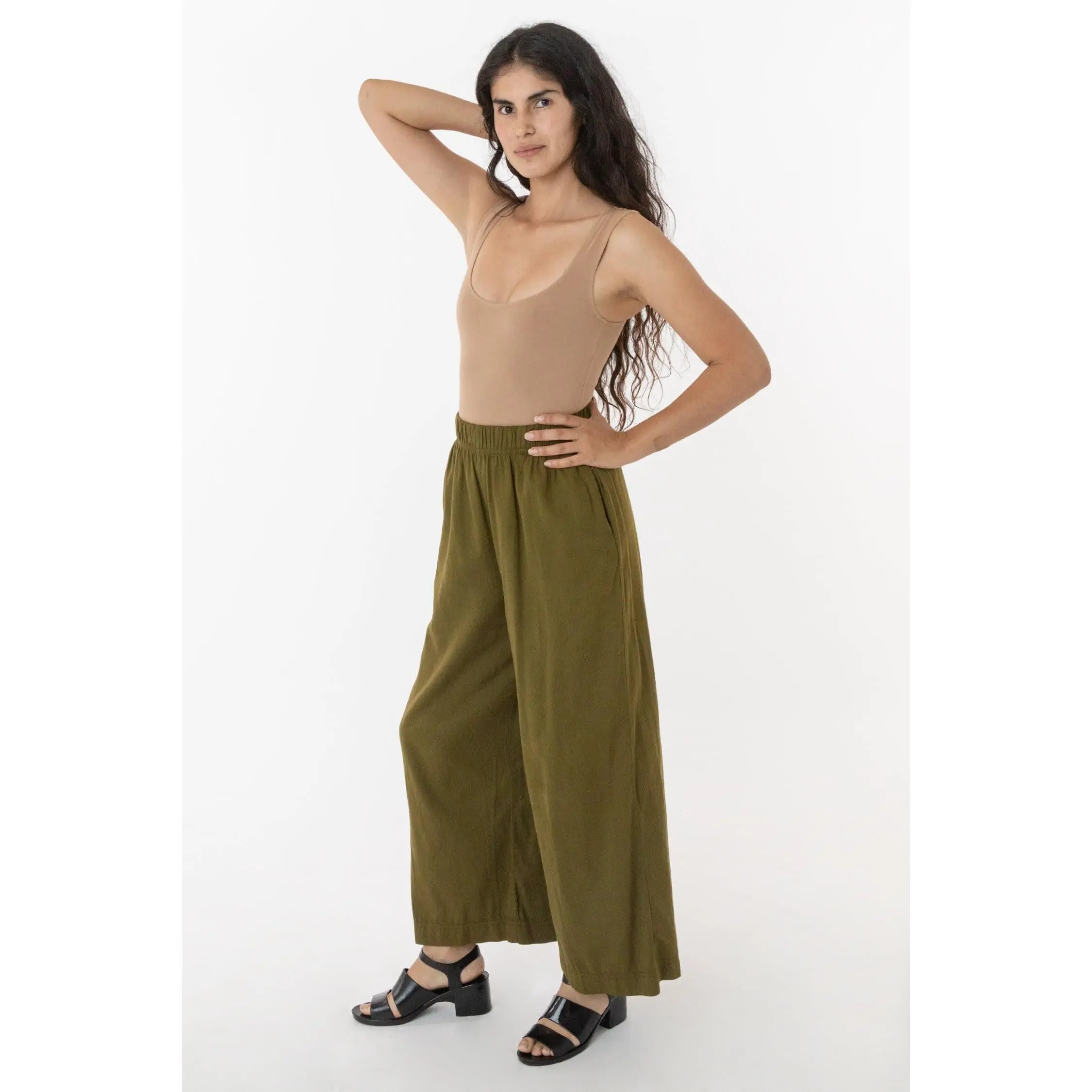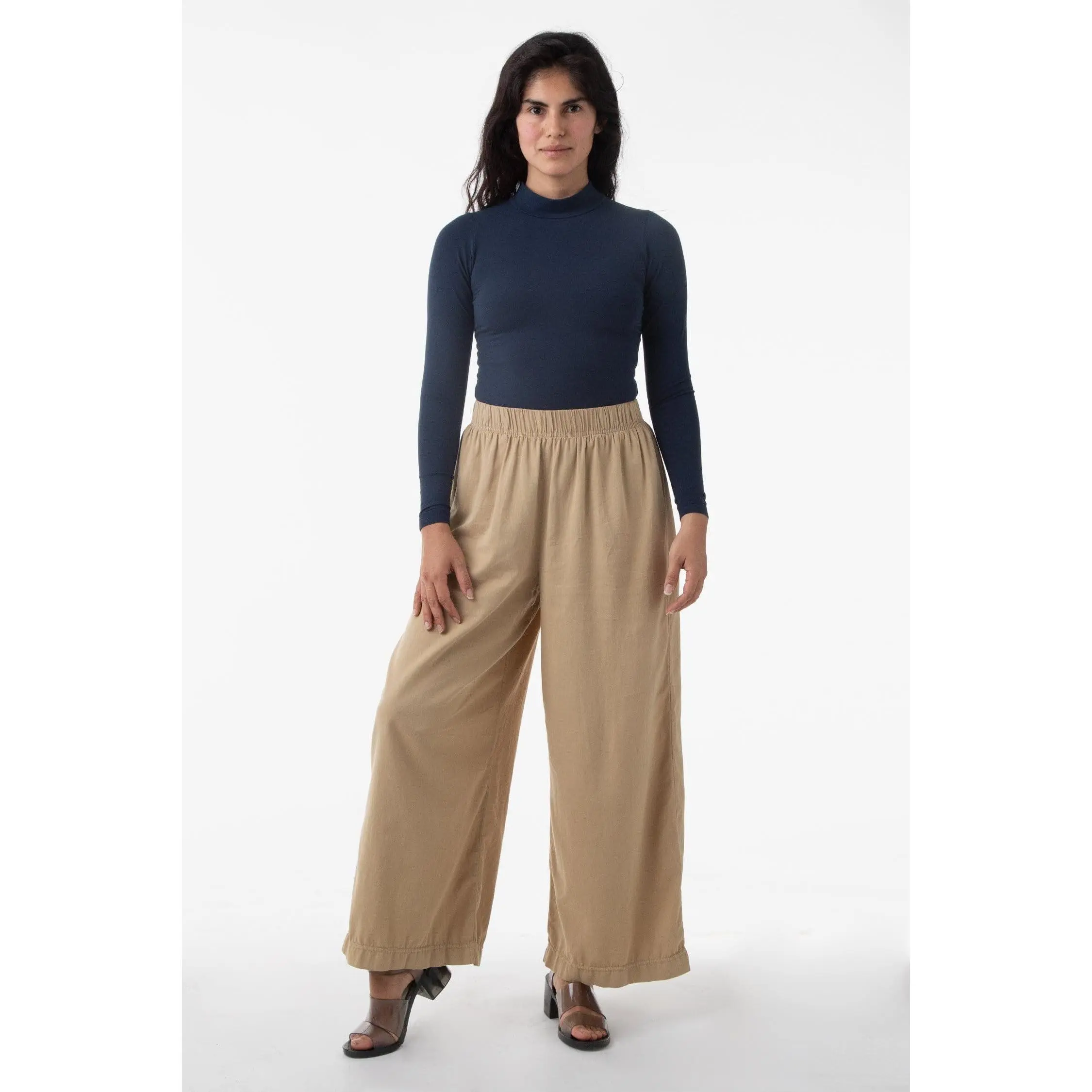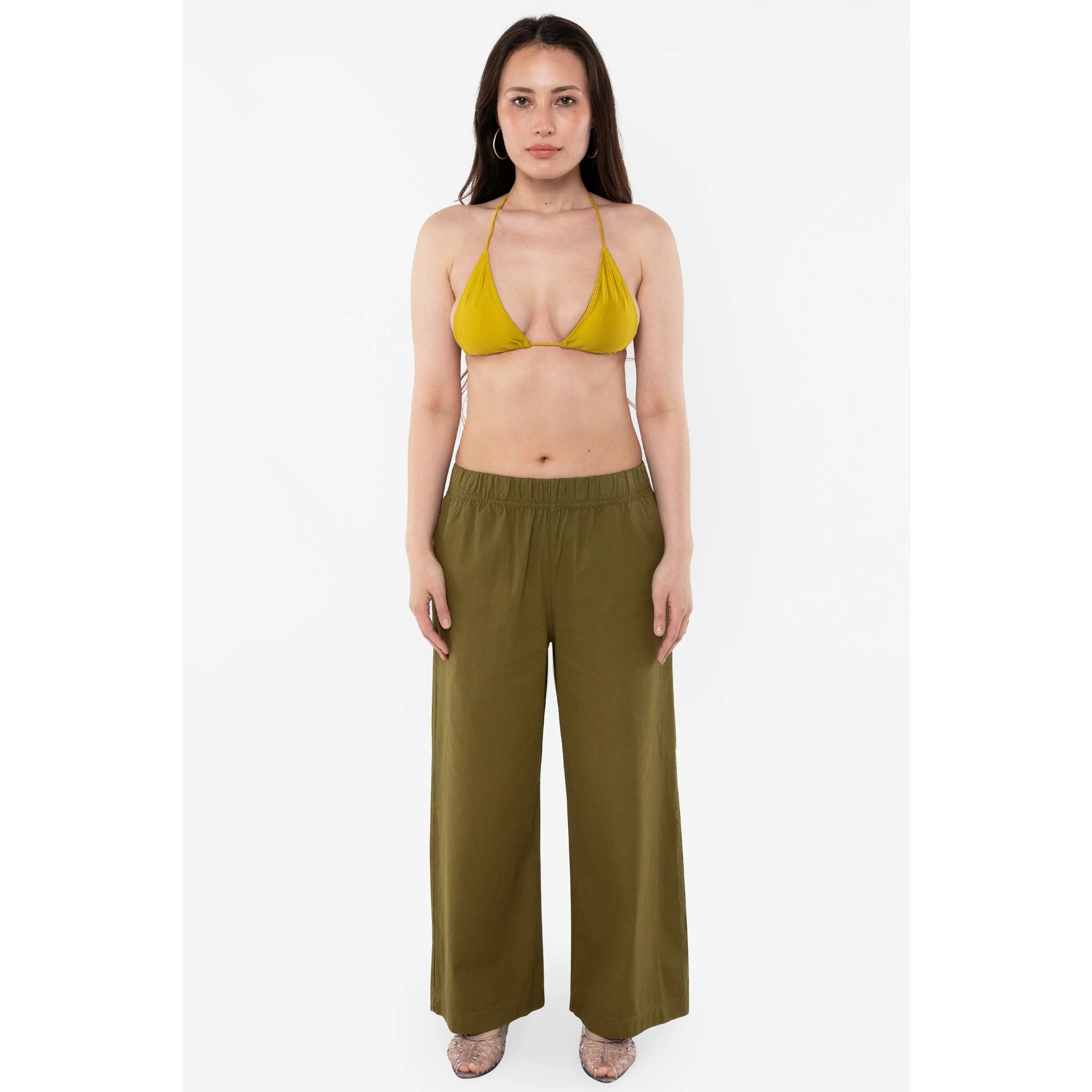 This relaxed cotton twill pant features a breezy wide leg fit and a 2 inch soft elastic waist for everyday comfort. This style can be worn for an everyday vacation look with our cotton spandex bodysuit styles or dressed up with a sweater or blouse. Comes with two side pockets.