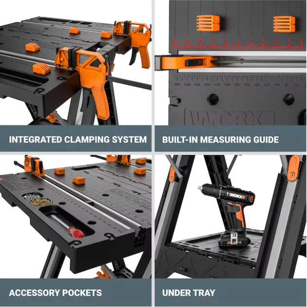Meet your new favorite workhorse, the Pegasus. This multi-function work table and sawhorse with quick clamps and holding pegs can support up to 300 lbs as a table, and up to 1,000 lbs as a sawhorse! The legs lock into place and are made of tough molded ABS with steel supports, and the non-slip feet stay in place on both grass and pavement. Yet the Pegasus itself is only 25 lbs, so you can fold it up and carry it anywhere, or keep it in the back of the truck. The integrated clamping system exerts up to 300 lbs of force to keep your project firmly in place, and has a max clamping width of 18.25”. And the clamp dog pegs allow you to secure round and oddly shaped materials. This table is 31” x 25” and is a standard 32” high, so it can be linked up with our other Worx tables, and other Pegasuses, to make a longer, fully-functional work table. (Link locks are included.) And the folding tray at the base is designed to hold tools, power strips, or anything you need on the job. The Pegasus is tough and solid enough to be a permanent work table or sawhorse but built to be portable, so you can take it from job to job, or from the basement to the garage without a problem. And it folds down to a depth of only 5”, so it’s easy to store when you’re not going to be using it for a while.