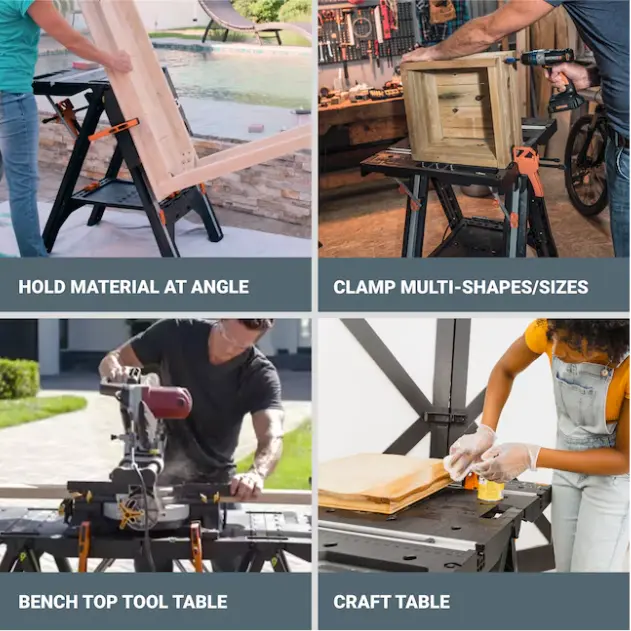 WORK TABLE AND SAWHORSE - Holds up to 300 lbs as a work table, supports 1,000 lbs as a sawhorse - and it’s easy to transition between the two