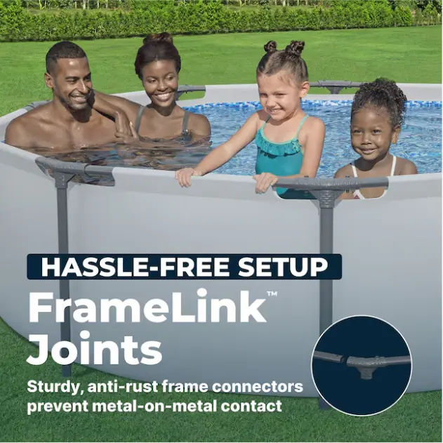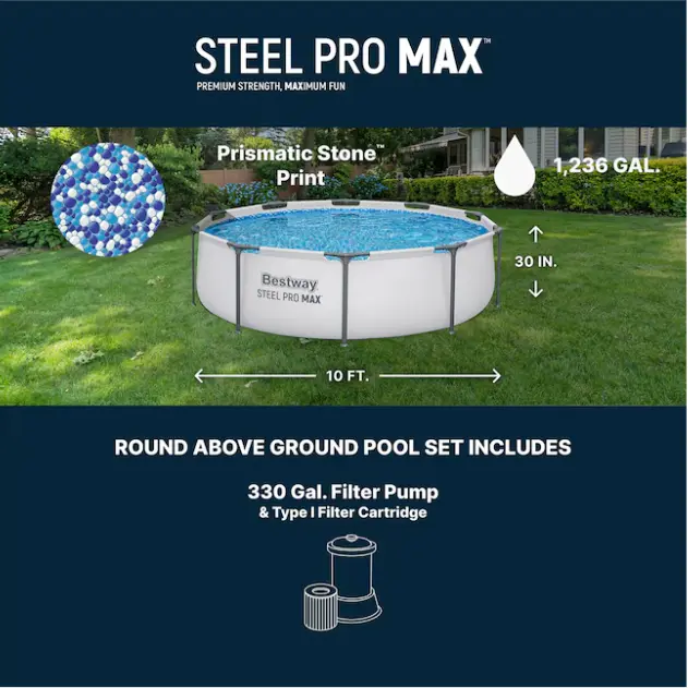 It doesn't get any better than having your own backyard pool! Enjoy a summer full of fun with the Bestway Steel Pro MAX Above Ground Swimming Pool. Featuring an ultra-durable construction, this outdoor swimming pool is made with a corrosion-proof steel frame equipped with a FrameLink System for a sturdy and secure connection. The round frame is compatible with additional attachments, such as cup holders (sold separately). With a DuraPlus liner, this family pool is reinforced for strength and prevents punctures. Including a filter pump, you can be sure to enjoy your pool more and clean less. Equipped with a simple setup and take-down process, you can easily store this 10 foot pool away in the off-season. No tools are required, and a hose connects to the built-in flow control valve to quickly and efficiently drain out the pool water. Spend your hot summer days in the water with the Steel Pro MAX Above-Ground Swimming Pool from Bestway. Disclaimer: Please review your HOA rules and restrictions before purchasing this product. Not all housing agencies permit private above-ground pools.