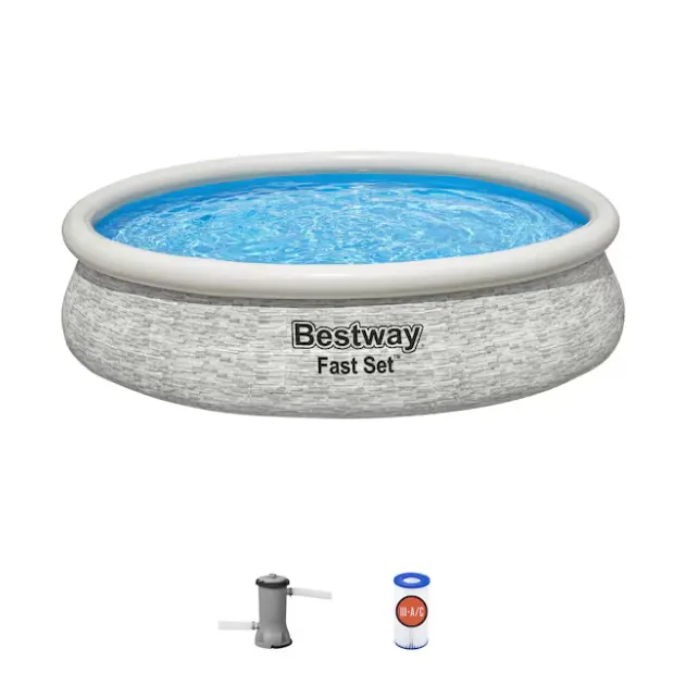 Immerse yourself in refreshing moments as you dive into the refreshing world of backyard relaxation with the Bestway 12 by 30-Inch Fast Set Stacked Stone Design Pool Set with Filter Pump. Unleash the joys of spontaneous aquatic enjoyment, thanks to its seamless 10-minute setup that requires no tools. Crafted for convenience, this pool boasts a size of 12 feet by 30 inches and a water capacity of 1,421 gallons (80 percent). As a testament to durability, this pool's DuraPlus enhanced 3-layer liner has puncture-resistance, and long-lasting performance, ensuring countless hours of splash-filled memories. The Fill and Rise Pool innovation simplifies the process. Just choose a level surface, inflate the top ring, and witness the pool effortlessly rise as it fills with water. Maintenance becomes a breeze with the included 530-gallon filter pump, delivering a steady water flow rate. When the season winds down, the built-in flow control drain valve makes draining hassle-free. This pool set, complete with a repair patch, is not just a summer indulgence but a year-round investment. Take it down with ease for off-season storage, ready to be resurrected for the next wave of aquatic excitement. Compatible with the cartridge 58012 (Ⅲ), this pool set offers an integrated pool system with a 480-gallon water flow rate, ensuring a seamless water experience. Elevate your leisure time with this Fast Set Above Ground Swimming Pool Set from Bestway, a symphony of simplicity, durability, and endless aquatic delight.