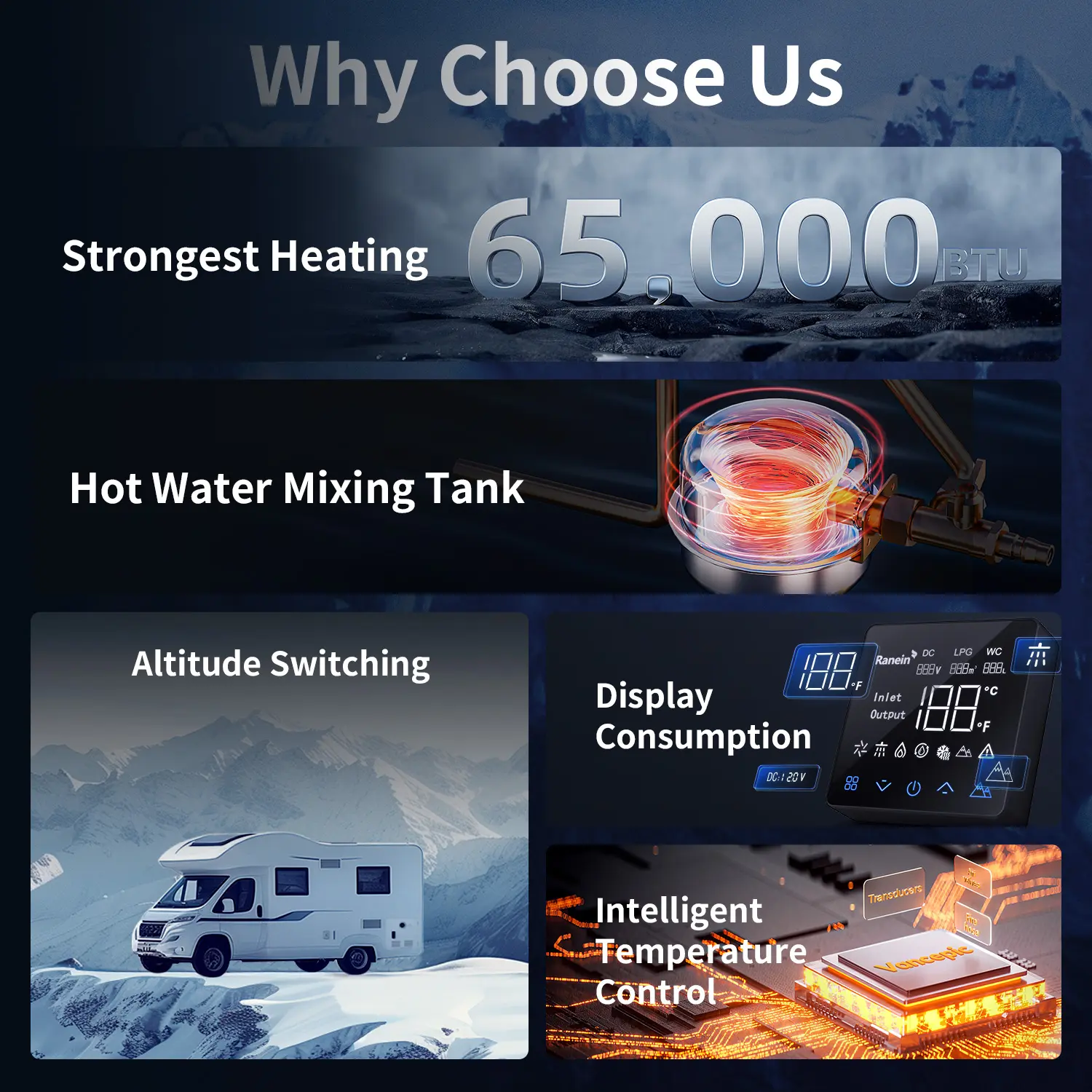 ·【Steady temperature】Temperature ranges from 95°F-124°F. Staged combustion technology controls the amount of flame in summer, prevents the water from getting too hot, and saves the limited propane gas available for caravan travel