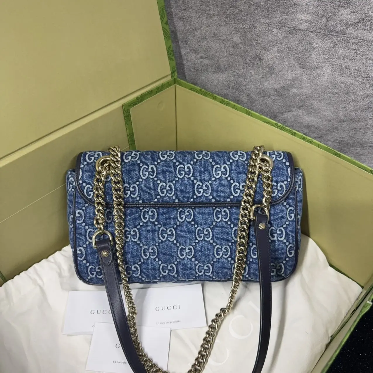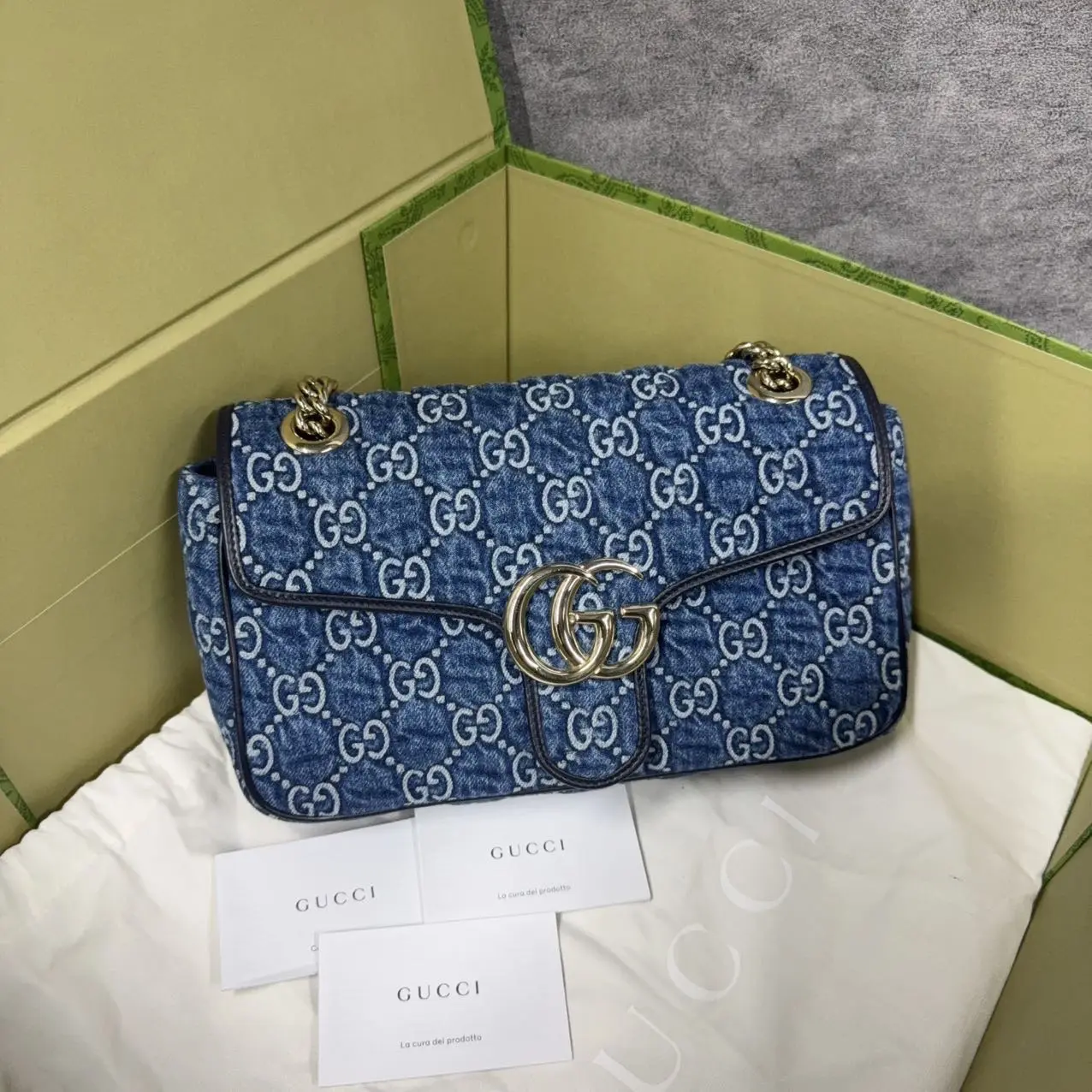 The Marmont Chain Flap Blue is a distinctive accessory with a chain flap design and a blue color. It offers a unique and stylish look. Perfect for those who appreciate a distinctive accessory.