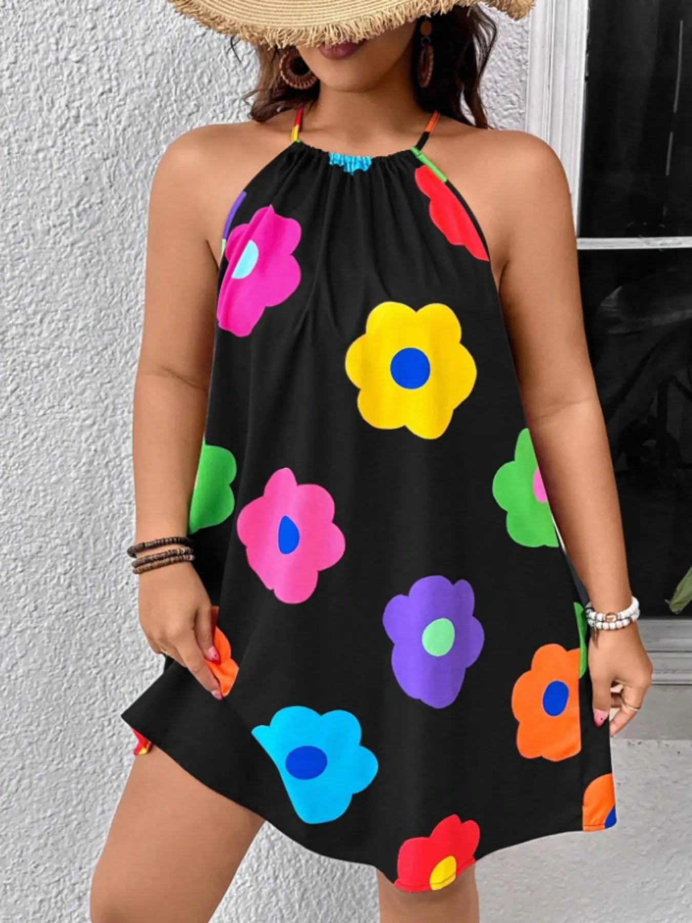Women's Summer Short Dress, Sunflower Floral Print Loose Fit Casual Halter Maxi Dress, Plus Size Fashion Clothing