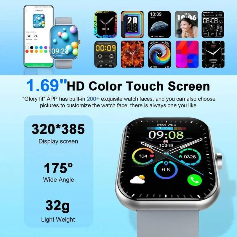 Enjoy a clear and vibrant viewing experience with the 1.69-inch full touch screen. The sleek and lightweight design makes it comfortable for everyday wear, perfect as a smartwatch for men and women for work, workouts, and daily life.