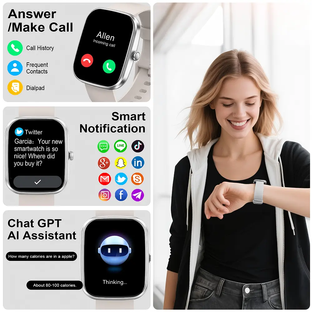 ·【Built-in ChatGPT AI Assistant – Smart Support Anytime, Anywhere】This smart watch comes equipped with ChatGPT AI, allowing you to access smart features directly from your wrist. Whether you need instant answers, translation help, or even emotional and wellness support, ChatGPT is there to help—all with voice or text input. Simply pair the smartwatch via Bluetooth and keep the "GloryFit" app active on your phone to enable the AI features. It’s like having your personal assistant with you 24/7.