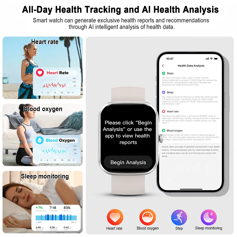 ·【Comprehensive Health Monitoring with AI-Generated Reports】Track your health more intelligently. This fitness watch continuously monitors your heart rate, blood oxygen (SpO2), sleep quality (light, deep, REM), steps, calories, distance, and even menstrual cycles. What sets it apart is the AI-powered health report function: it analyzes your daily data and provides personalized wellness suggestions to help you better understand your body and improve your lifestyle over time.