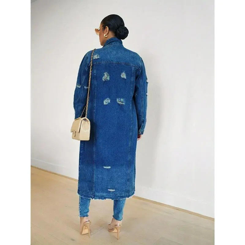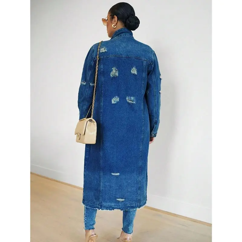 Womens Distressed Ripped Denim Trench Coat Casual Slim Button Down Washed Long Jean Jacket Long Sleeve Solid Color Coat
