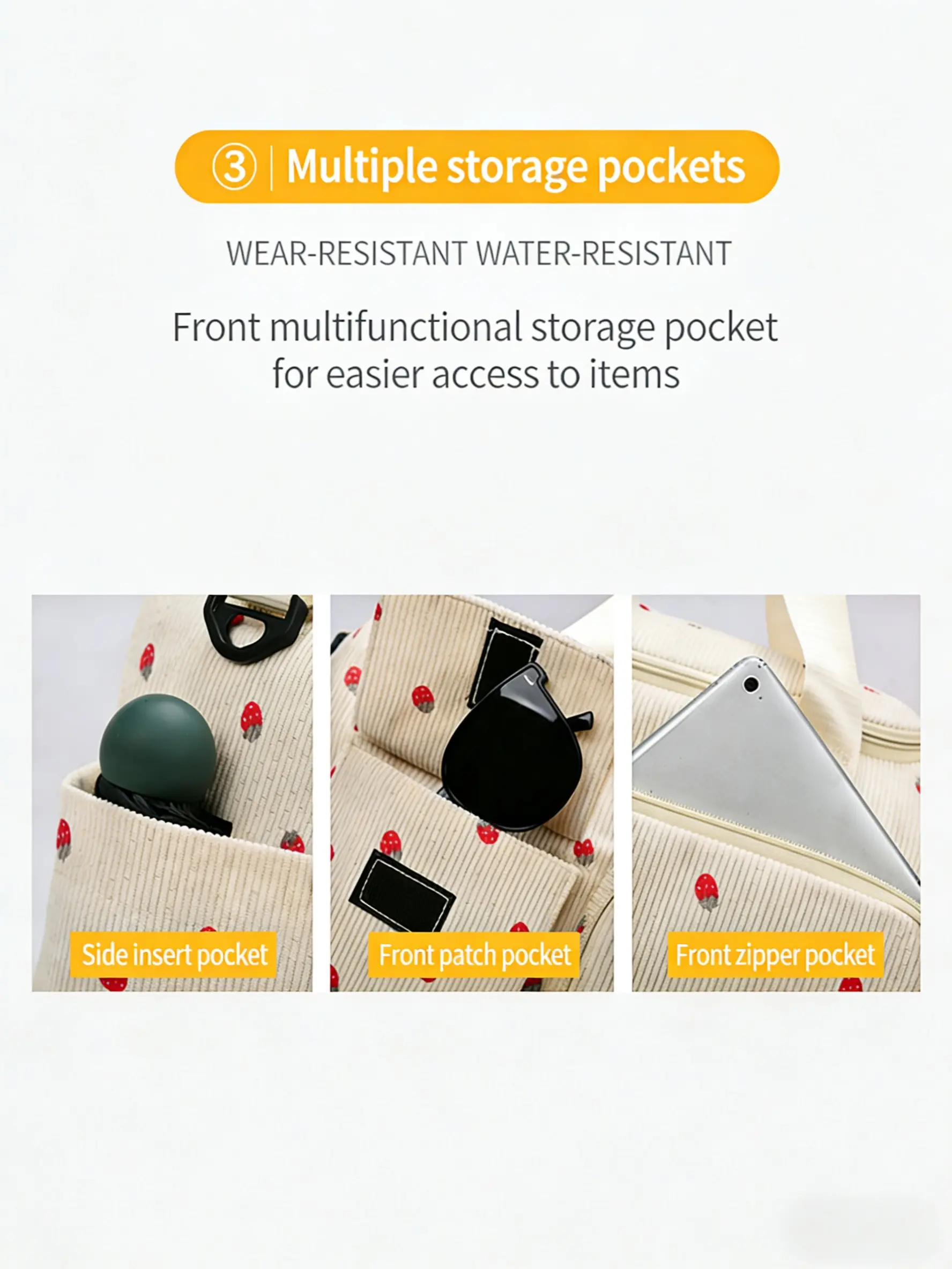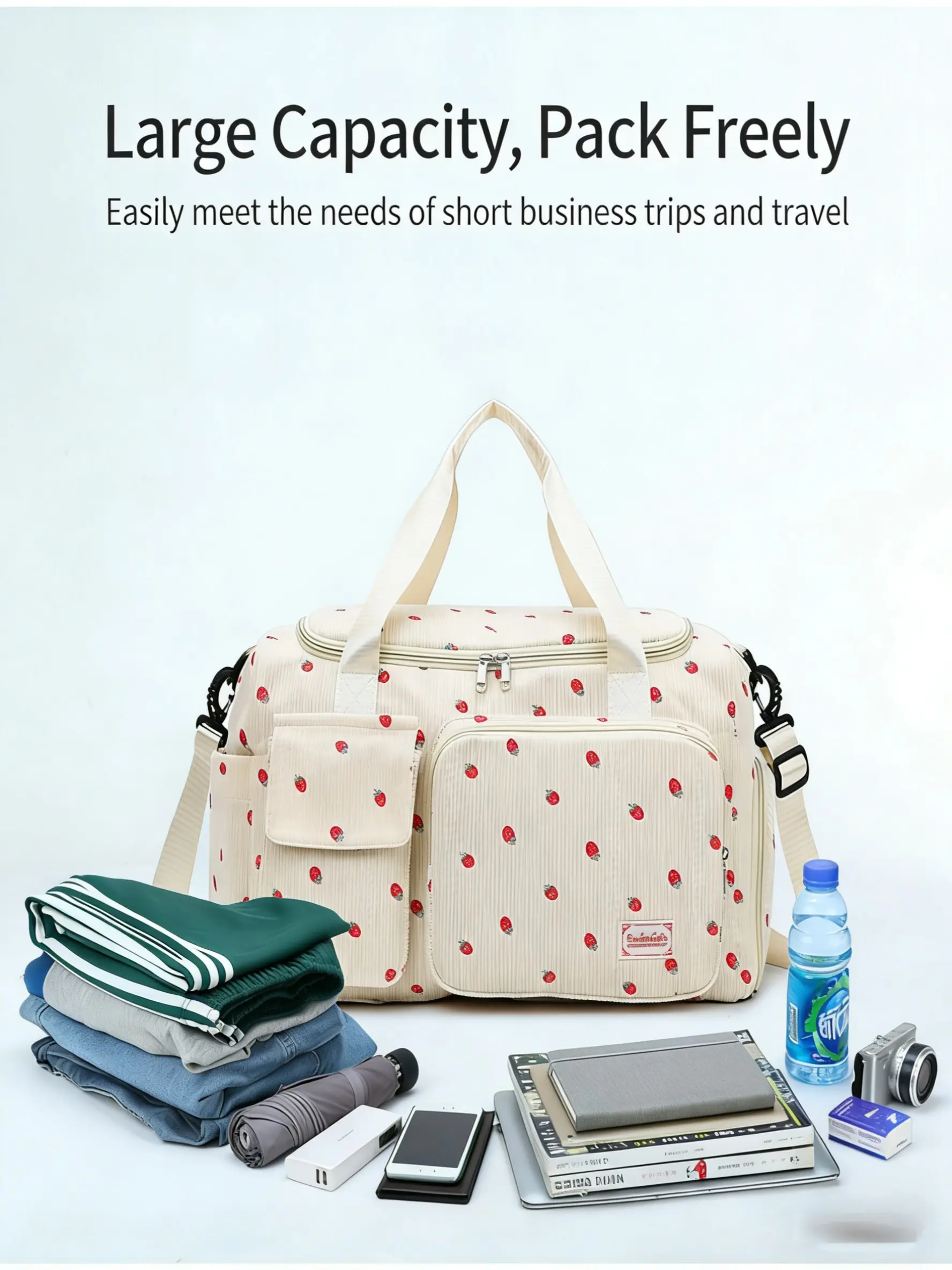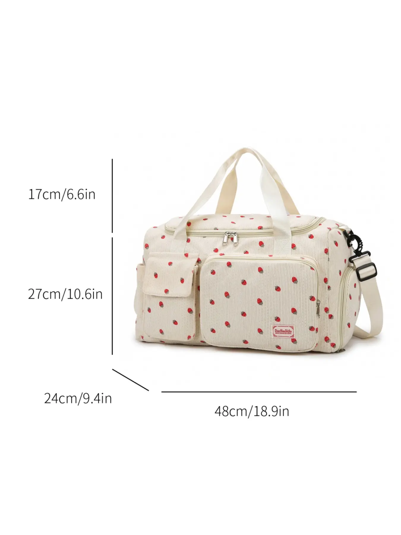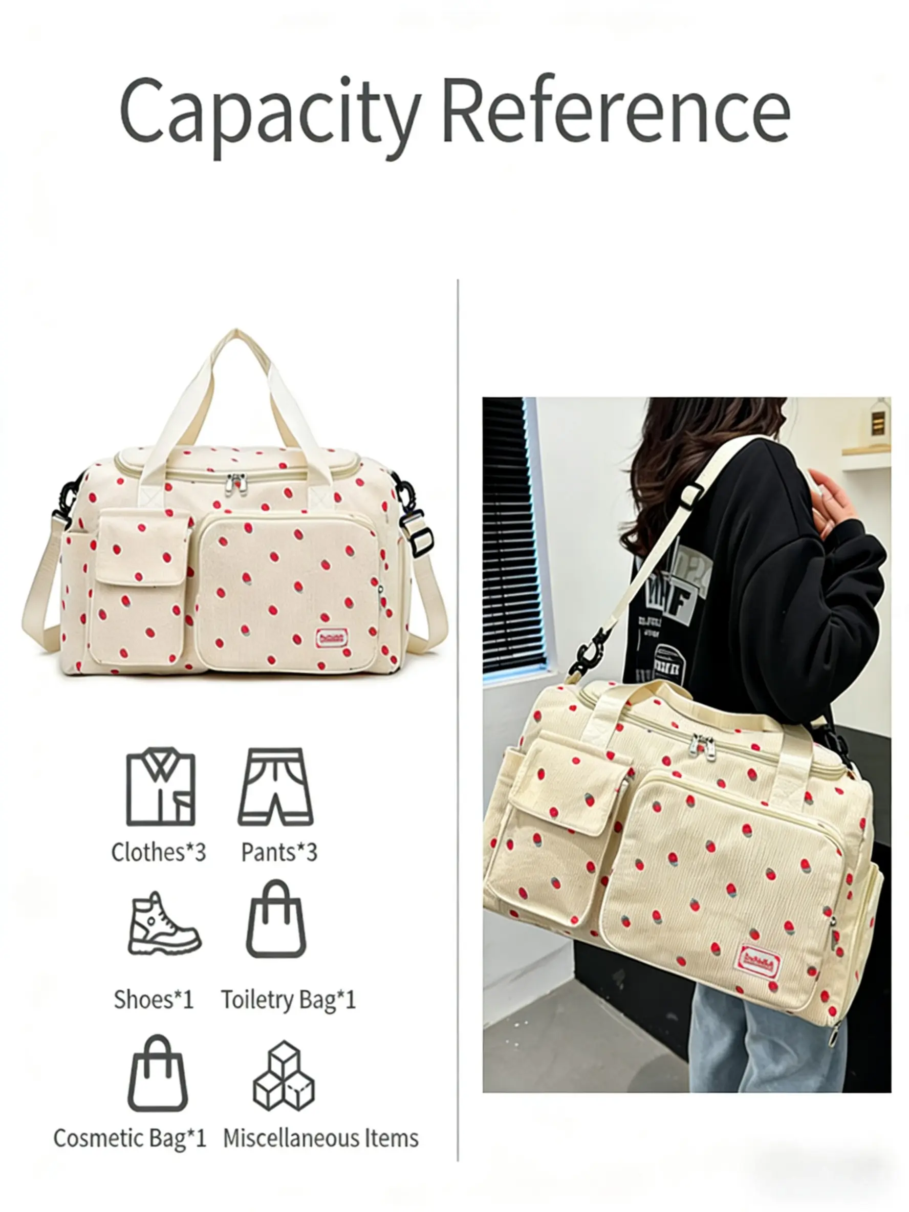 Strawberry Corduroy Handbag, Sweet Cute Style, Multi-Pocket Large Capacity, Crossbody Bag, Girl Short Trip Gym Commute Backpack