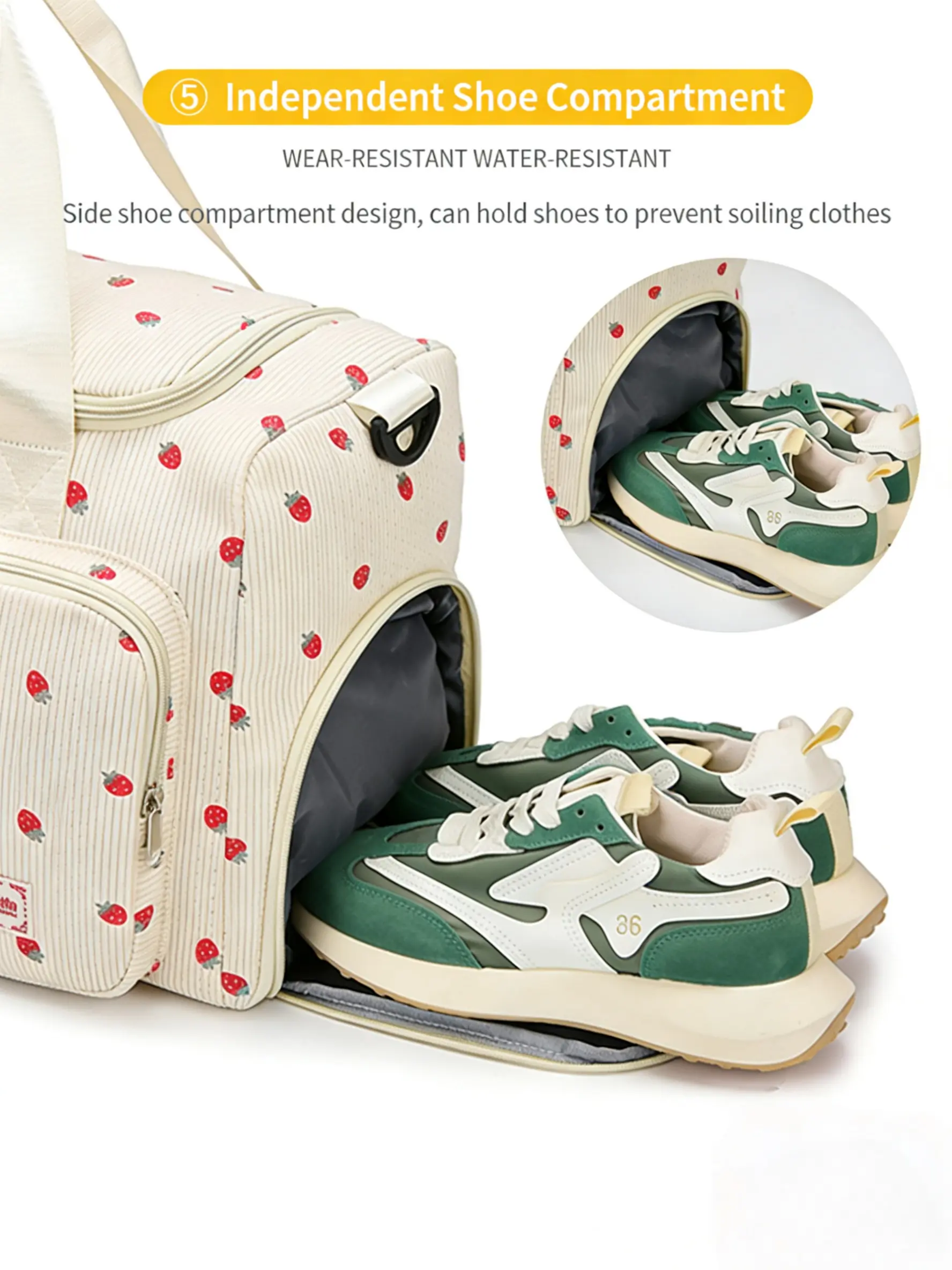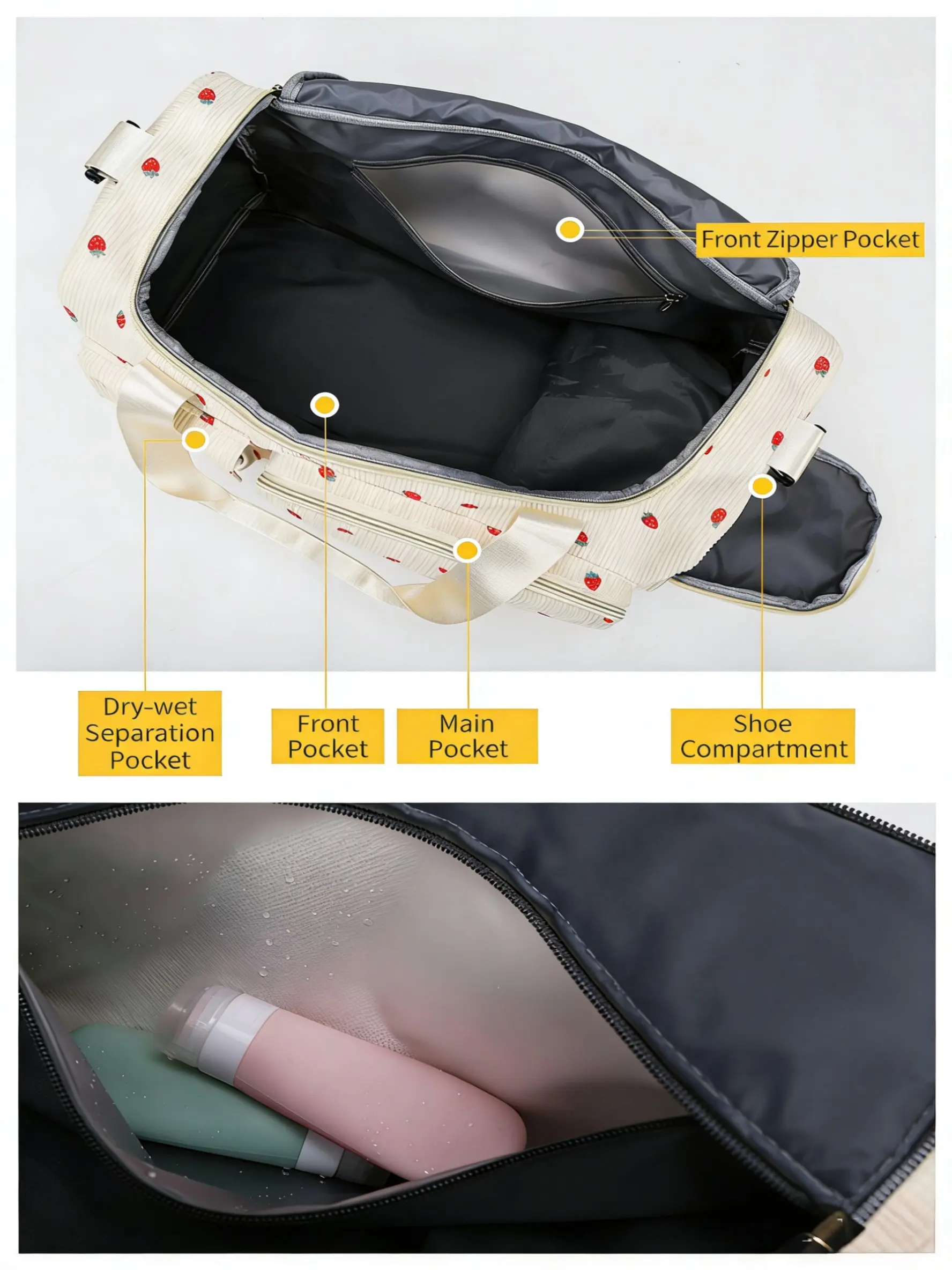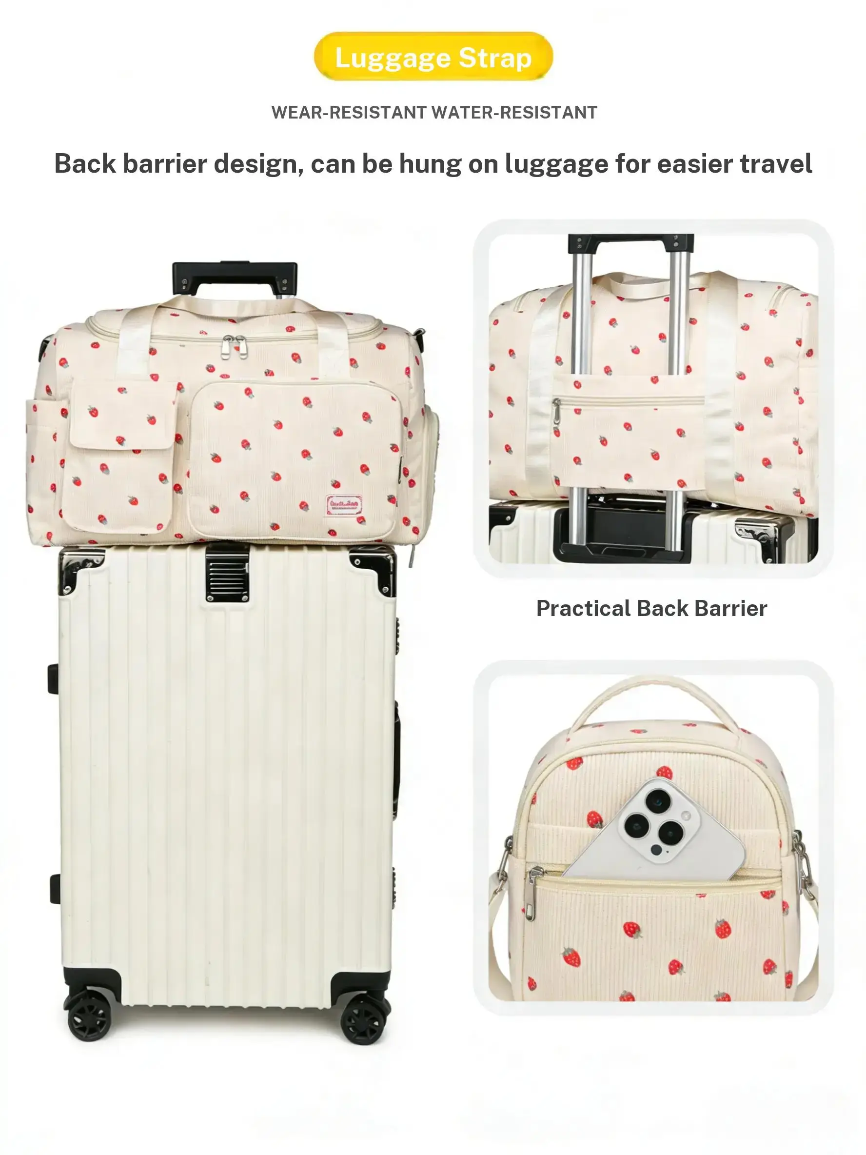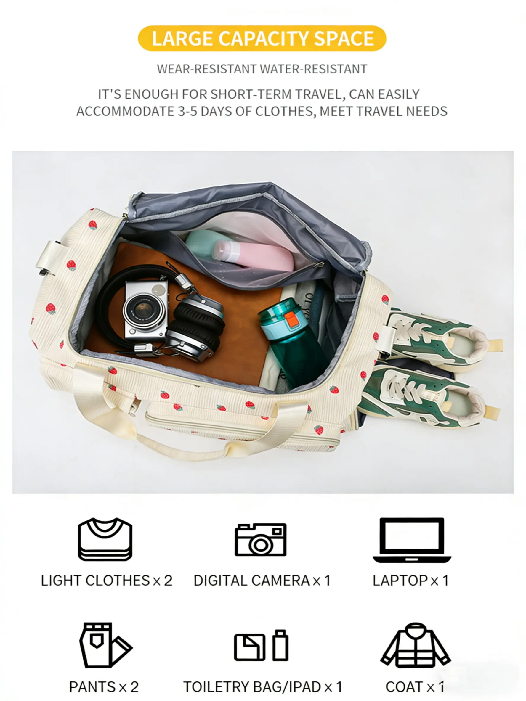 Strawberry Corduroy Handbag, Sweet Cute Style, Multi-Pocket Large Capacity, Crossbody Bag, Girl Short Trip Gym Commute Backpack