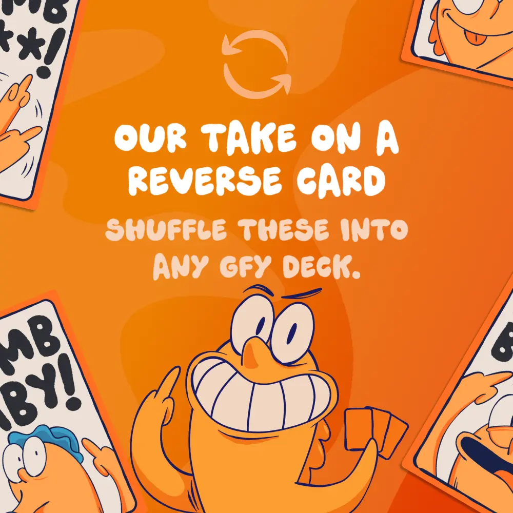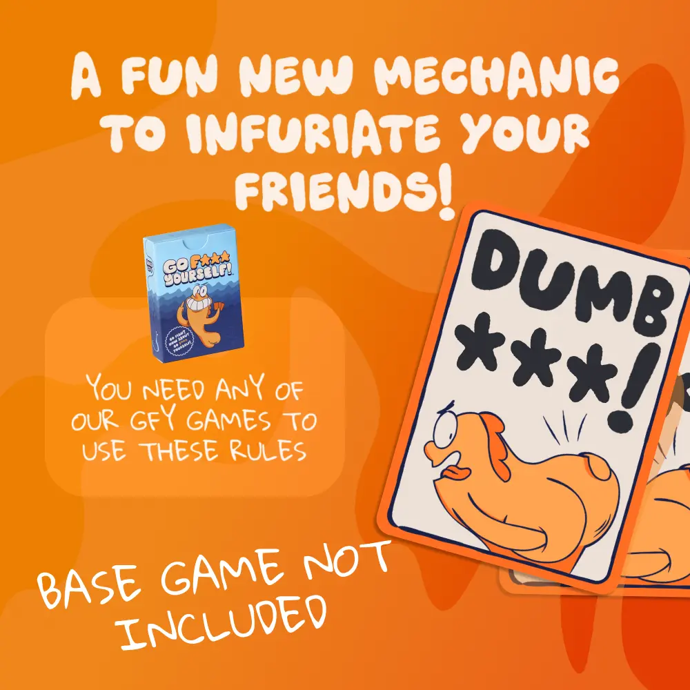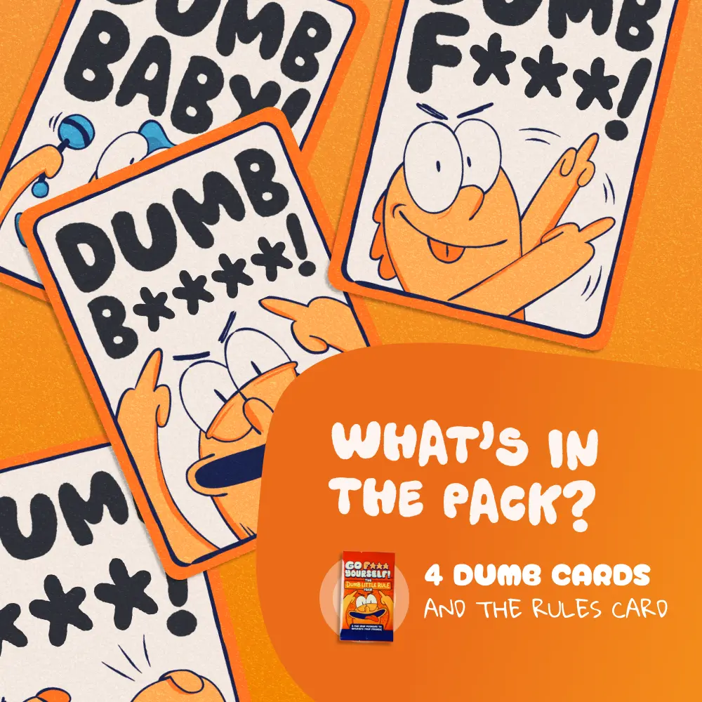 Add a little extra spite to your Go F* Yourself** game. The Dumb Little Pack is a 4-card expansion that lets you flip the script on ANY GFY game, when someone asks you for a card. Instead of handing it over… drop a Dumb Card and call it like it is.