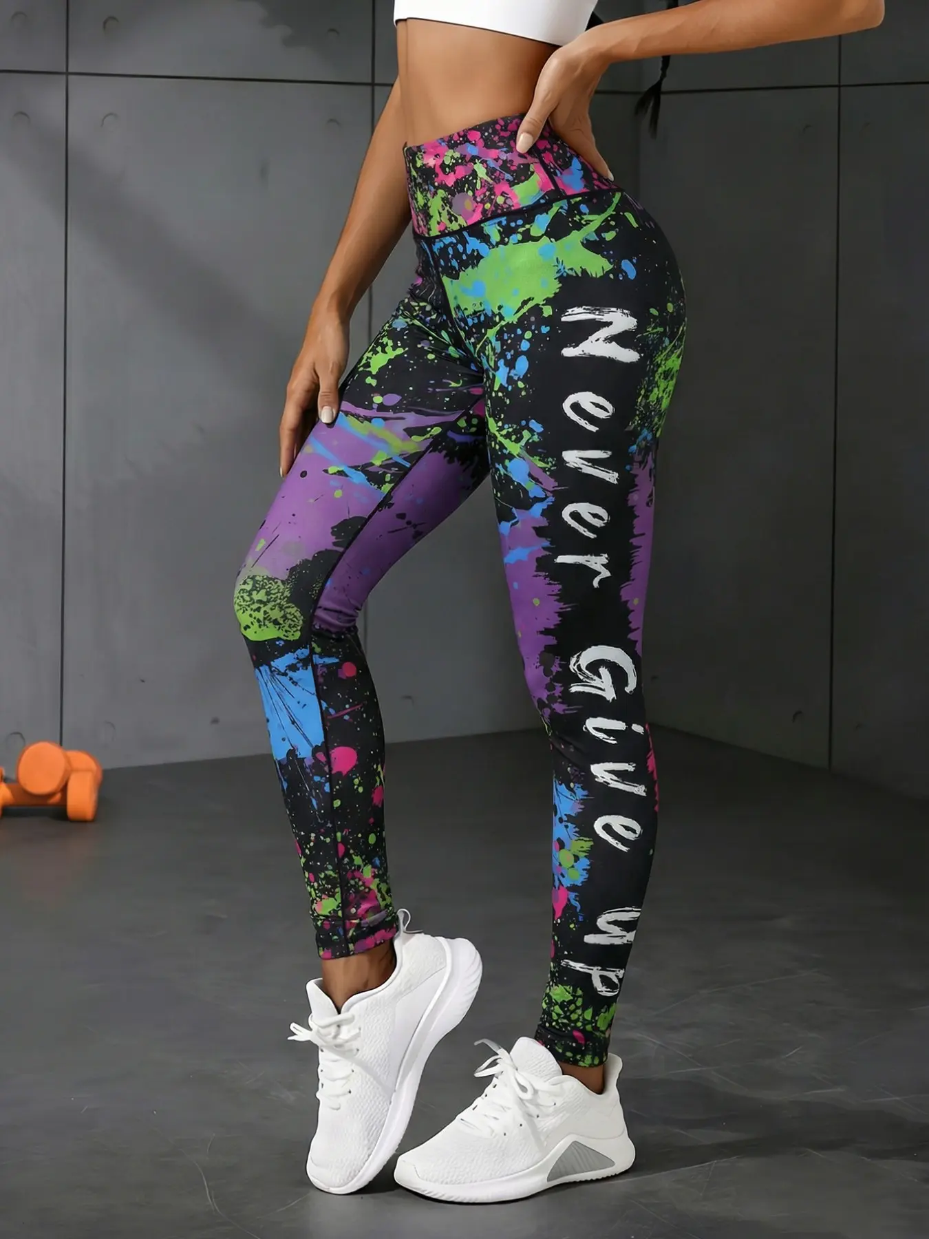 Women's Casual Sporty Yoga Pants, High Waist Butt Lifting Tight Fit, Multi-Color Never Give Up Letter Print Workout Leggings