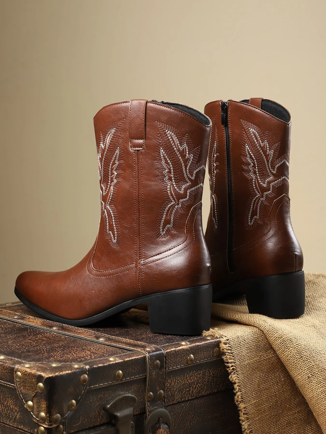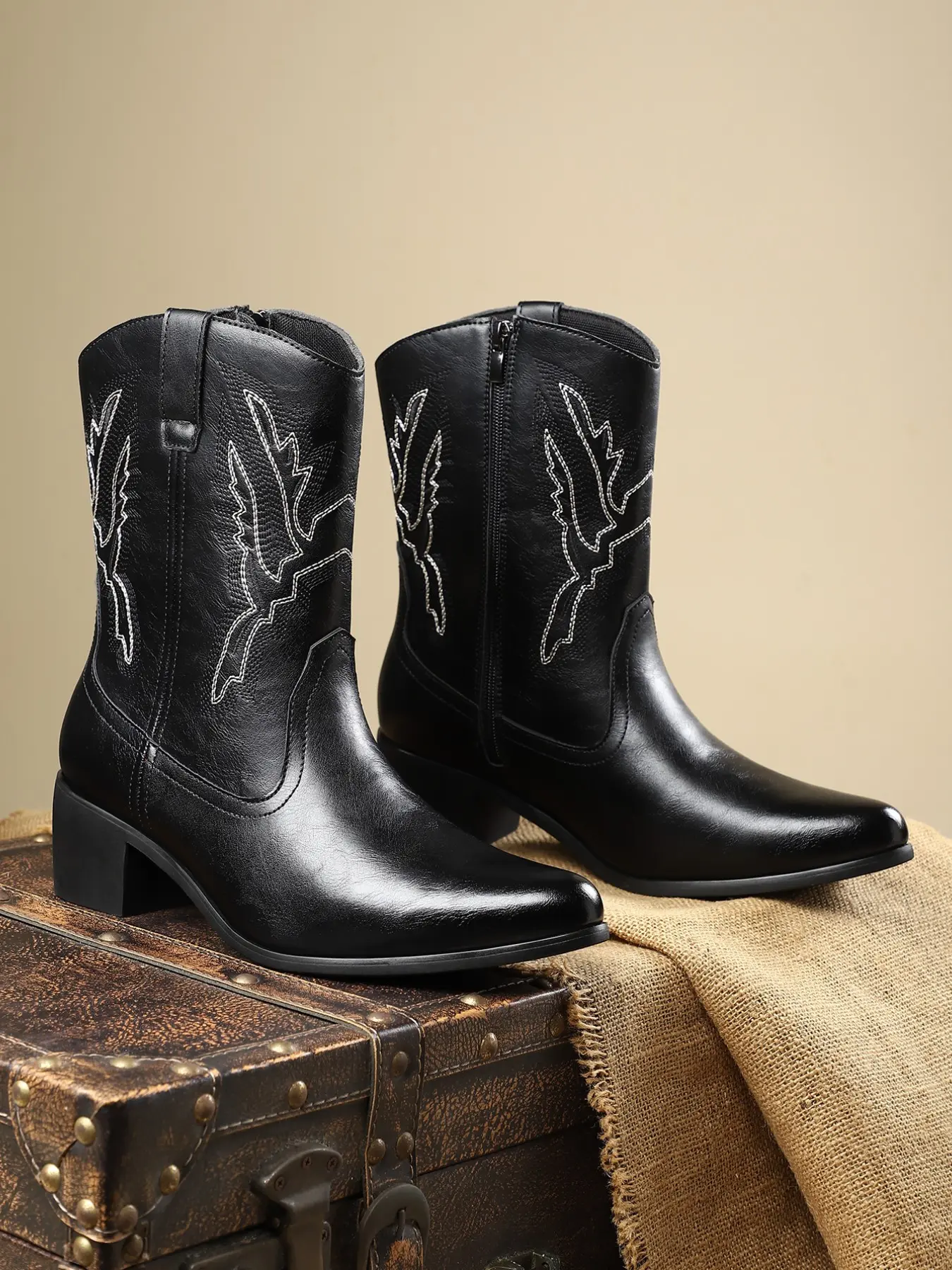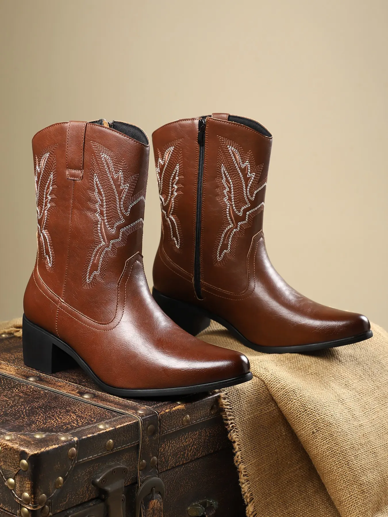 Men's Denim Boots Daily Embroidery Casual Low Heel Rubber Sole, Patchwork PU Upper, Mid-Calf Height, All Seasons Wear