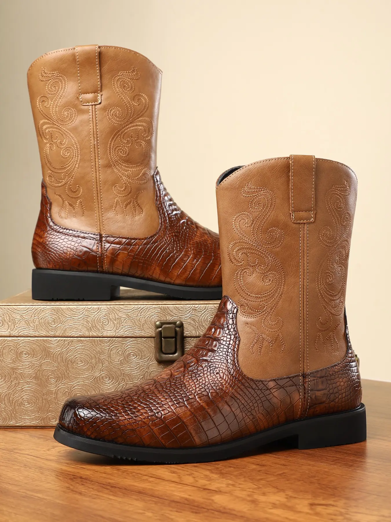 Men's Crocodile Pattern PU High-Top Boots, Casual Rubber Sole Shoes, Mid-Calf Fashion Footwear for All Seasons