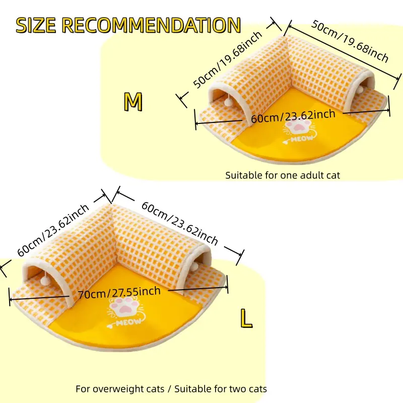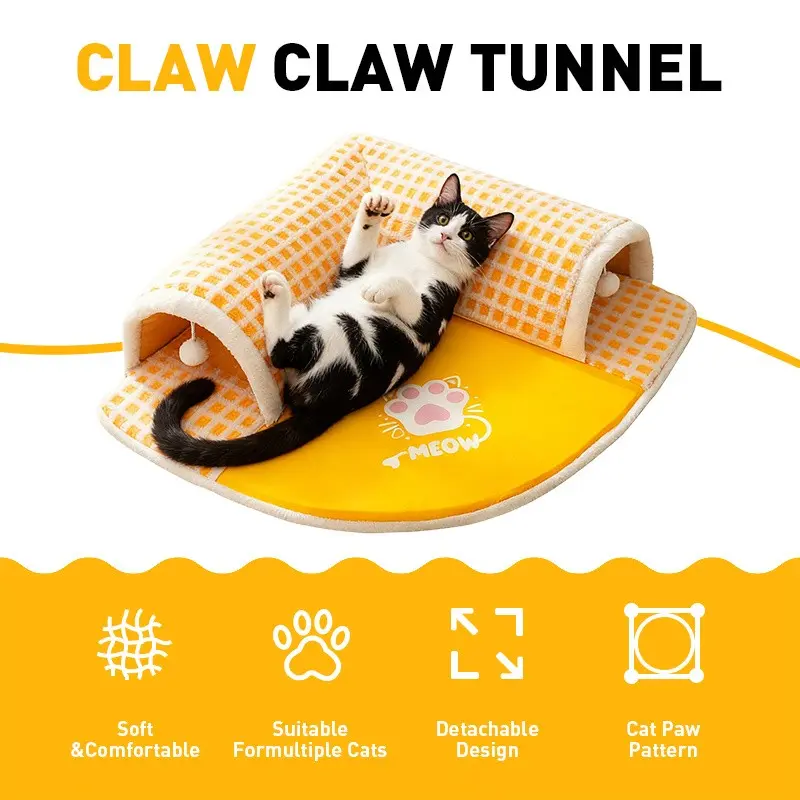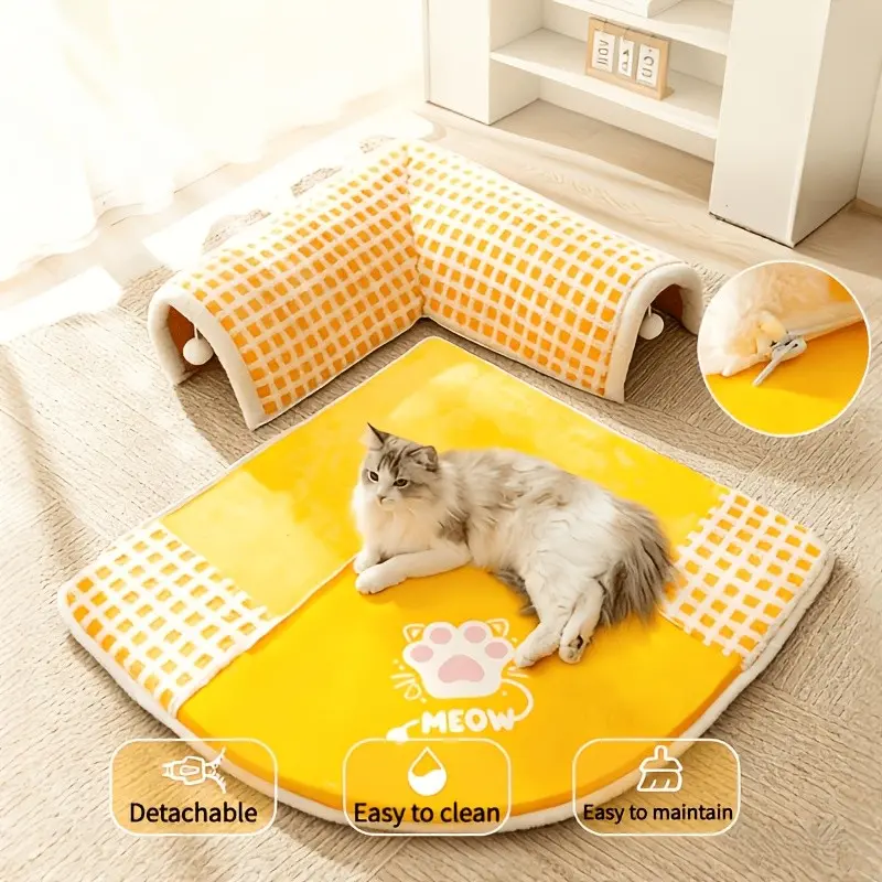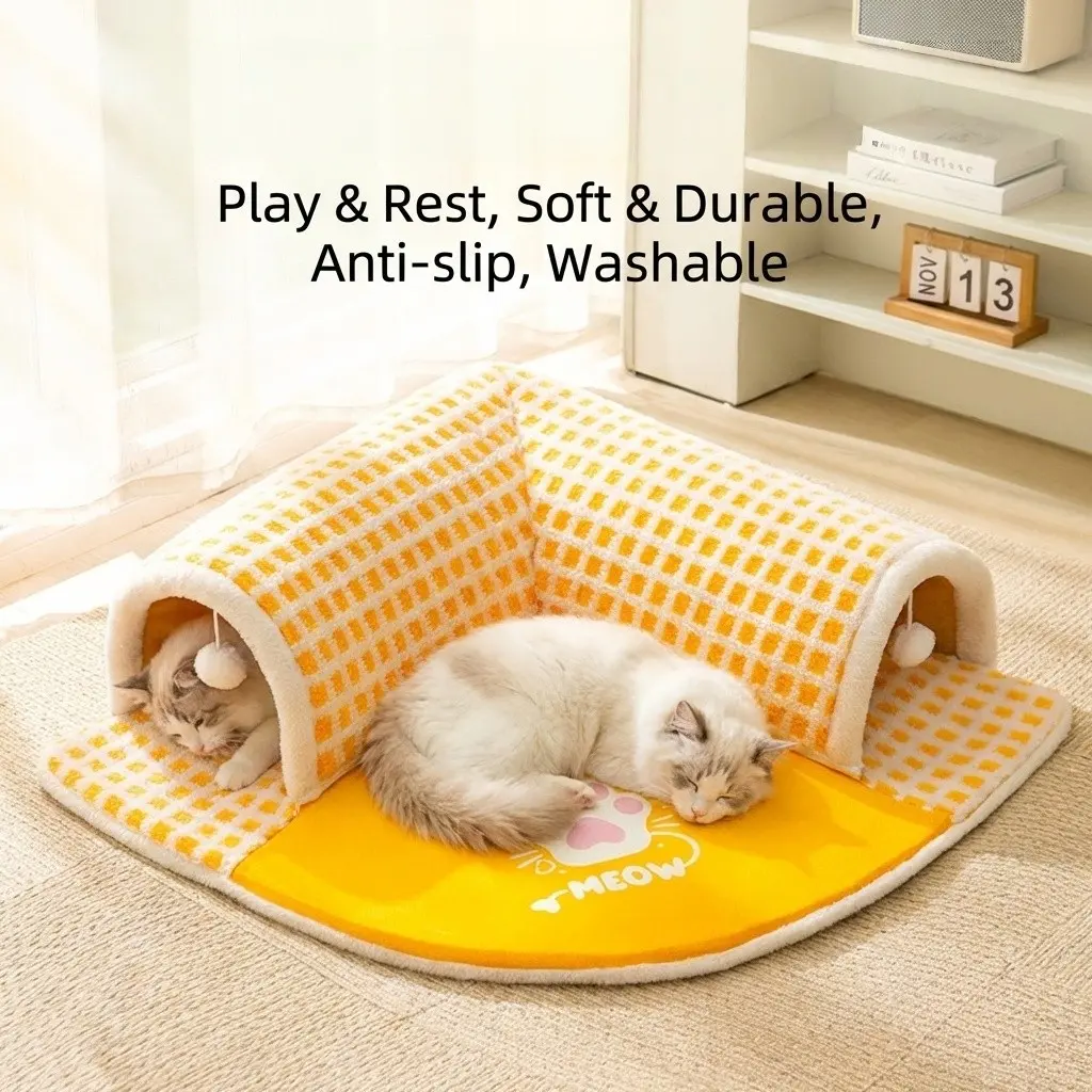 A: It’s a 2-in-1 design! It works as both a soft plush rug for napping and a cozy tunnel for hiding/playing. Your cat gets a comfy lounge spot and an adventure zone in one adorable setup—no need to buy separate items.