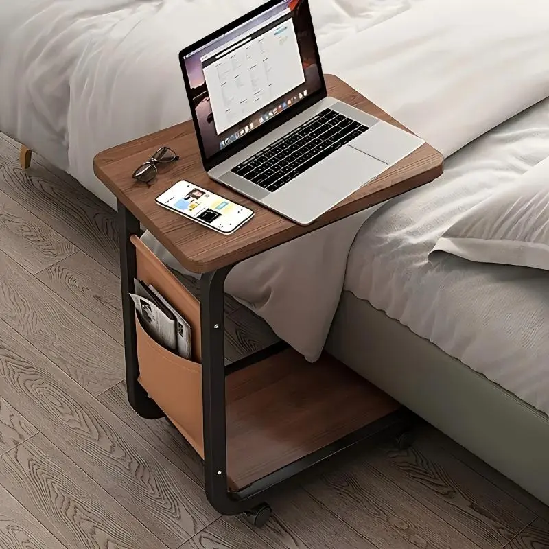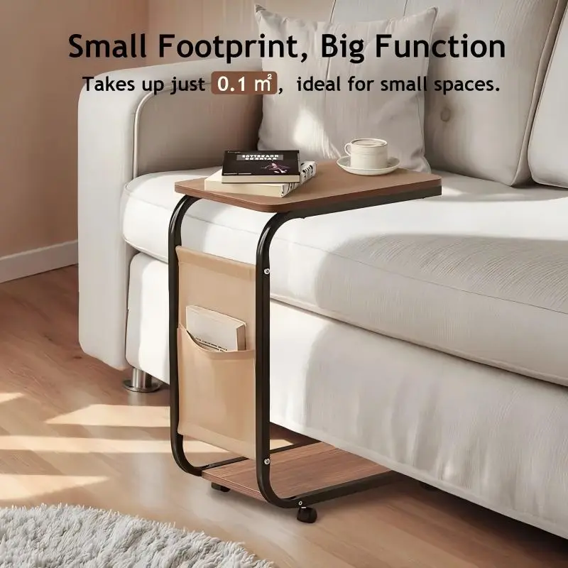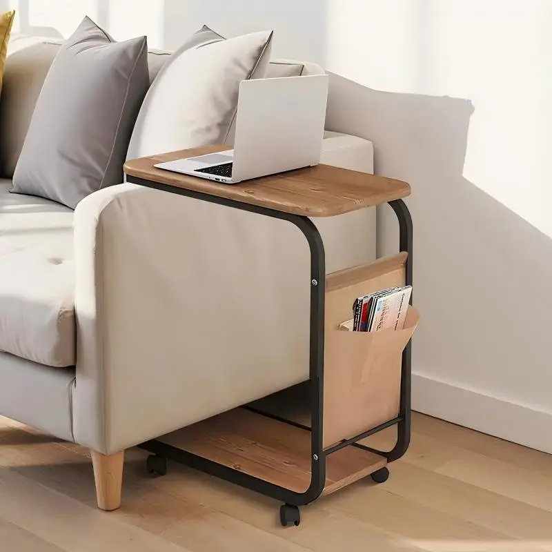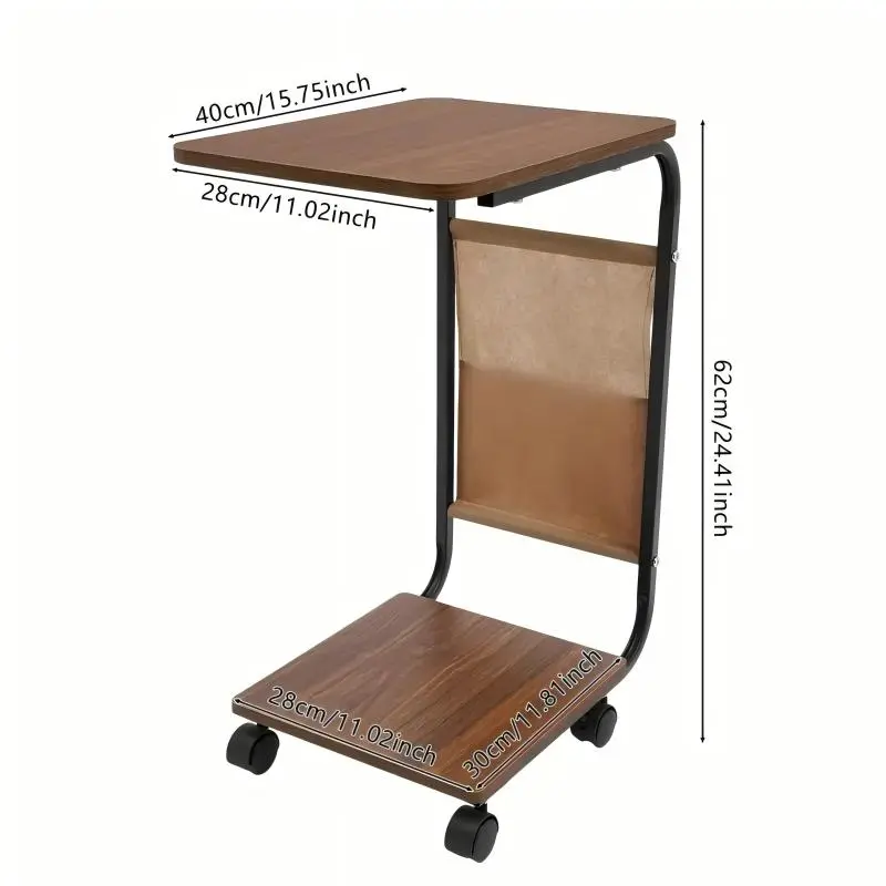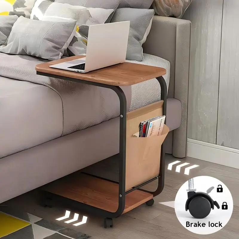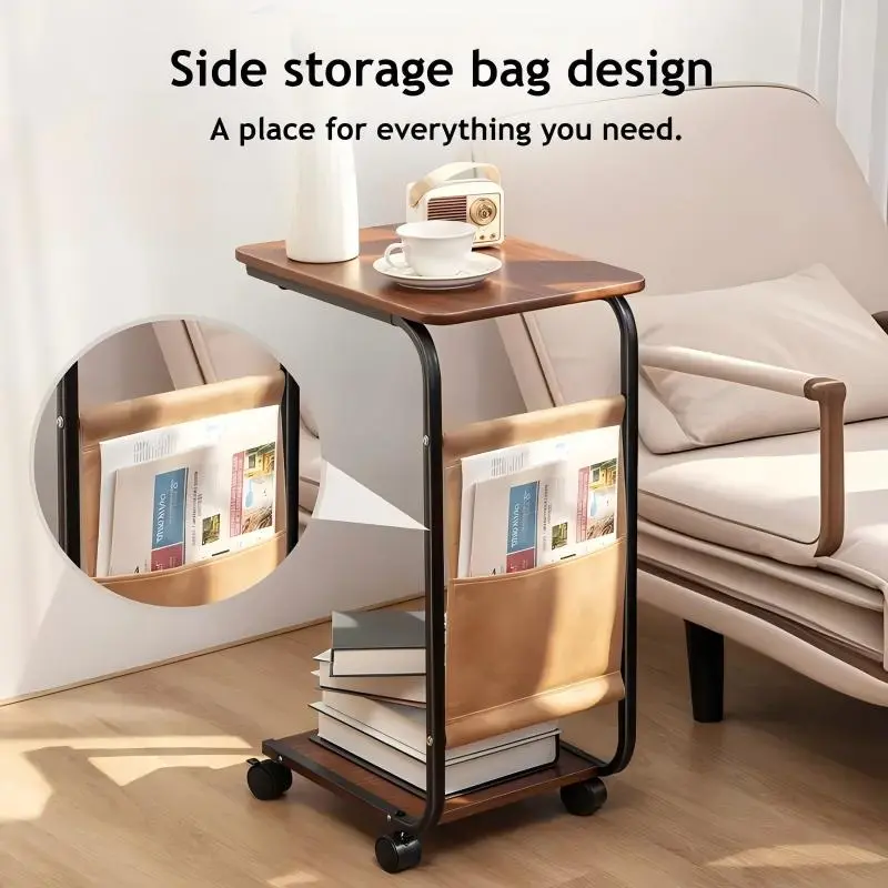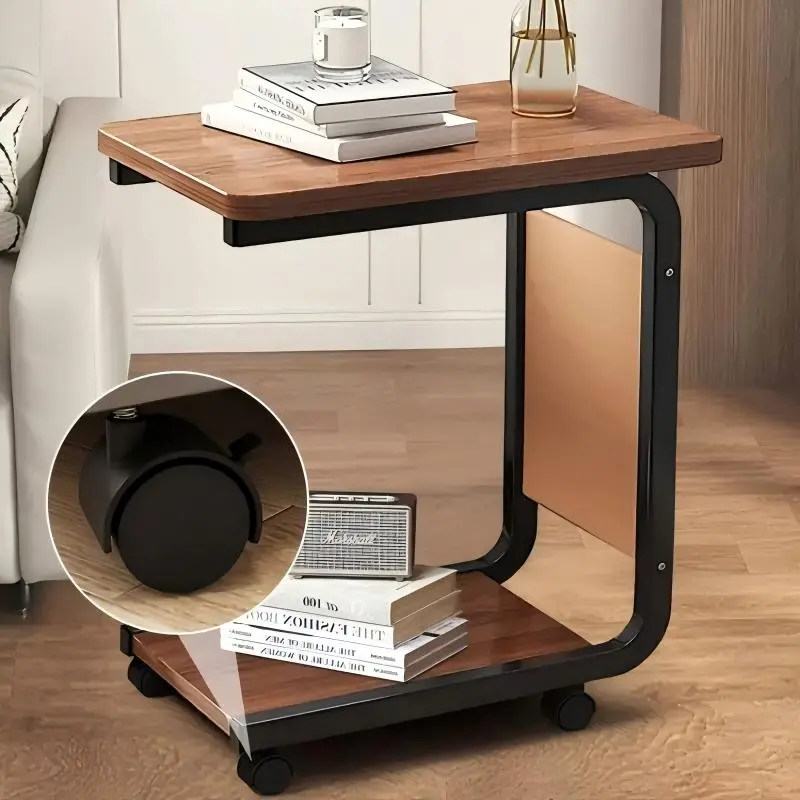 A wheeled double-layer storage sofa side table, coffee table and bedside sofa. With a sturdy metal frame, it saves space and is easy to move. It has 360° rotatable C-shaped wheels for the living room sofa side table and coffee table