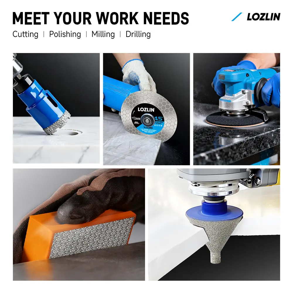 The LOZLIN 17PCS Diamond Tool Kit is ideal for tile projects. It includes diamond drill bits, saw blades, polishing pads, a hand pad, chamfer drill, and milling bits. This kit is designed for cutting and grinding porcelain, glass, marble, quartz, and ceramic. Each tool is precision-engineered for specific tasks, ensuring efficiency and accuracy.