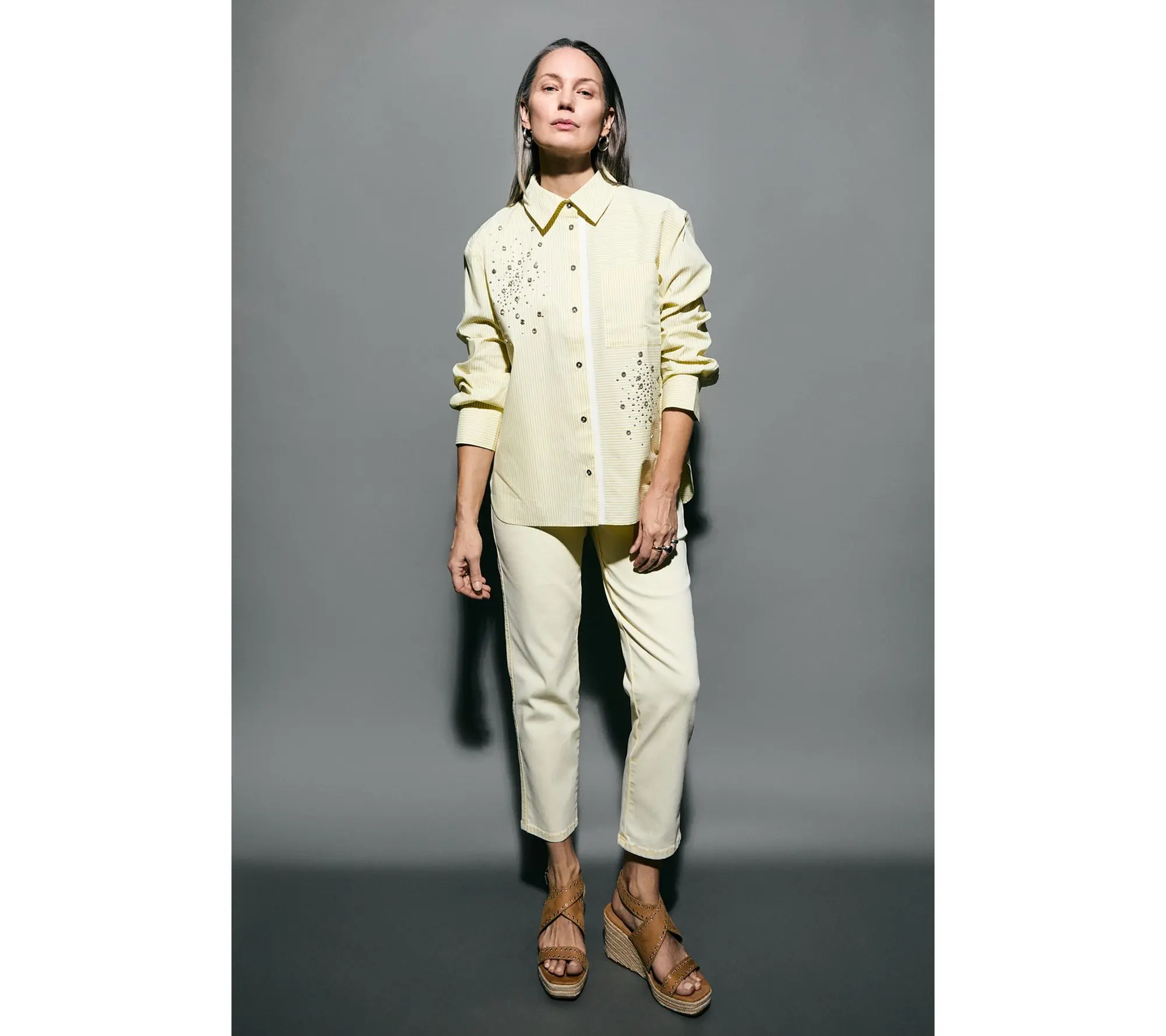Woven. Features: Classic five pocket denim styling w. finctional zip fly and tack button closure. Self belt loops, and back yoke. Turnback hem. Fit: Fitted; Cut to follow the lines of the body. Inseam: 27" Rise: At Waist. Leg Shape: Straight Content: 71% Cotton, 19% Polyester, 8% viscose , 2% spandex Care: TGIO/MWCSIMDGC/ONCBWN/HTD/WIORIN COO: Imported (S)