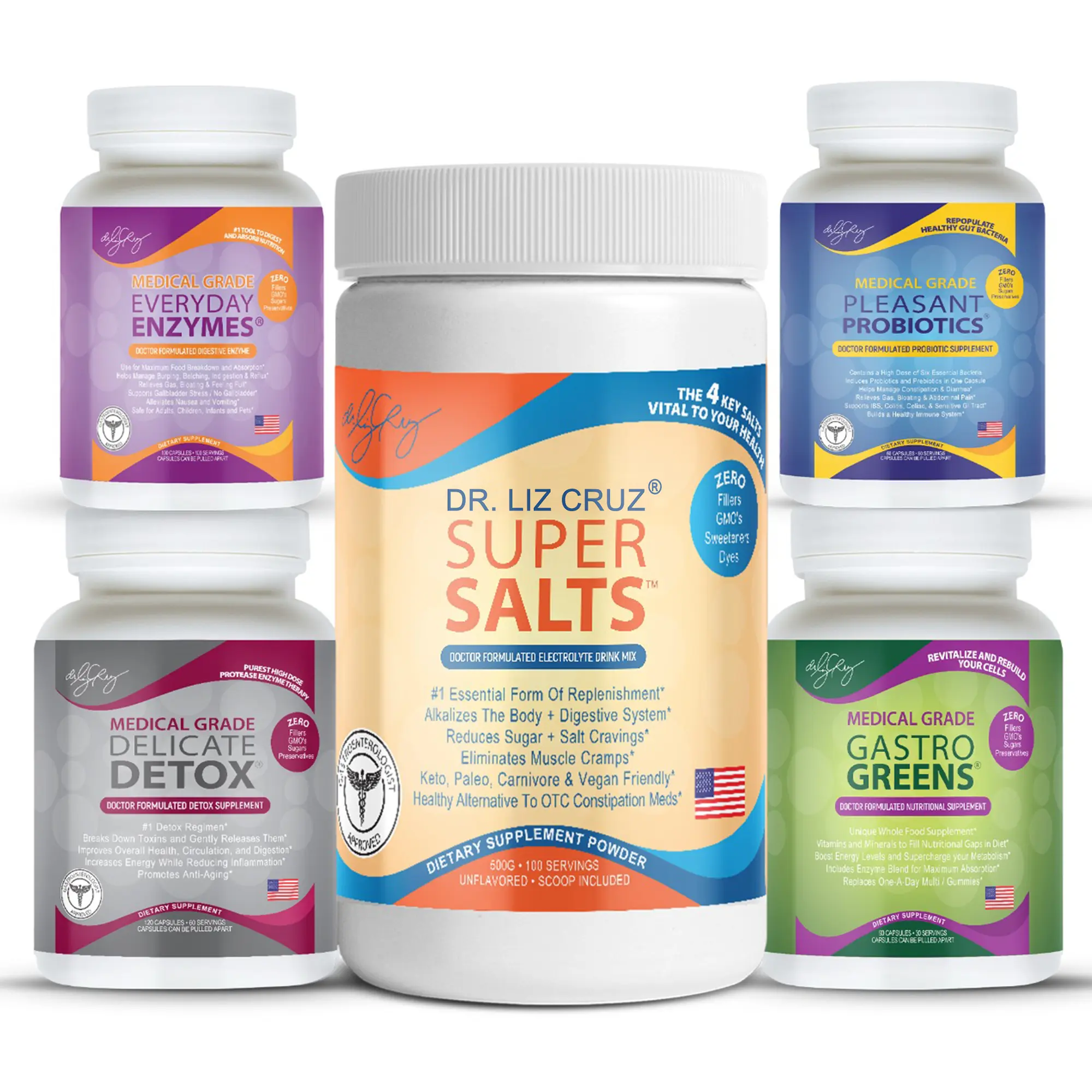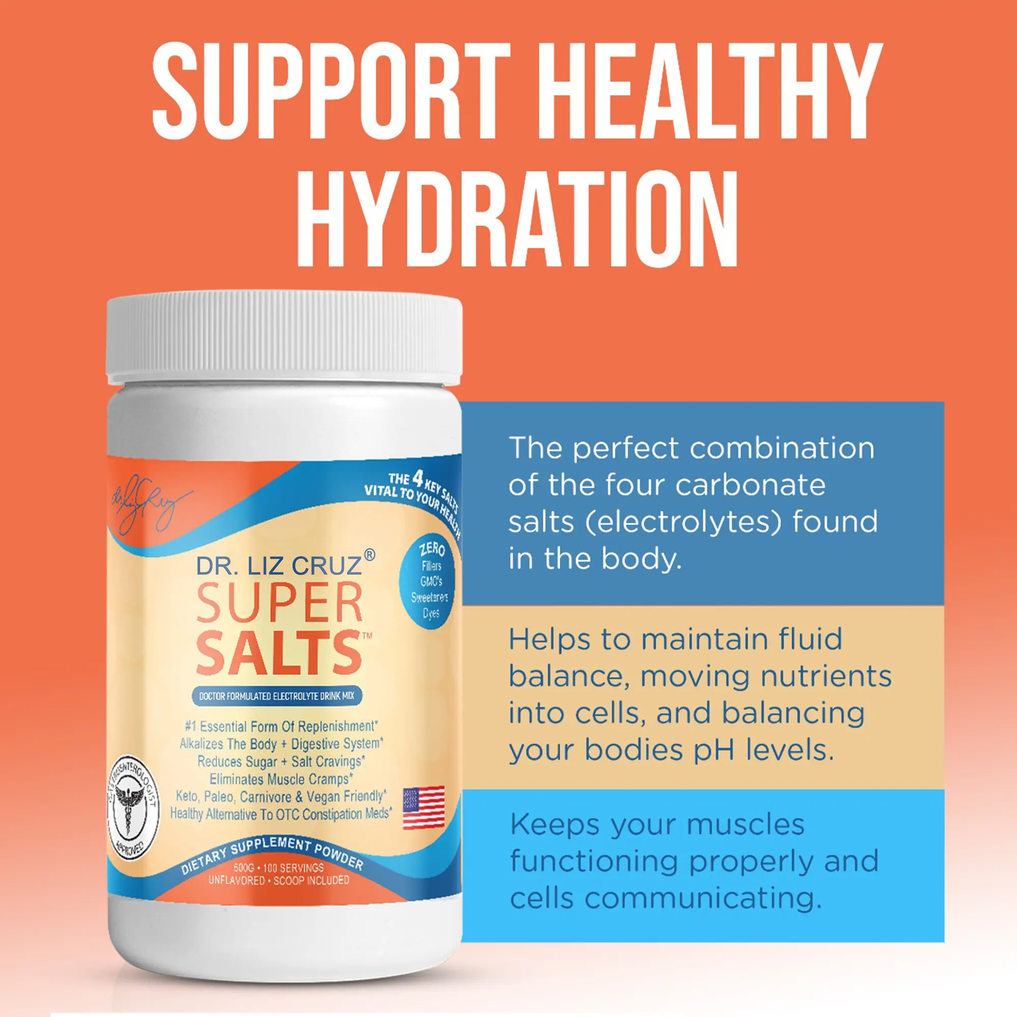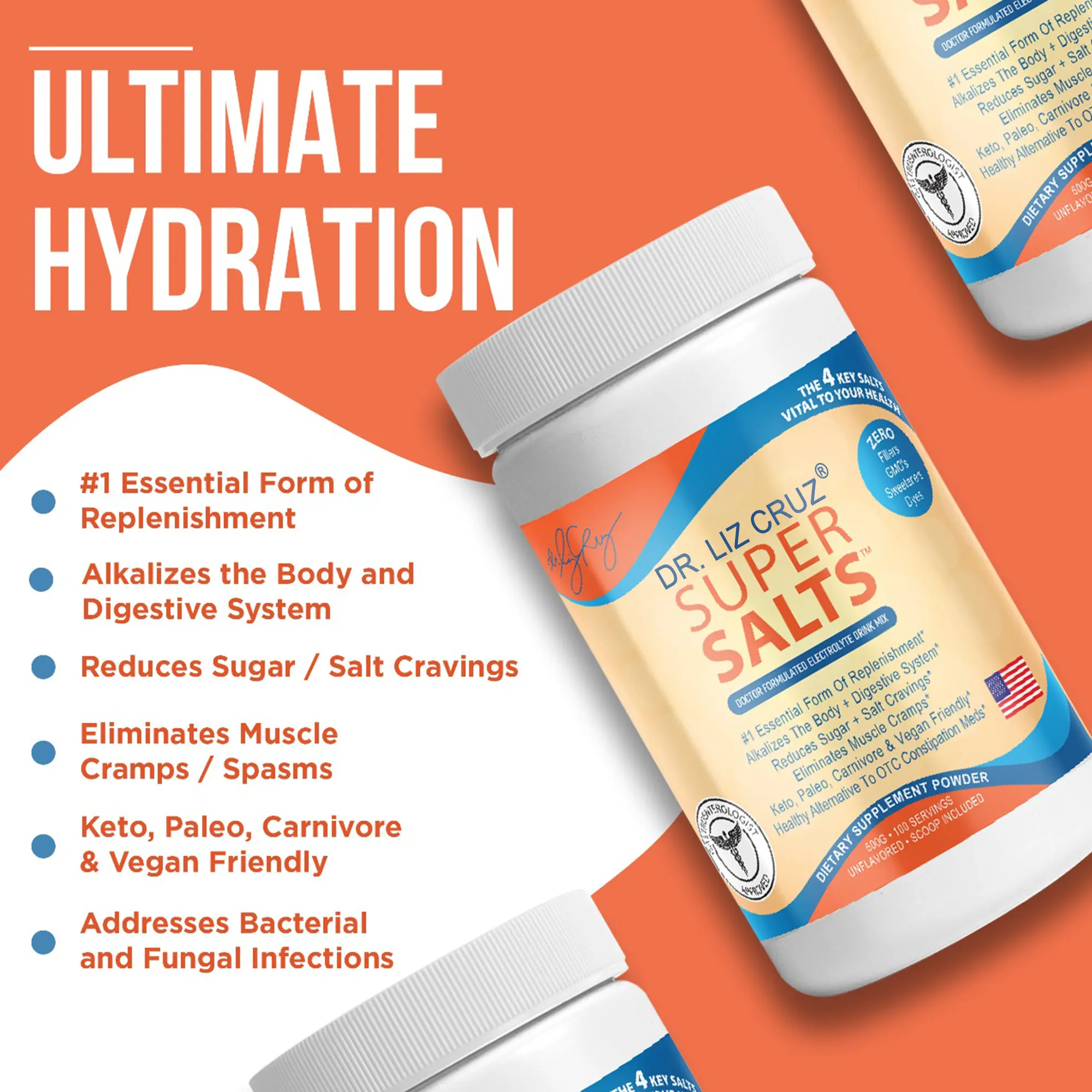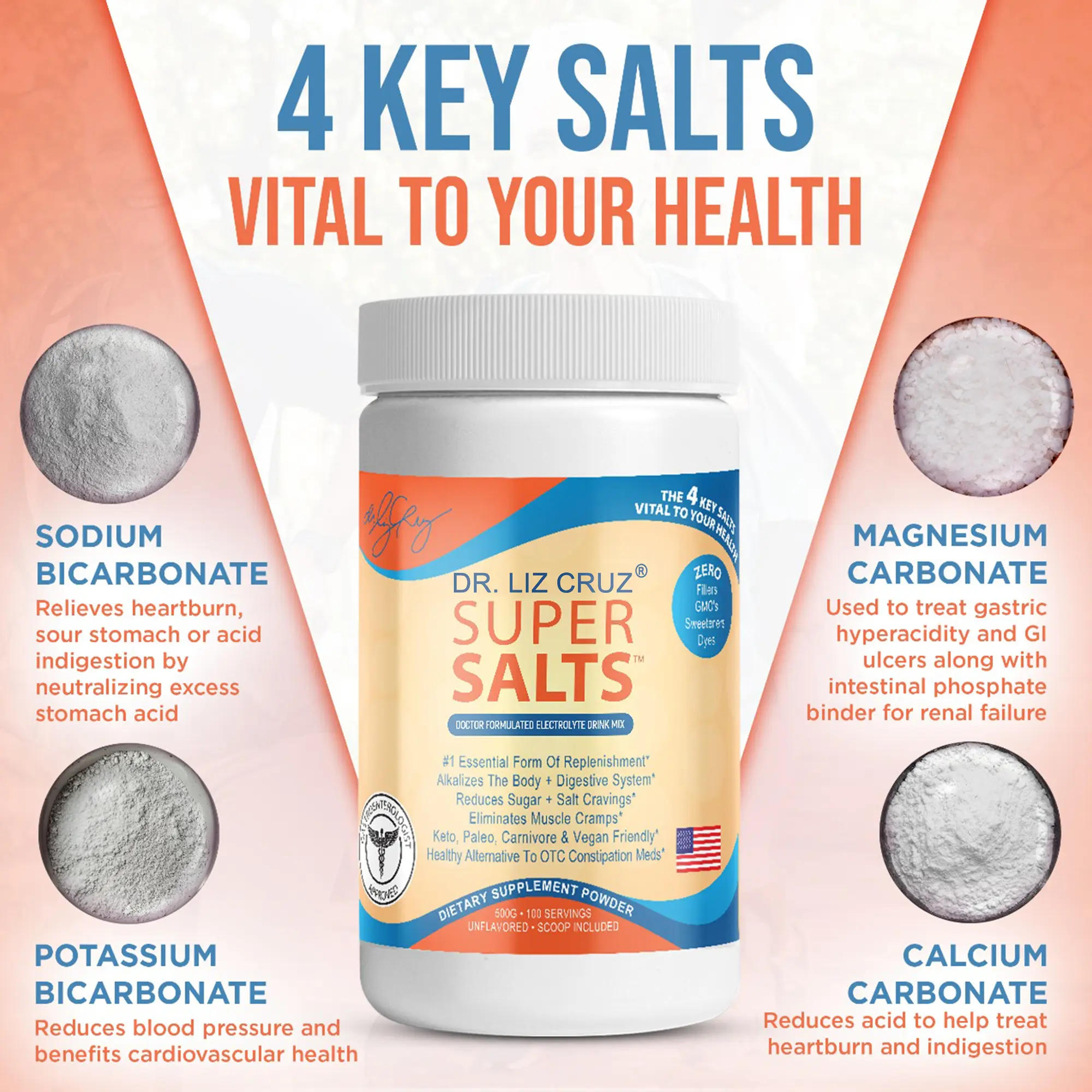 Dr. Liz Cruz™ Super Salts™ is the "ultimate" antioxidant, anti-bacterial, anti-fungal, anti-inflammatory, anti-carcinogenic and anti-aging salts. It contains the four key salts that are made up in the body allowing the body to replenish exactly what it is losing.