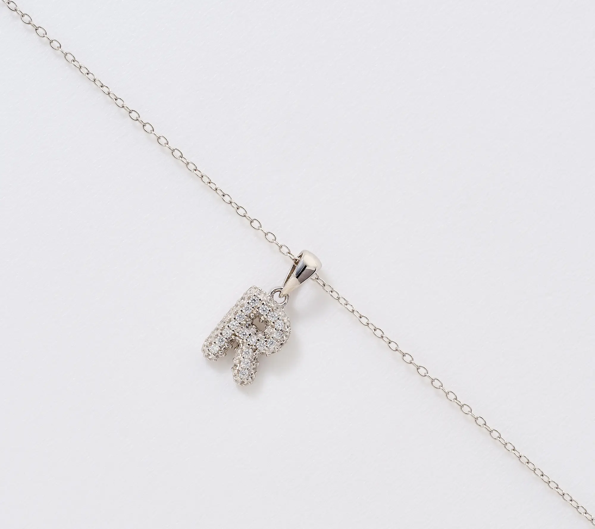 Sterling silver pave CZ bubble initial necklace from Diamonique. Item comes in sterling silver with rhodium plating, and in all letters. Each necklace measures 18"x 2/5" x 2/5" and contains 36 CZ stones. This is an imported item with a lobster closure and comes in a giftable box. 0.252ct (0.18 cttw DE)