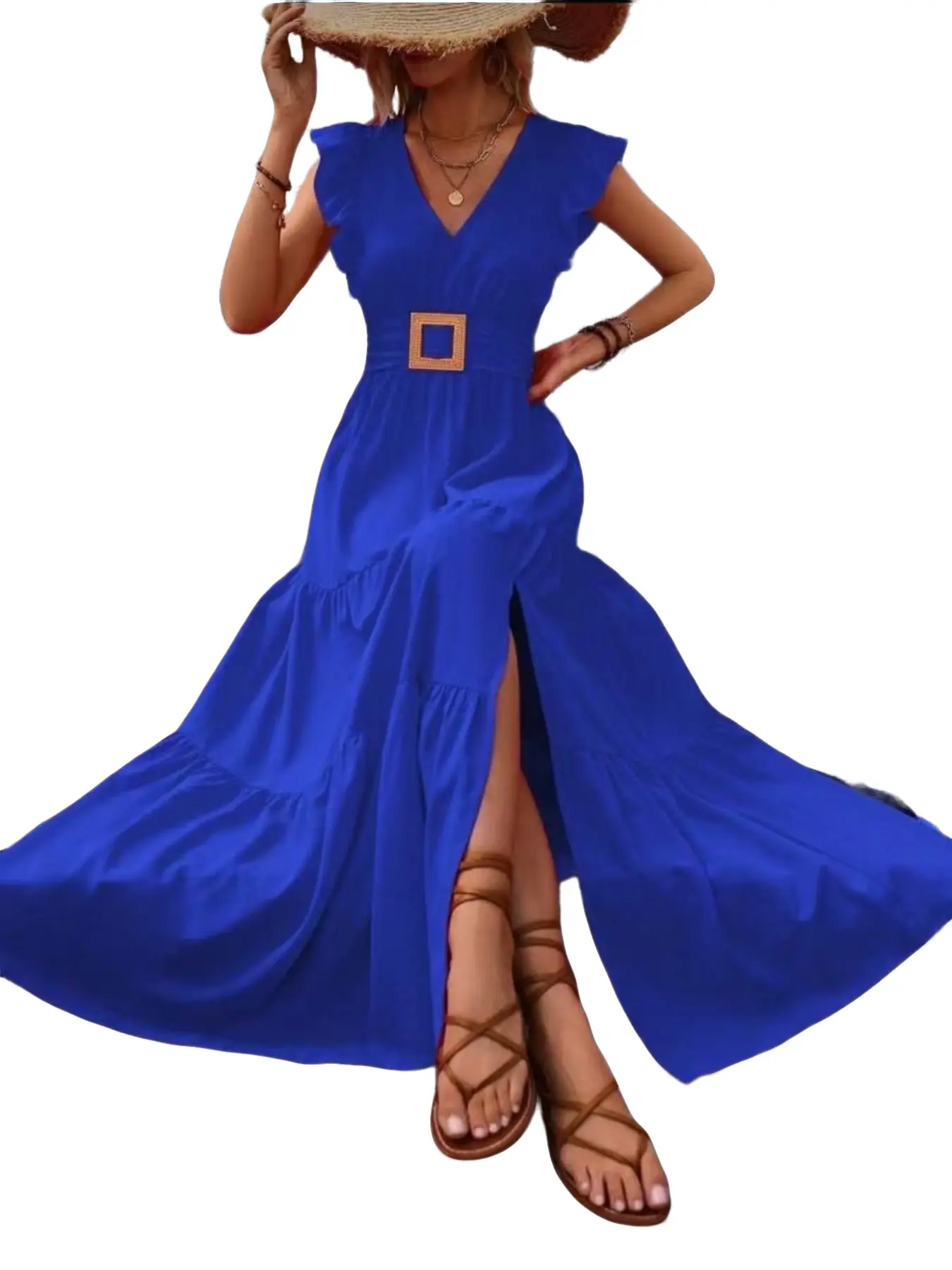 BTFBM Women's 2026 Summer Sleeveless Spaghetti Strap Maxi Dress V-Neck Cutout Slit Beach Party Dress with Pockets