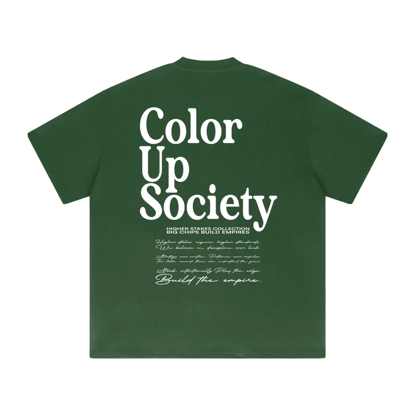 Color Up Society Manifesto T-Shirt Higher Stakes Collection Big Chips Build Empires Handwritten Script Front Chest Logo Back Design Short Sleeve Crew Neck Summer Casual Top - Menswear