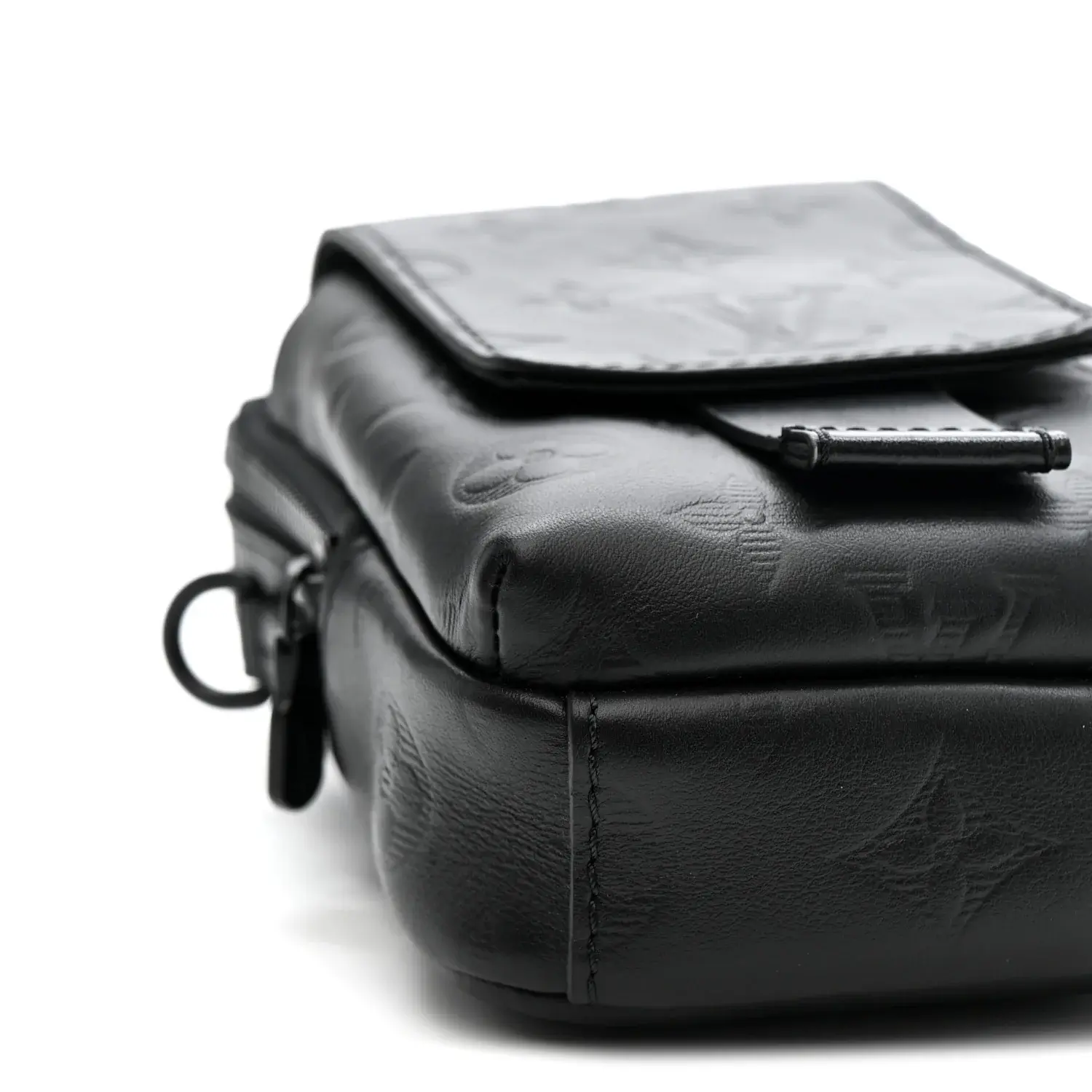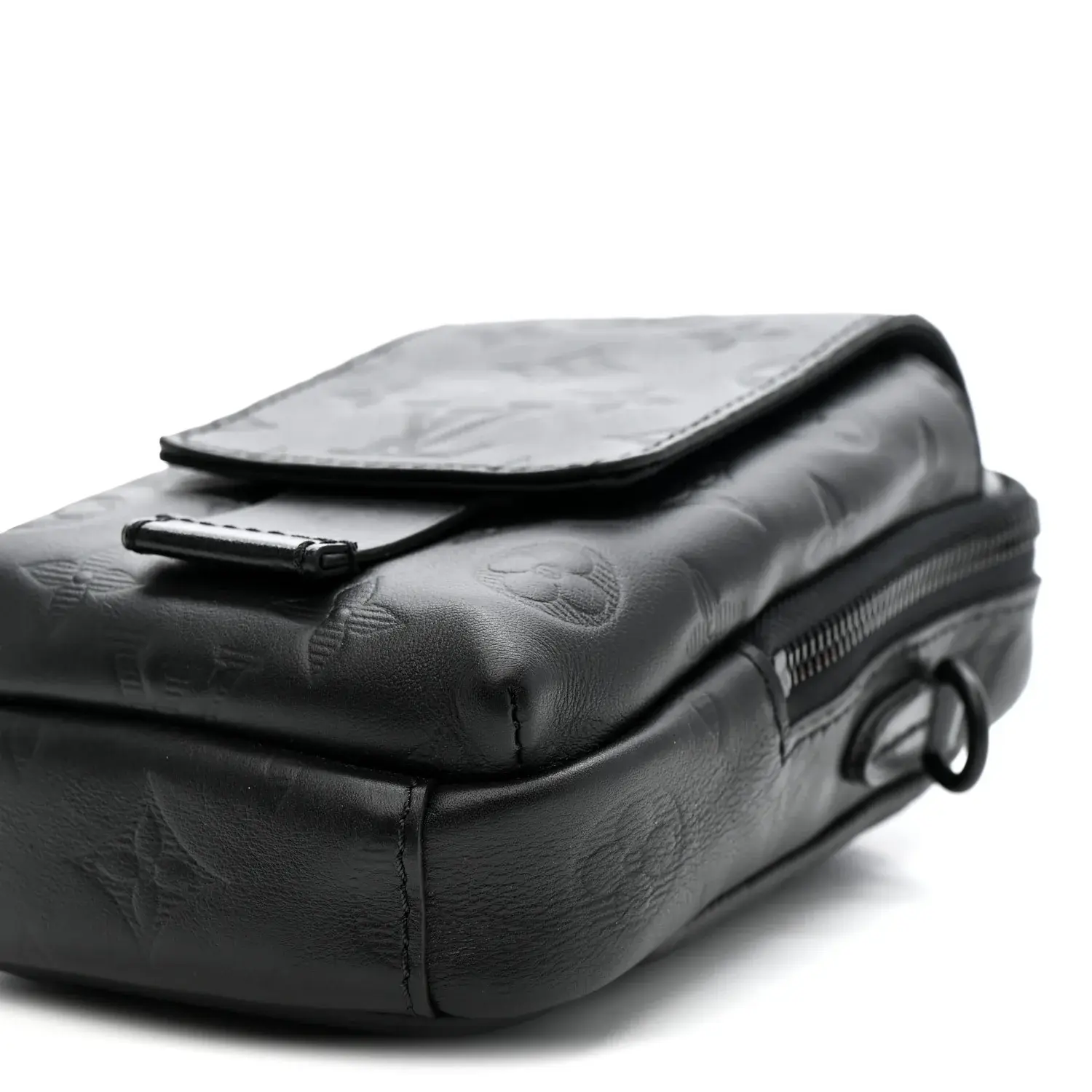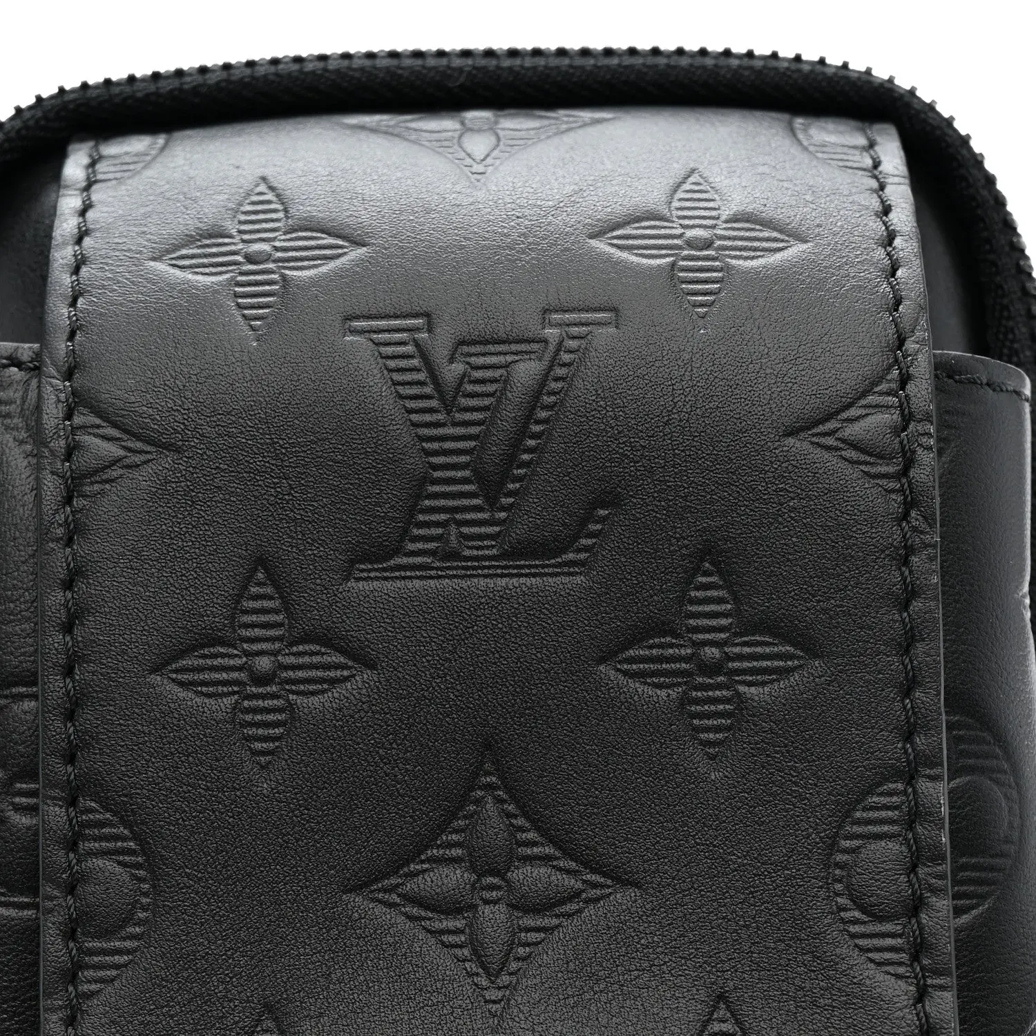 This is an authentic LOUIS VUITTON Calfskin Monogram Shadow Double Phone Pouch NM in Black. This stylish sling bag is expertly crafted of black monogram embossed calfskin leather. The bag features a black fabric shoulder strap and matte black hardware. The top zipper opens to a fabric interior.