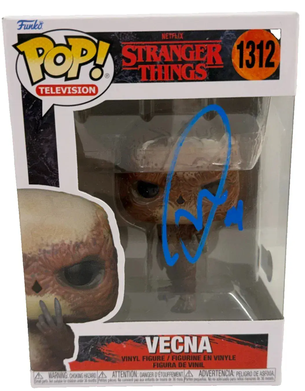 Jamie Campbell Bower signed this Vecna Stranger Things Funko Pop figure #1312. Bower plays Henry Creel — the original test subject who became Vecna, the season four villain whose connection to the Upside Down rewrote everything the audience understood about the show's mythology. It was a breakout performance that required Bower to play both the gentle, manipulative young Henry and the grotesque, terrifying Vecna, and his casting as the season's central antagonist paid off completely. The Vecna Funko is one of the most striking figures in the Stranger Things Pop series, and Bower's signature makes it a premium collectible.