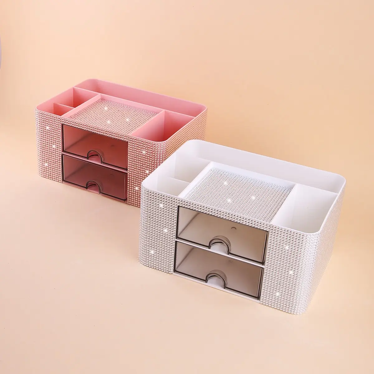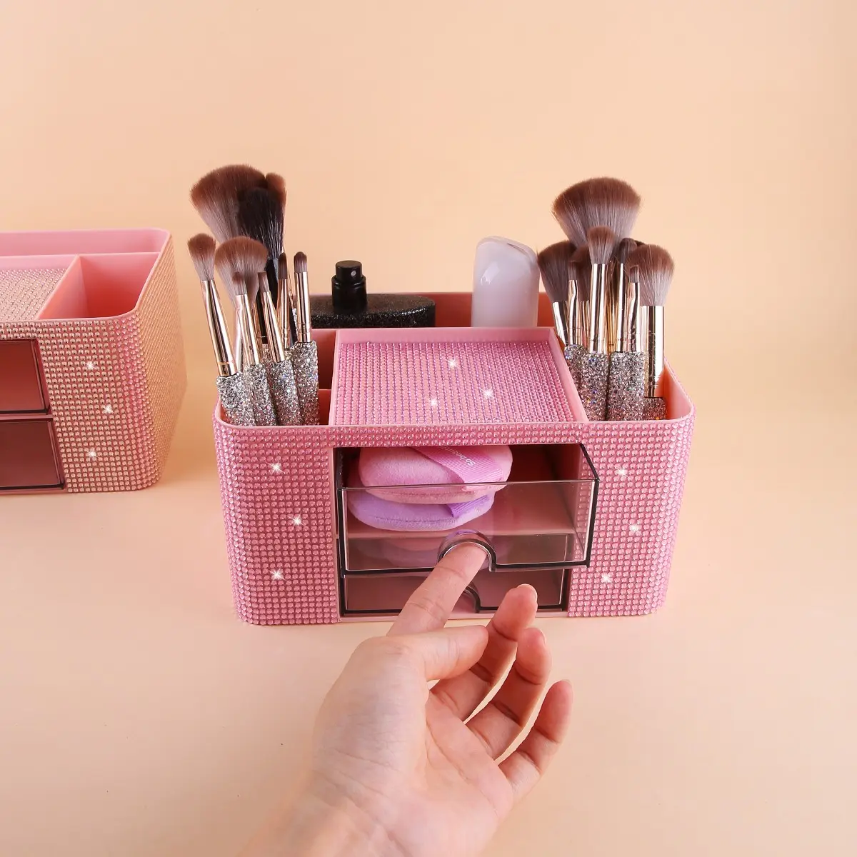 Diamond Embellished Storage Box with Drawer, Multi-Compartment Design, Makeup Brush Organizer, Cosmetic Holder, Bedroom Vanity Tray