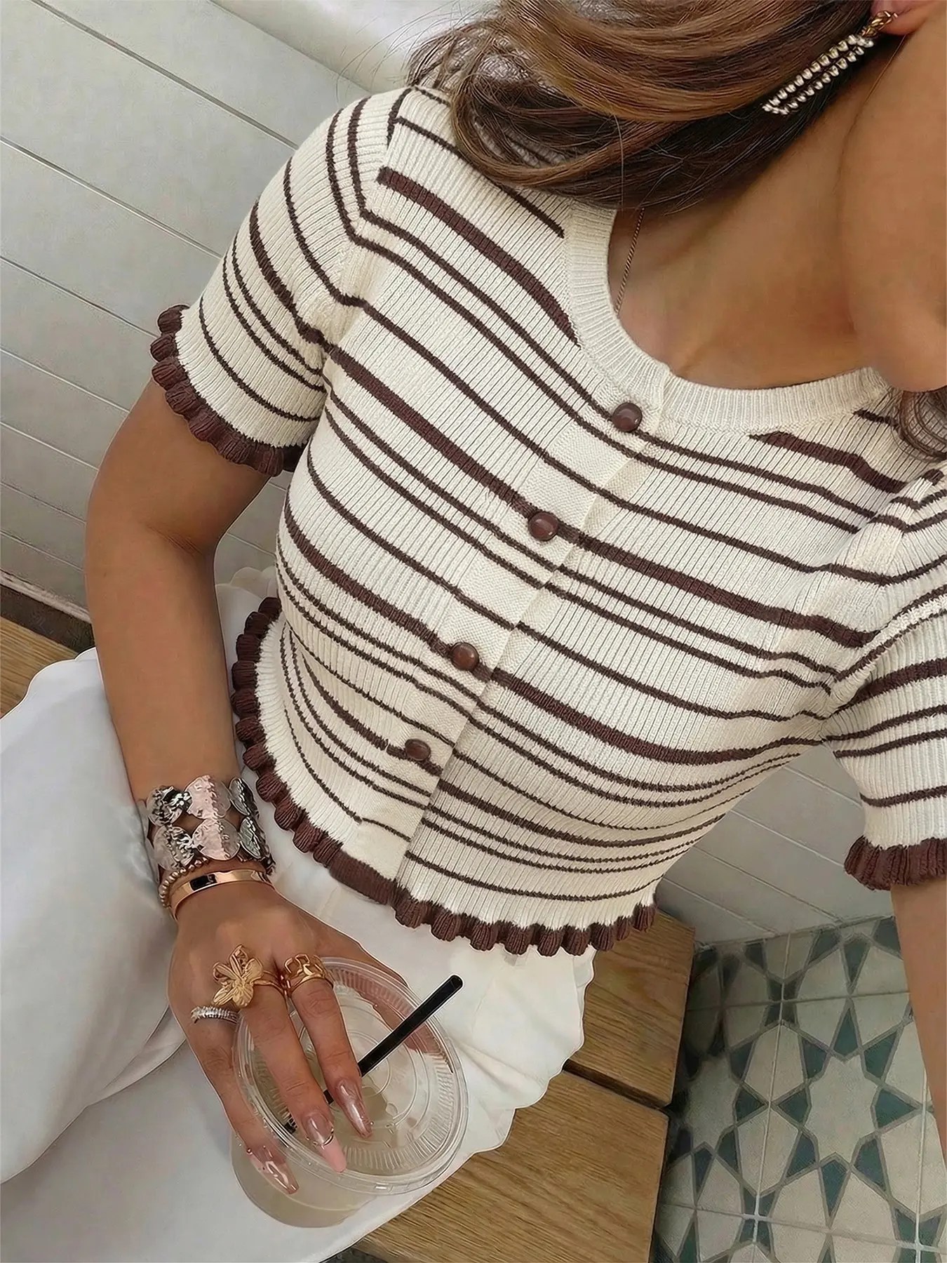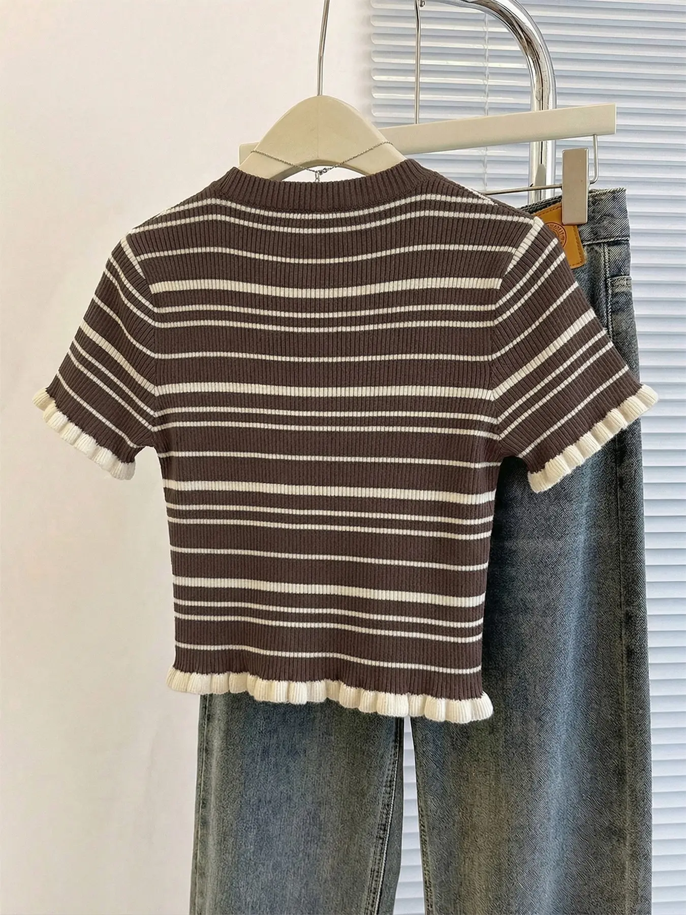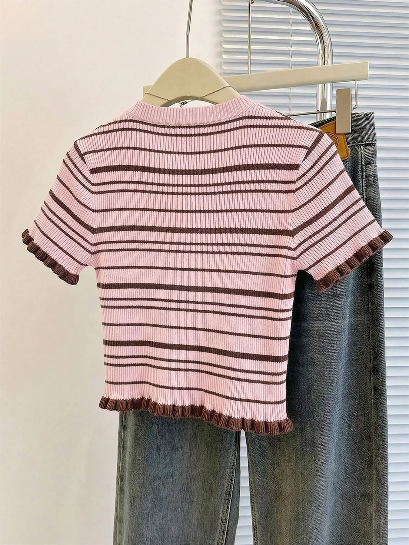 Women's spring and summer striped color-block short-sleeve round-neck knitted vest. The ruffled hem adds a touch of elegance and fashion. This delicate and stylish sweater is perfect for photo-taking, daily wear, or leisurely walks.