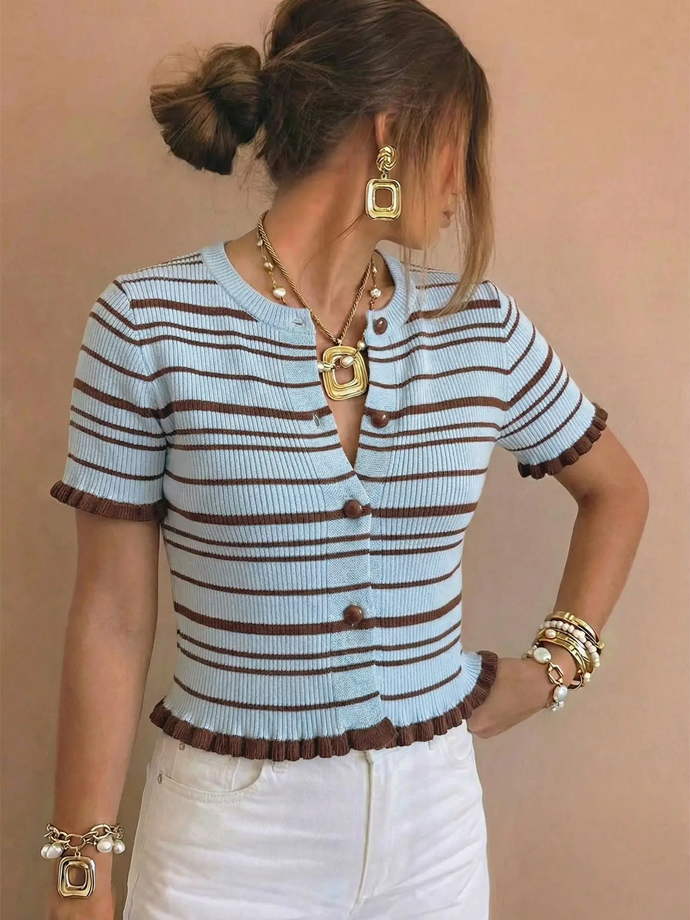 Women's Spring & Summer Striped Color Block Short Sleeve Knit Vest, Ruffled, Elegant Hemline, Perfect for Photoshoots, Daily Wear, Casual Strolls