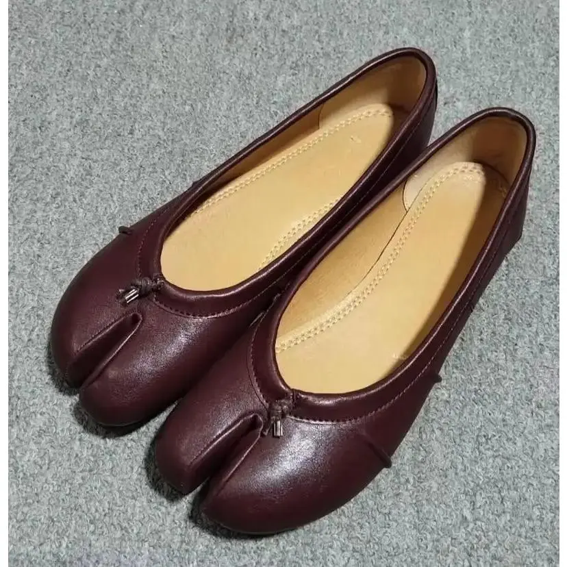The New Soft Leather Split Toe Women Tabi Ballet Flats are the epitome of comfort and style.These flats are crafted from premium artificial leather, offering a durable and supple feel that molds to your foot's contours.The slip-on closure ensures a secure fit that is both convenient and fashionable, making these flats a staple in any woman's wardrobe.The round toe design provides ample toe room, allowing for a comfortable and relaxed stride.