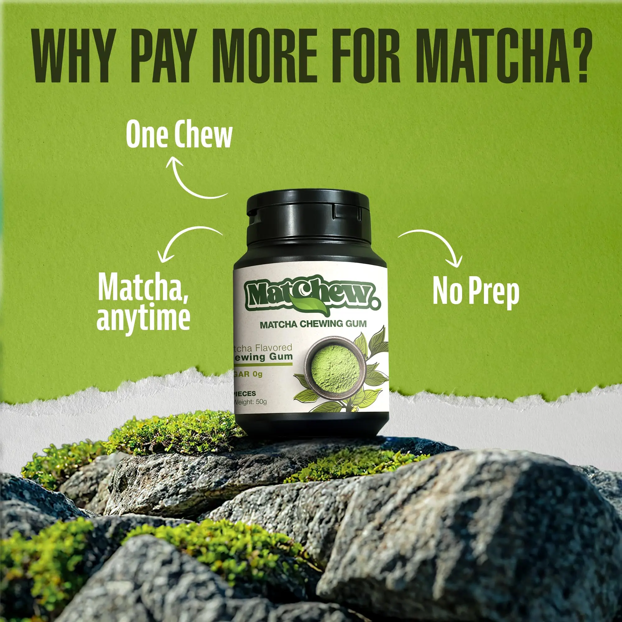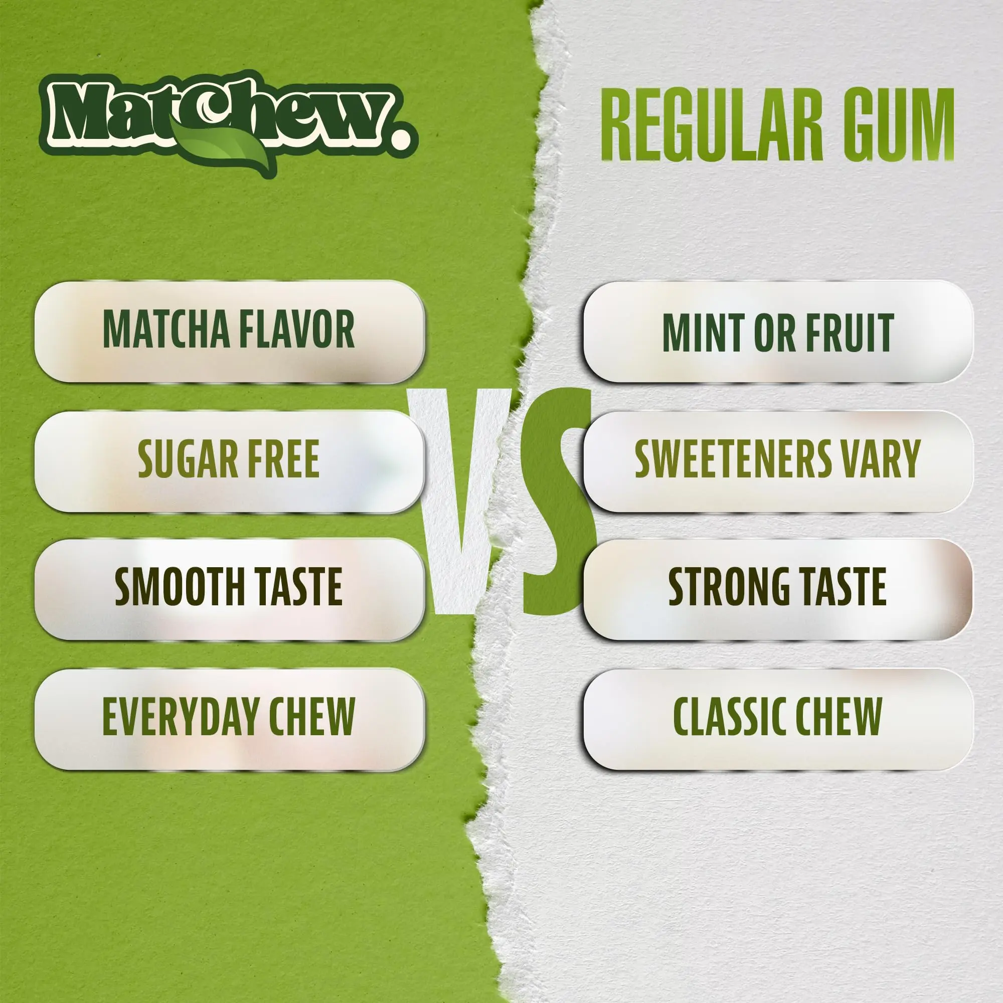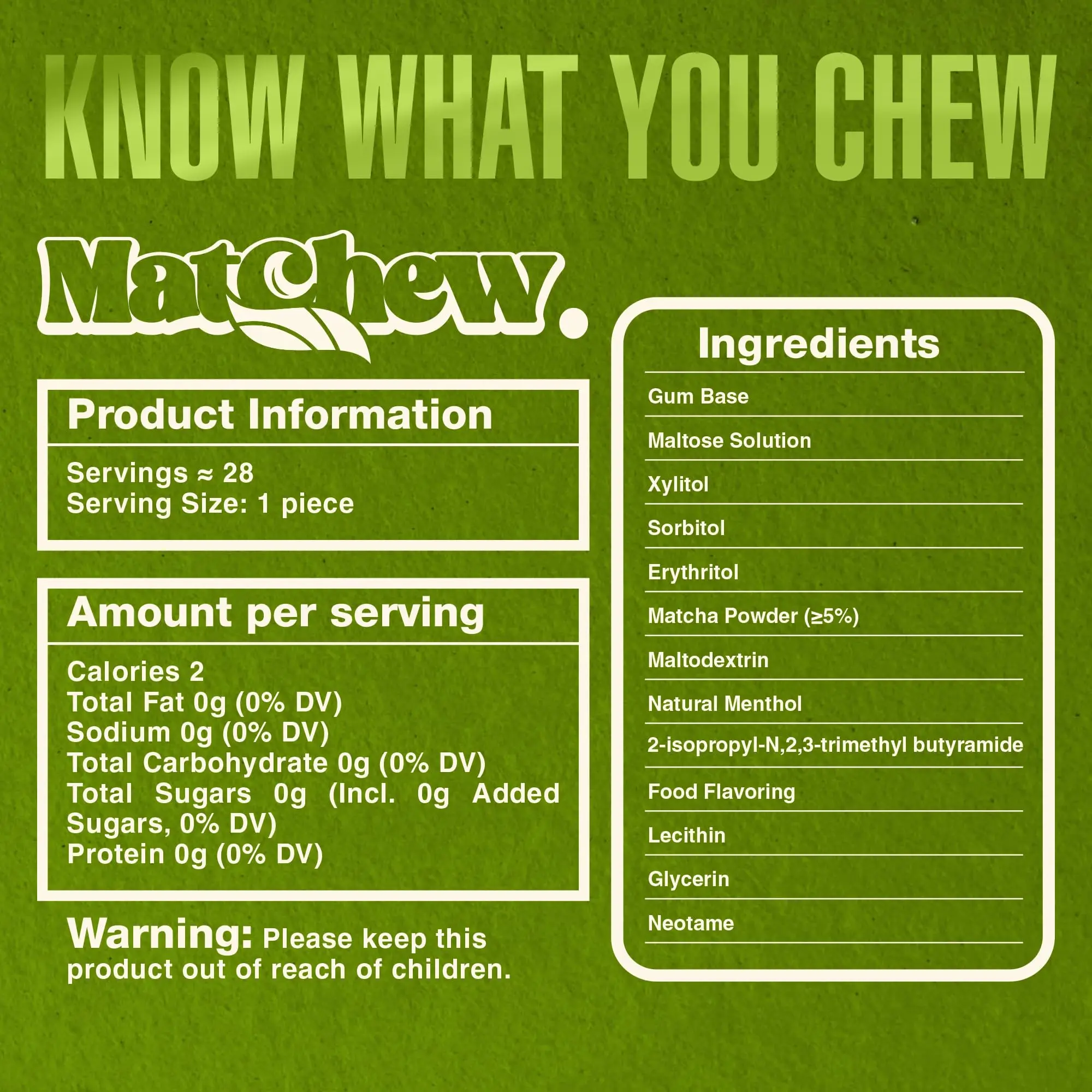 Matchew is a matcha-forward chewing gum made with remineralizing, oral-friendly ingredients, offering a cleaner alternative to synthetic gum. The focus is the flavor — smooth, real matcha with an earthy, refined taste that lasts. Each piece offers a long-lasting, invigorating taste and a cool, minty burst that keeps breath feeling fresh throughout the day.With zero sugar and only 2 calories per piece, it's a great low-calorie option for keto, low-carb, or everyday mindful enjoyment—providing a cleaner alternative to gums with artificial sweeteners or fillers. Crafted with authentic matcha powder in a gluten-free, non-GMO formulation free from artificial additives, it's ideal for those preferring natural, plant-based chewing choices. The convenient pocket-sized box holds 28 pieces, perfect for on-the-go refreshment after meals, during work, or anytime you want a quick flavor lift. Enjoy the balanced depth of premium matcha paired with cool mint in every chew—a sophisticated, everyday indulgence for a fresh and focused feel.