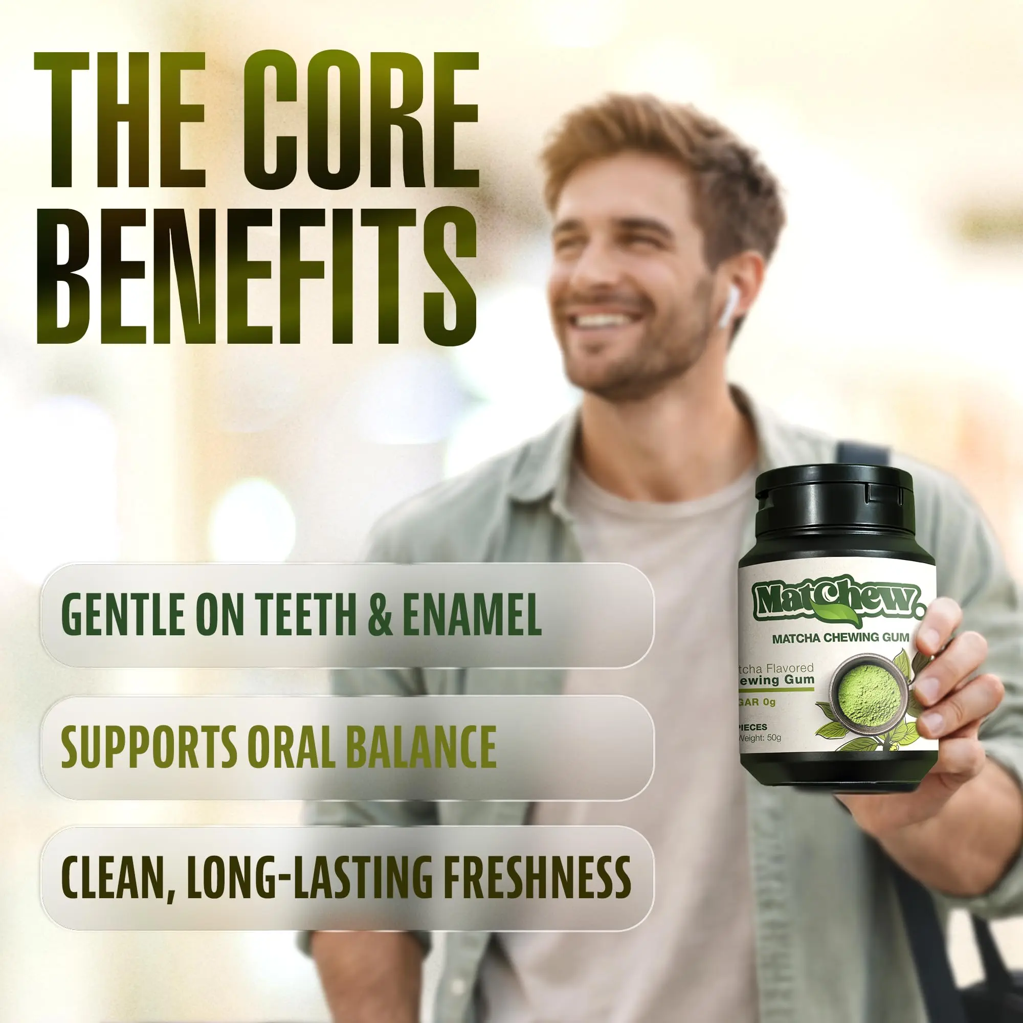 Premium Matcha Powder Infused Gum — Enjoy the smooth, earthy taste of real premium matcha green tea powder combined with refreshing mint, delivering a long-lasting, invigorating chew and naturally fresh breath experience.