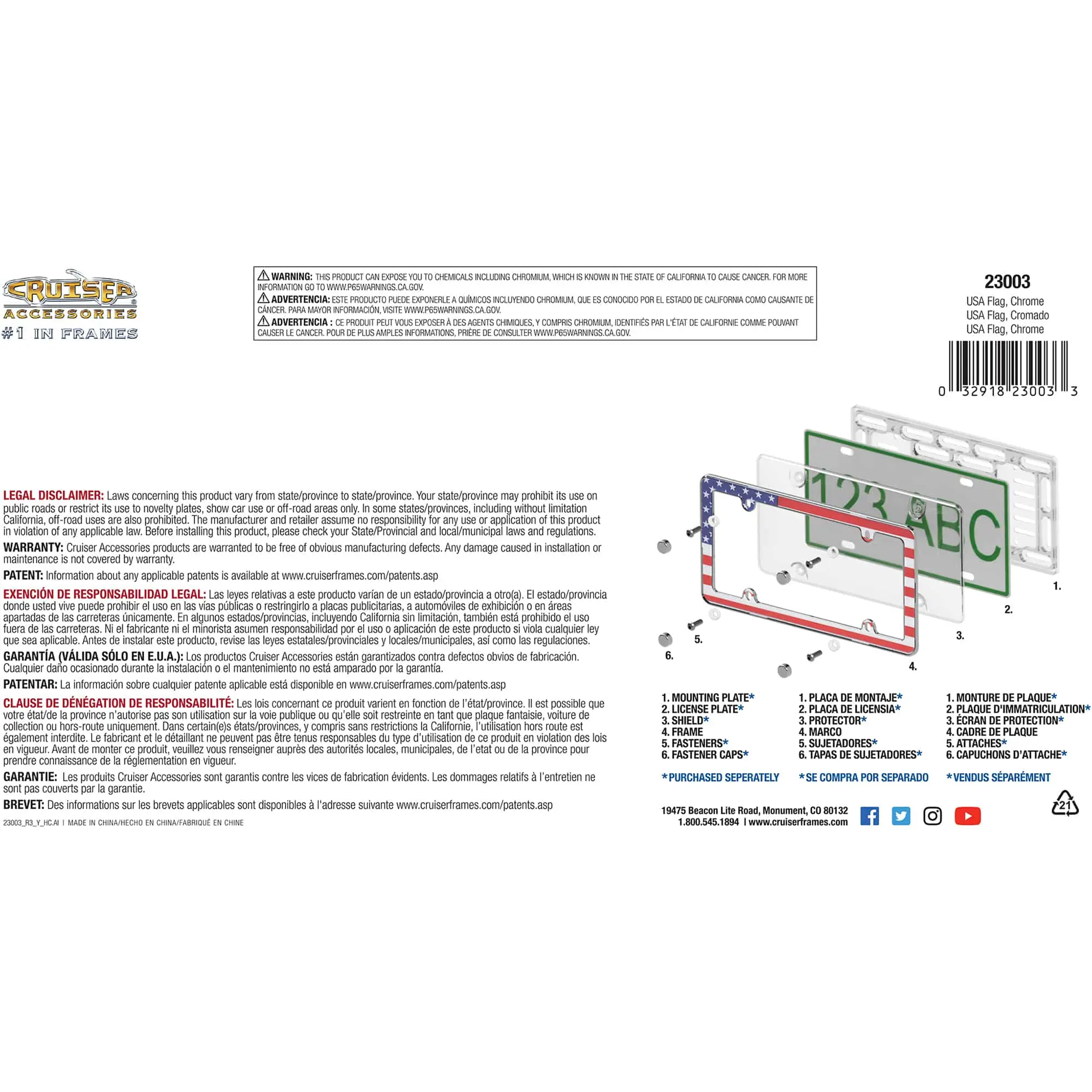 Cruiser Accessories USA Flag license plate frame is the perfect way to show your patriotism. Frame features a bright, colorful graphic of the USA Flag is printed on a clear polycarbonate insert that is combined with a chrome plated base. UV resistant inks protect the image from fading and the polycarbonate protects image from road debris, extending the life of the graphic. Engineered to Show More Plate, this frame does not obstruct state name or registration stickers. Frame is made of ABS plastic and the insert is made of unbreakable polycarbonate. Easy installation with basic tools. Fits 6" x 12" license/novelty plates.