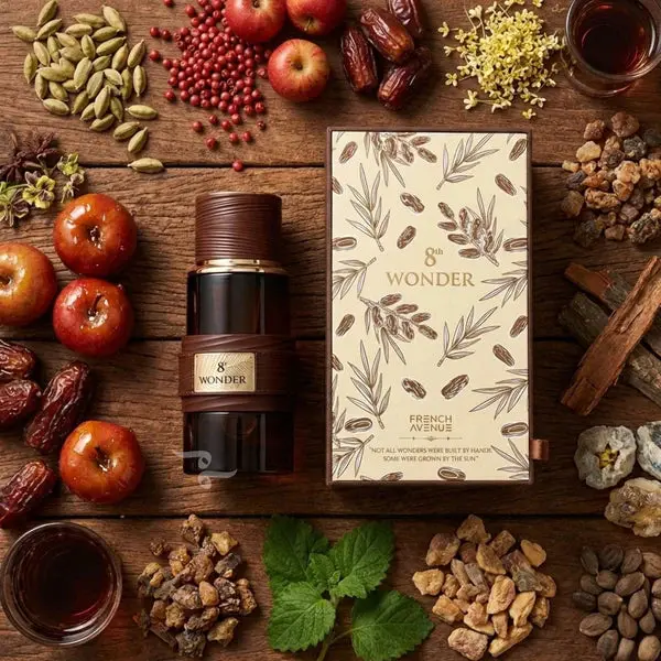 8th WONDER EDP by French Avenue combines top notes of Pink Pepper, Cardamom, and Candy Apple with a unique blend of Liquor, Dates, and Osmanthus at its core. The fragrance concludes with rich base notes including Amber Xtreme and Patchouli, creating a complex scent profile suitable for diverse occasions.