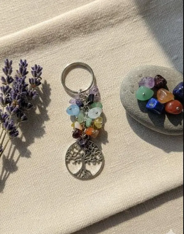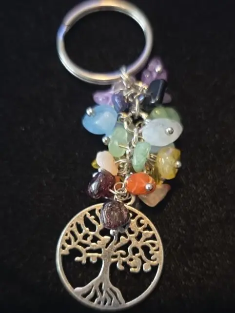 Crafted with a detailed, silver-tone Tree of Life charm—a powerful symbol of connection, growth, and strength—this keychain features a cluster of genuine polished natural stone chips, representing the Seven Chakras (Root to Crown). Each unique stone promotes chakra alignment and spiritual healing, bringing balance to your life.