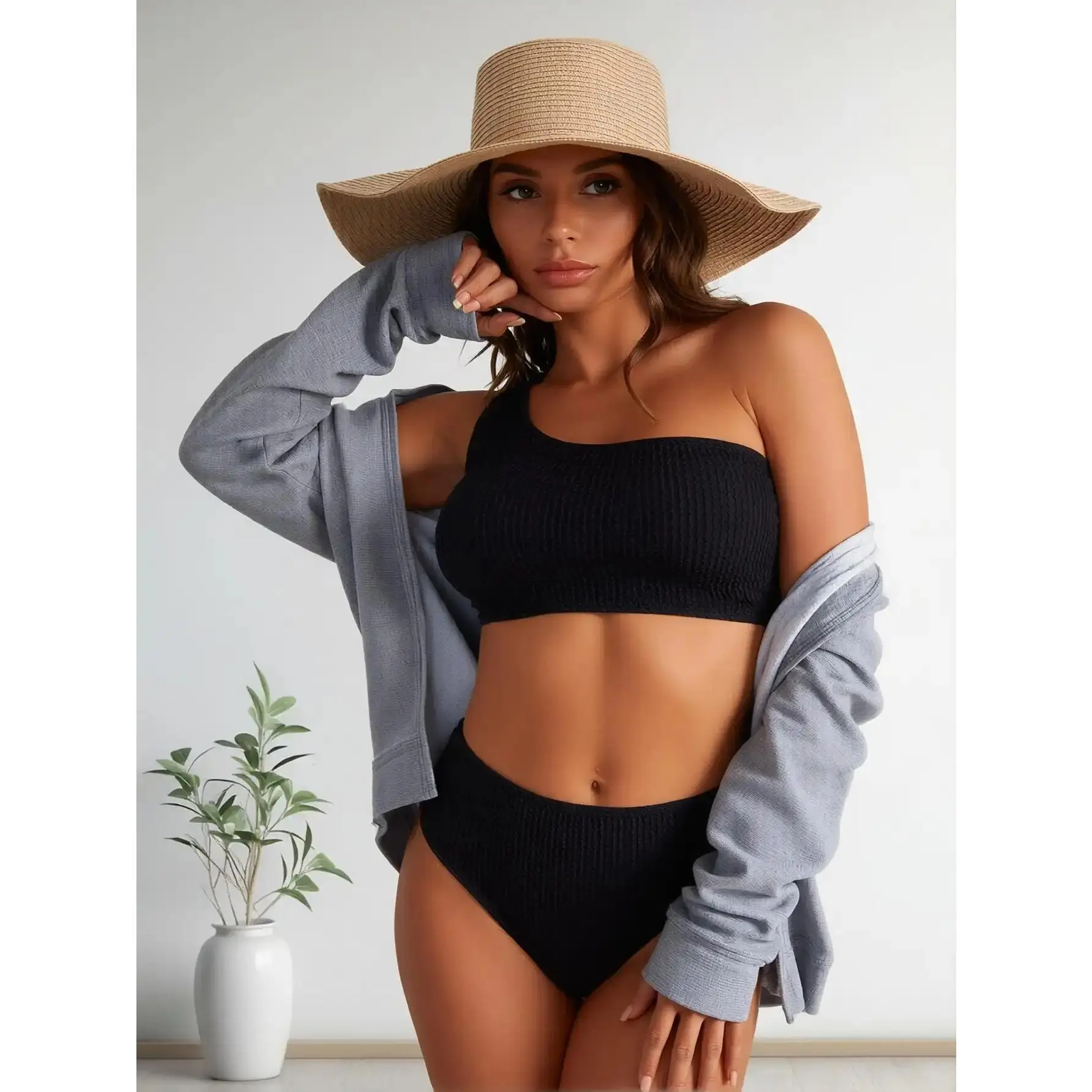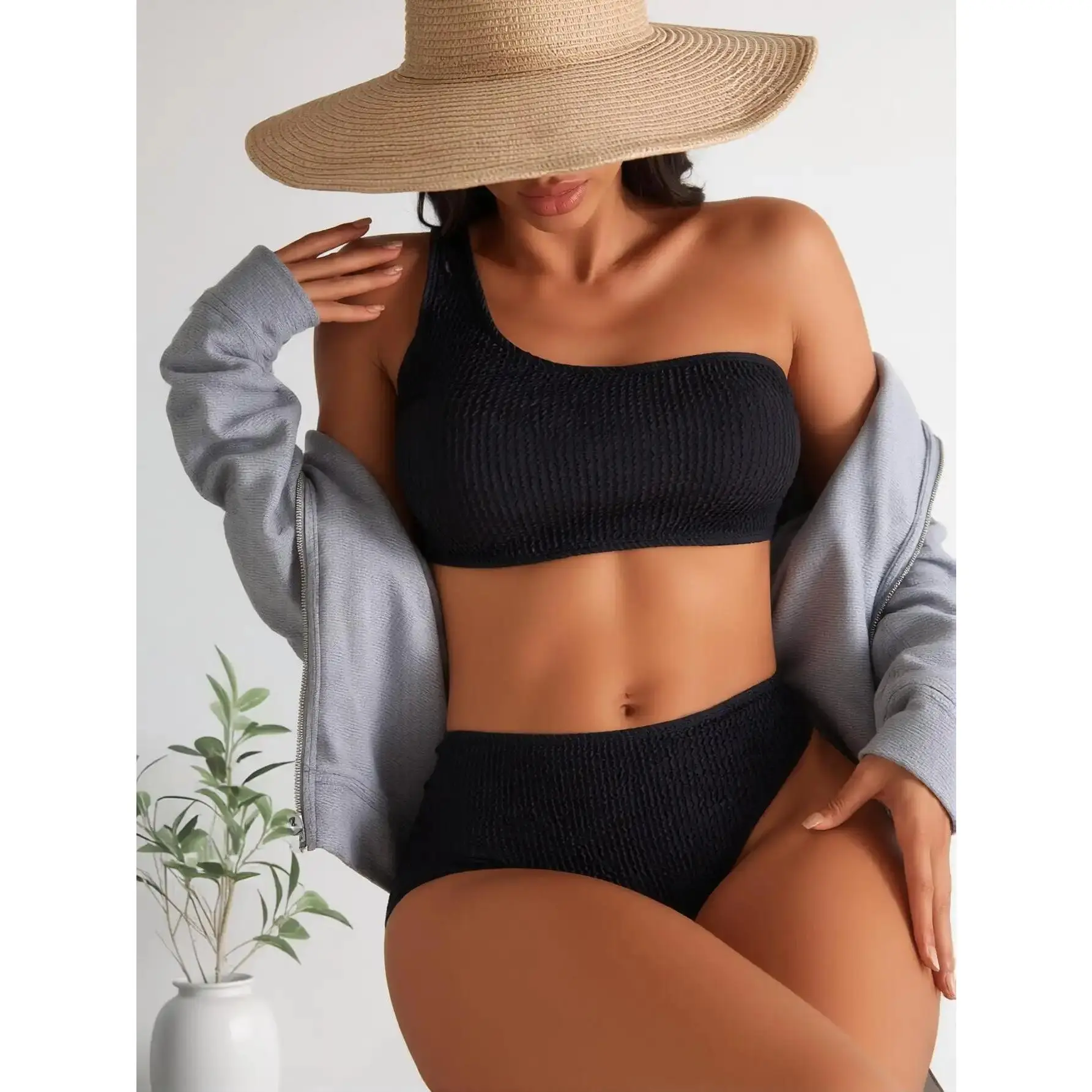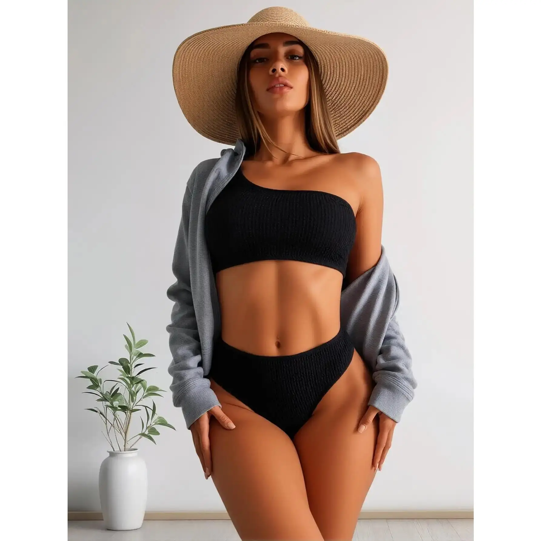 [One-Shoulder Sophistication]: Featuring a sleek one-shoulder design, this two-piece bikini accentuates your collarbone and shoulder line, creating a bold, modern silhouette that stands out at any beach or pool occasion.