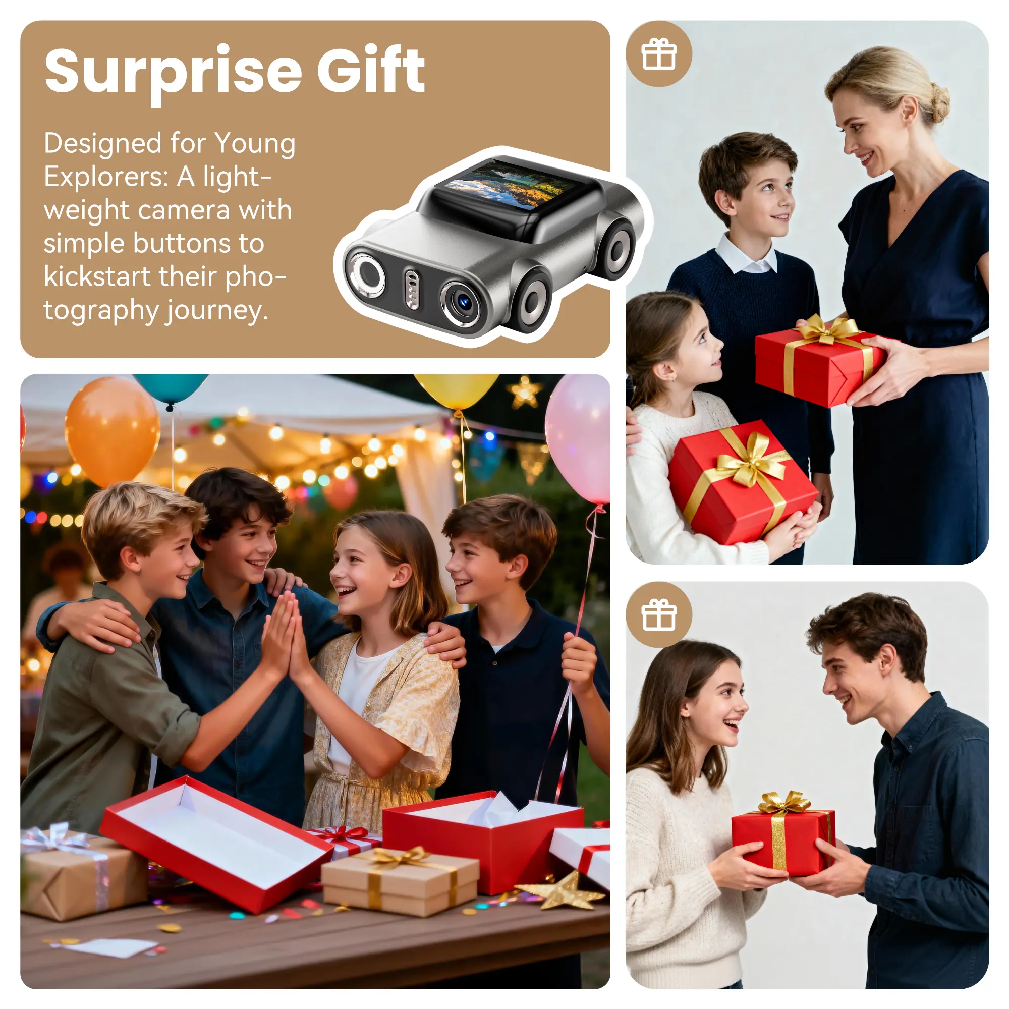 🎁 The camera comes in a charming car-shaped gift box. It includes a 32GB memory card, two USB cables, and a lanyard. Record anytime, anywhere with this compact and efficient camera.