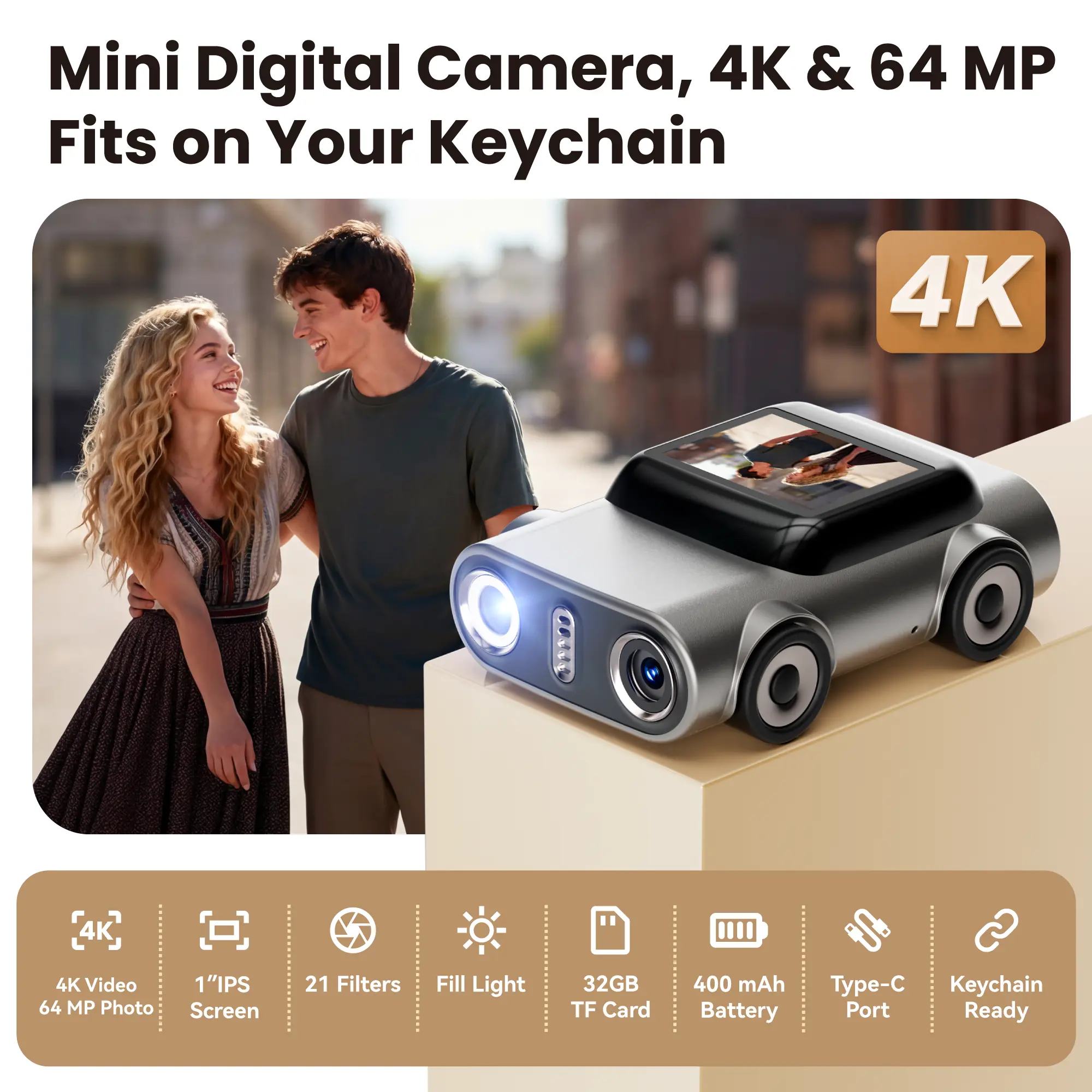 ✨ Compact and Versatile: This mini car-shaped camera is perfect for students and outdoor enthusiasts. It captures photos and videos with 4K image quality. Ideal for vlogs and scenery recording, it offers multiple uses in one device. The 32GB memory card is included for immediate use.