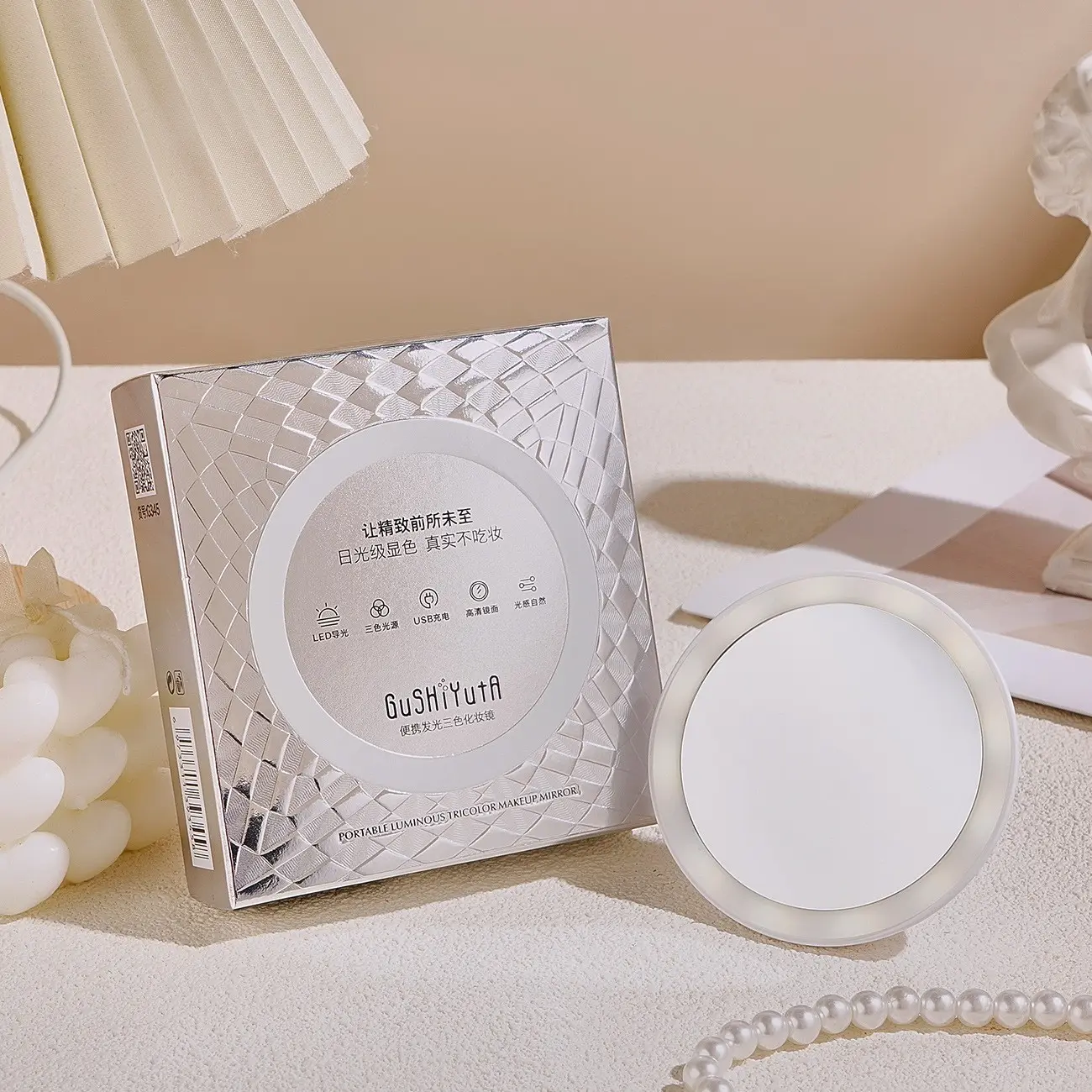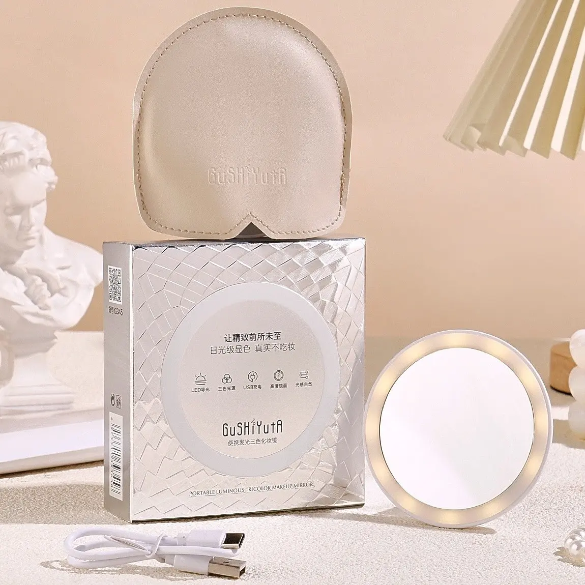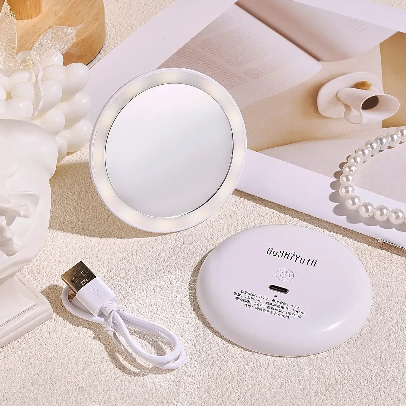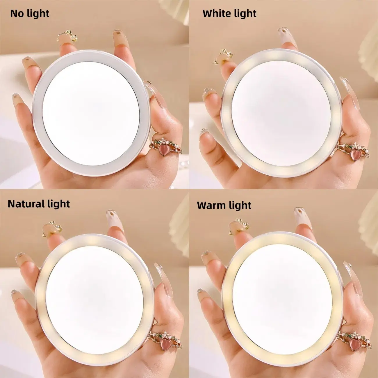 ✨A portable and compact illuminated vanity mirror for travel, USB rechargeable with three-color dimmable lighting, a pocket-sized touch-up mirror, an essential tool for daily makeup.