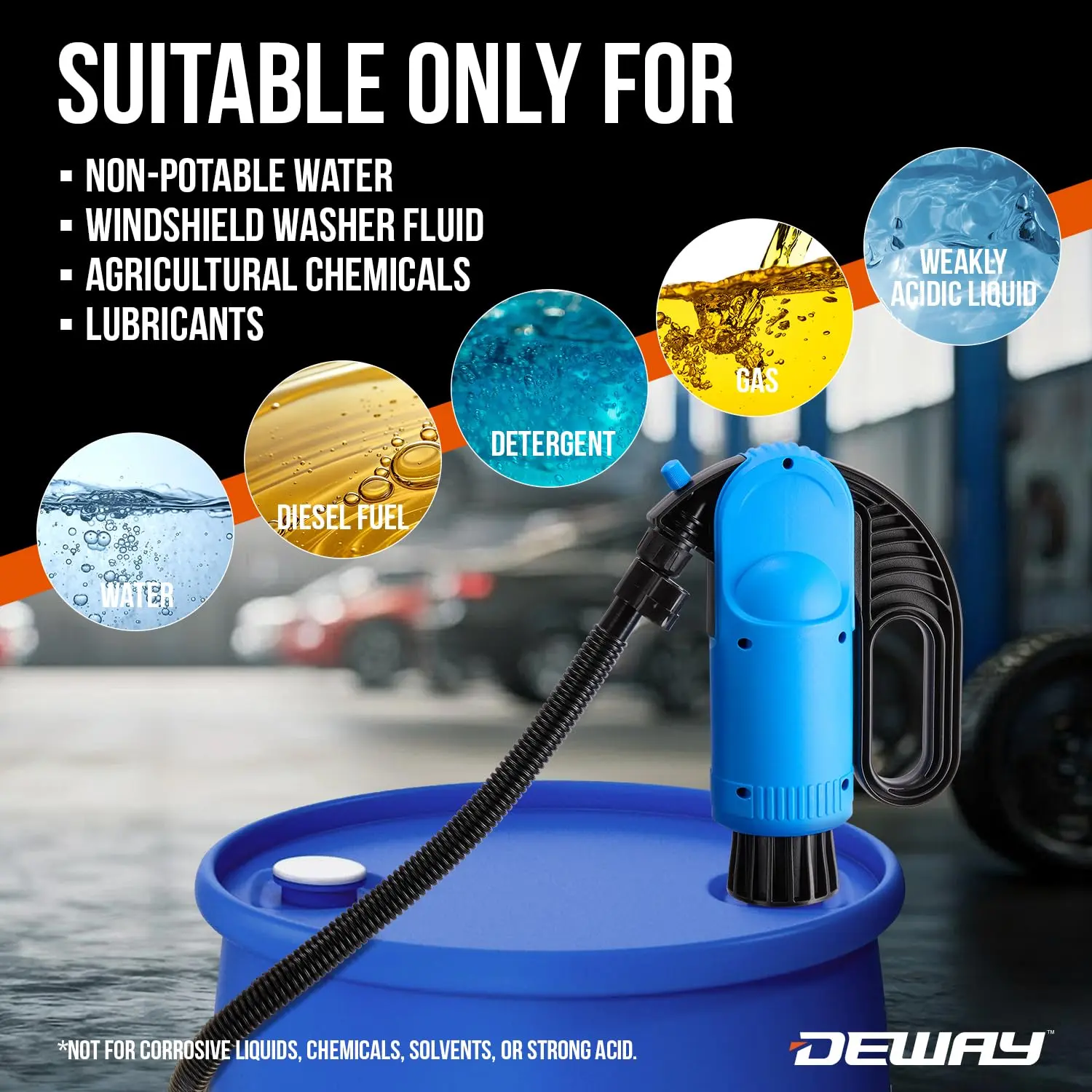 VERSATILE & SECURE OPERATION | Safely transfers diesel, kerosene, lubricants, antifreeze, windshield washer fluid, DEF (AdBlue), agricultural chemicals, and non-potable water | Not for corrosive chemicals, solvents, acids, or liquids above 104°F | For best performance, dedicate pump to one liquid type only | Drum bung adapter ensures tight, stable installation, while the air vent cap allows controlled flow, easy shut-off, and proper upright storage to protect pump integrity