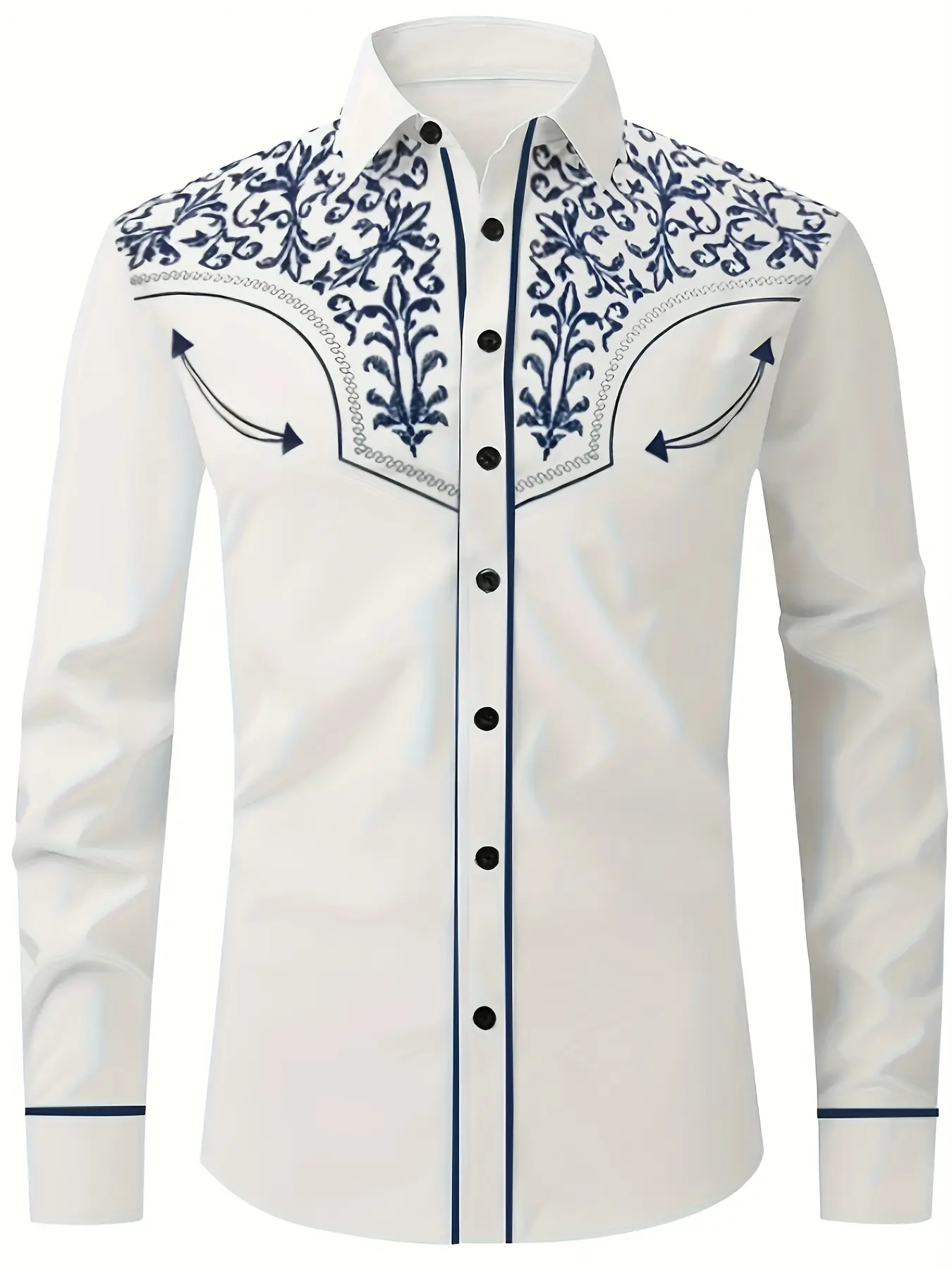 Men's Blue Pellis Pattern Long Sleeved Lapel Shirt, Autumn Business Casual Wear, Fitted Ethnic Design, Spring & Fall Fashion Top