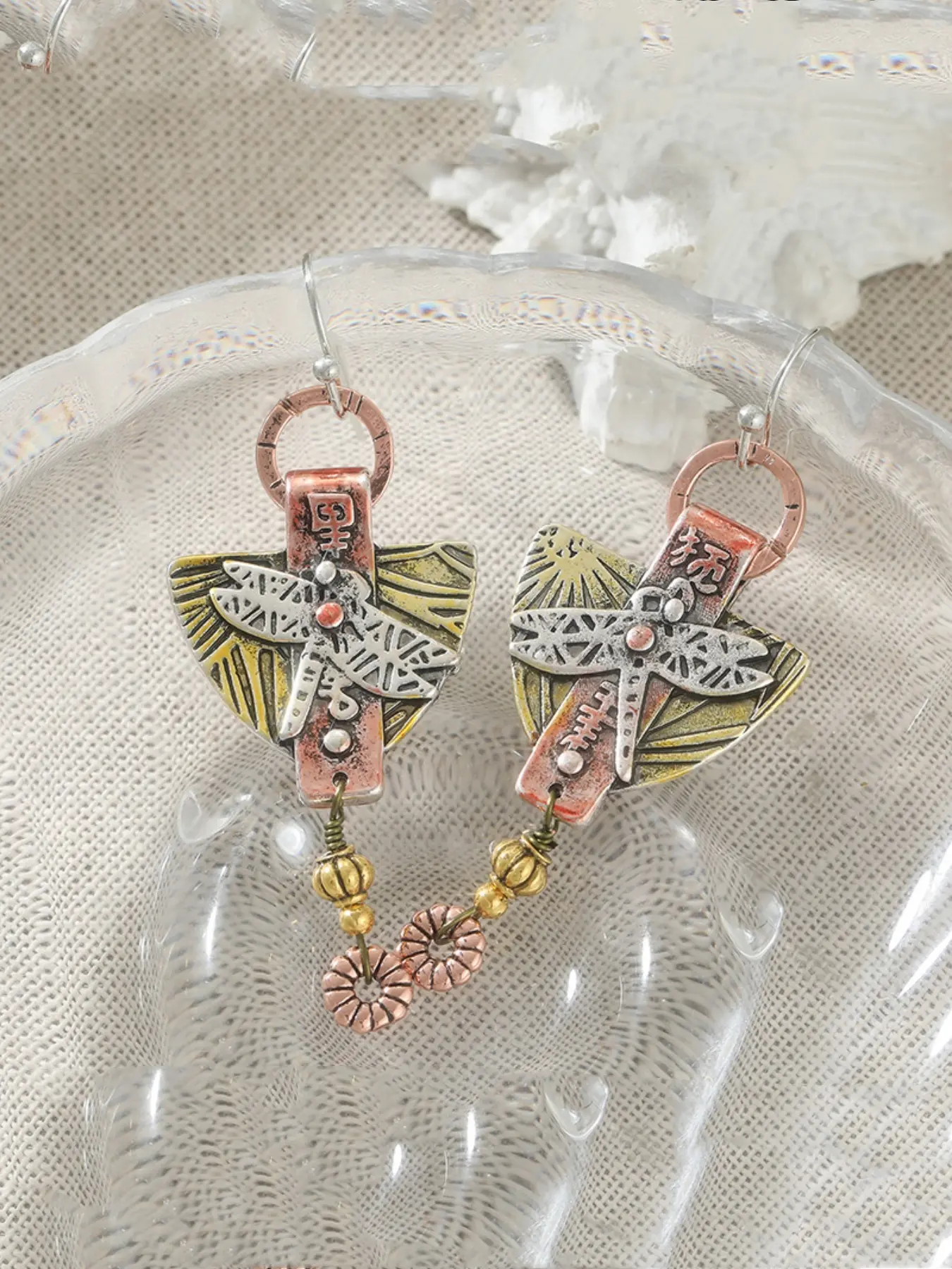 1pair of Ethnic Carved Dragonfly Geometric Drop Hook Earrings Pendientes Women's Vintage Round Triangle Dangle Earrings