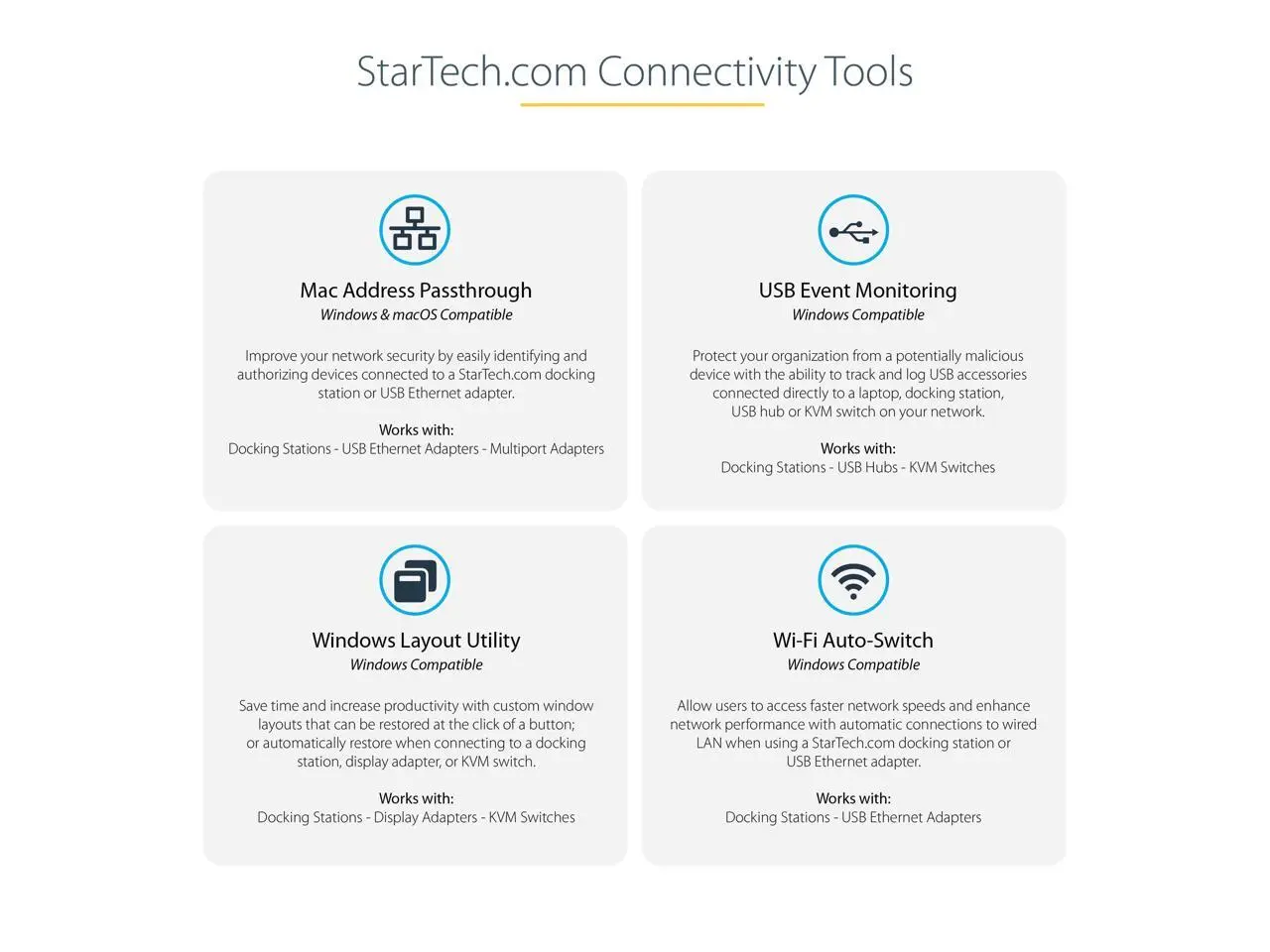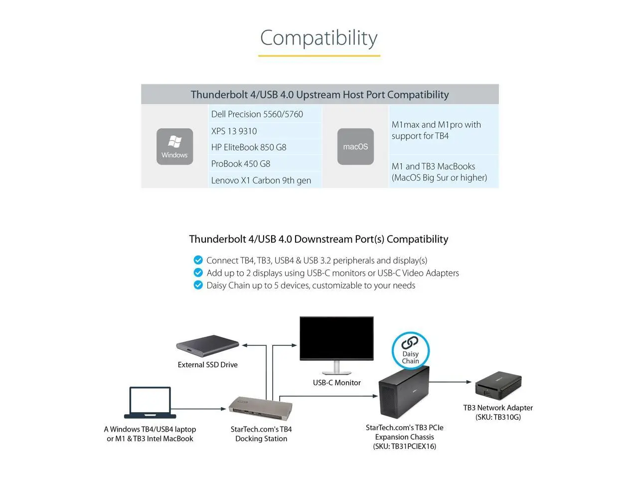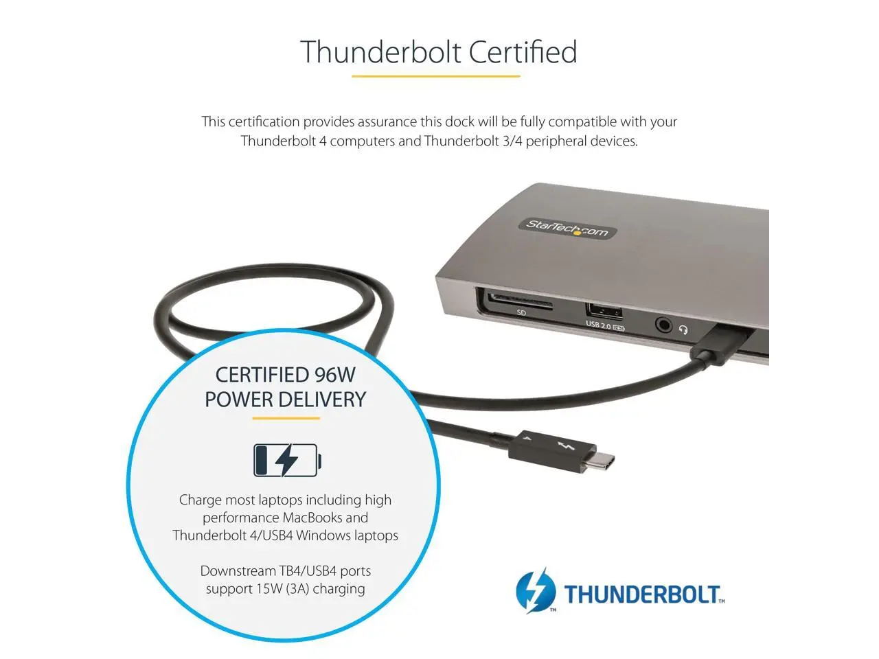·This Thunderbolt 4 Certified docking station lets you use a single Thunderbolt 4, Thunderbolt 3 or USB4 port to add high-performance connectivity and charge your Thunderbolt 4 or USB4 Windows laptop, or your Thunderbolt 3 M1 or Intel MacBook (macOS 11 Big Sur or higher).For easy deployment the dock includes a 2.6 ft. (0.8 m) Thunderbolt 4 cable that connects to the front-facing host port, and features Kensington-style security slots.High-Performance Port ConnectivityThe docking station utilizes the high throughput available to your computers Thunderbolt 4, Thunderbolt 3, or USB4 port to provide a wide range of port connectivity to suit a variety of applications, including daisy chaining up to five devices from the TB4/USB4 ports.The dock features:3x downstream Thunderbolt 4/USB4 ports to flexibility connect Thunderbolt 4, Thunderbolt 3, and USB peripheral devices and display(s), with the added benefit of 15W (3A) device charging per each port.3x USB 3.2 Gen 2 (10Gbps) Type-A portsto connect USB peripheral devices.1x USB 2.0 (480Mbps) Type-A port that supports BC 1.2 with 7.5W (1.5A) for charging tablets and smartphones, or connecting USB Human Interface Device(s) (HID), such as a USB transceiver, to minimize signal interference.1x Gigabit Ethernet port with PXE boot and WoL to connect to a wired Local Area Network (LAN).1x Secure Digital (SD) 4.0/UHS-II card reader to externally access SD, SDHC and SDXC memory cards.1x 3.5mm 4-position TRRS Audio Jack to connect a 3.5mm headset.High-Resolution Display ConnectivityUp to two monitors can be attached to any of the downstream Thunderbolt 4 ports using USB-C monitors, Thunderbolt monitors or USB-C DP Alt Mode to video adapters (video adapter required, each sold separately).On Thunderbolt 4 Windows laptops the dock can support dual monitors with resolutions up to 4K 60Hz, or a single monitor with resolutions up to 8K/6K/5K/4K 60Hz.On M1 Thunderbolt 3 MacBooks the dock can support a single monitor with resolutions up to 6K/5K/4K 60Hz.On Intel Thunderbolt 3 MacBooks the dock can support dual monitors with resolutions up to 4K 60Hz, or a single monitor with resolutions up to 5K/4K 60Hz.On USB4 Windows laptops the dock can support a single monitor with resolutions up to 8K/6K/5K/4K 60Hz.96W USB Power Delivery CertifiedThe Thunderbolt 4 docking station includes a 135W power adapter and supports 96W USB power delivery. This enables the dock to charge your MacBooks and Thunderbolt 4 and USB4 Windows laptops. Plus, the added power provides downstream TB4/USB4 ports with 15W (3A) for device charging, and enables one of the USB-A ports to support BC 1.2, for charging tablets and smartphones.More from the Manufacturer