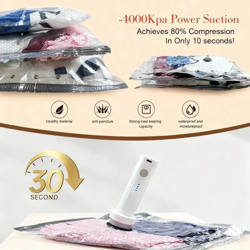 Fast & Powerful Compression Equipped with 4000Pa suction and 140L/min airflow, each bag compresses in just 10–15 seconds. A full set can be packed in under 3 minutes—saving you time and effort.