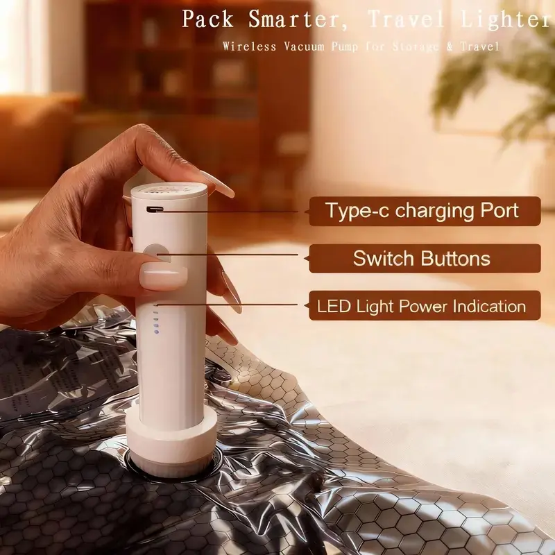 Rechargeable & Cordless Convenience Powered by a 1500mAh battery, the portable pump compresses up to 90 bags on a single charge. With USB charging via laptop or power bank, it’s ready to use anywhere in the world.