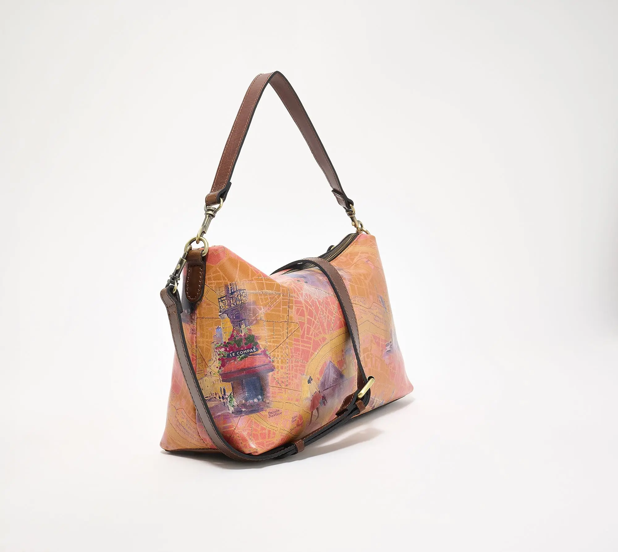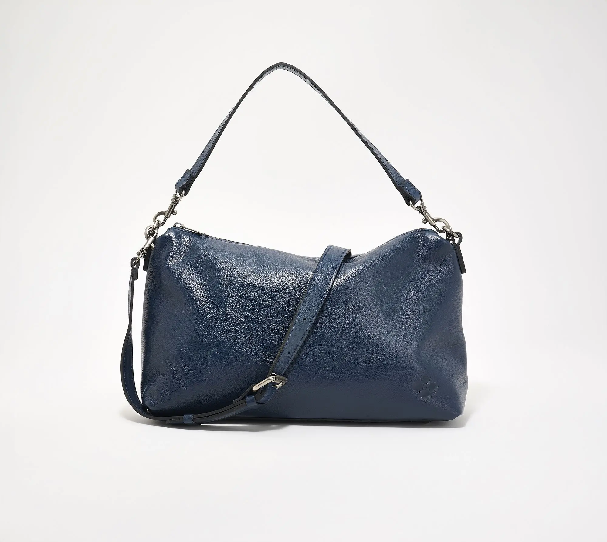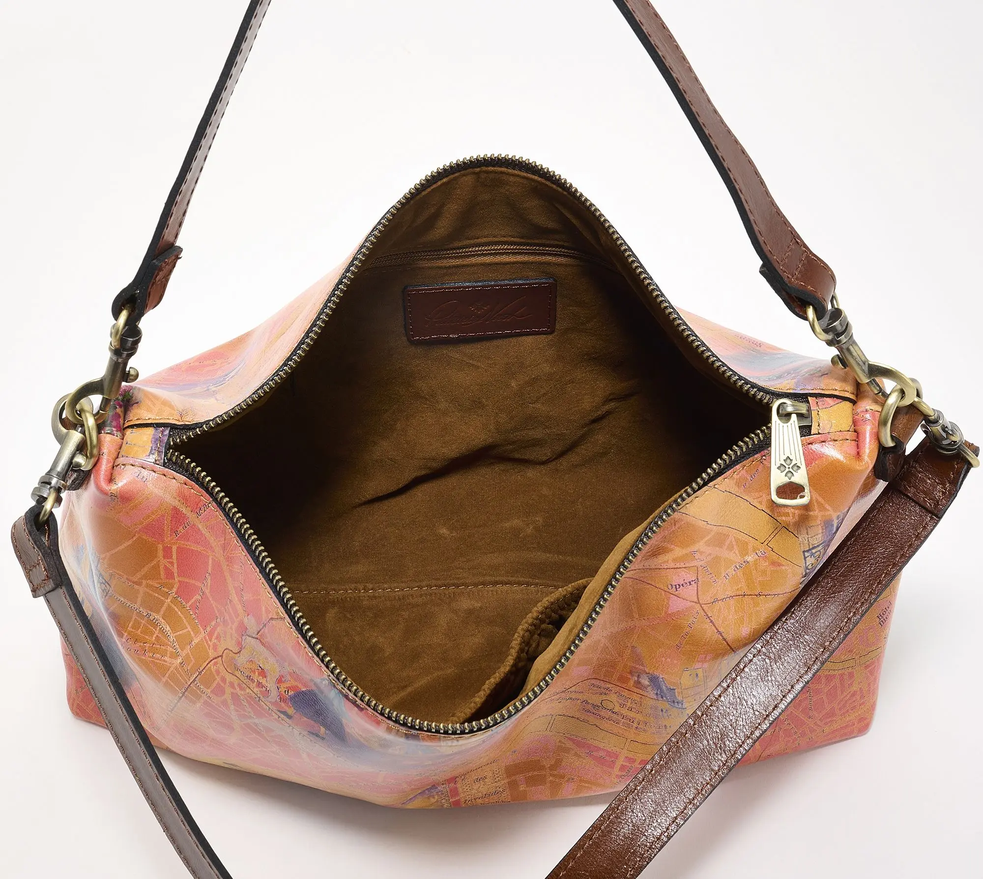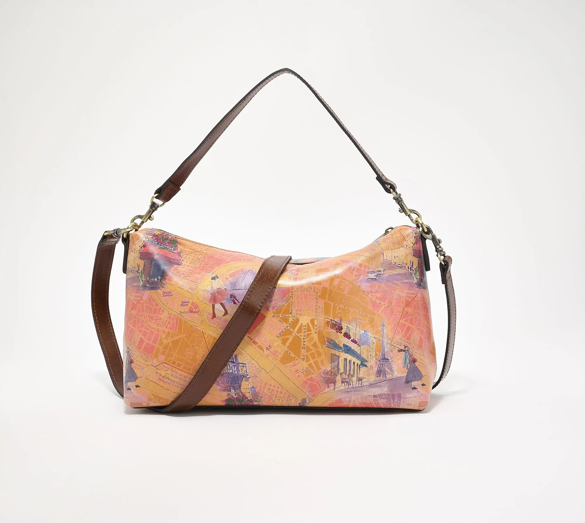 Patricia Nash Maura Crossbody in Leather or Suede. Detachable top handle and an adjustable detachable crossbody. Interior: 2 front slip pockets, 1 rear zip pocket. Exterior: protective metal feet, burned edge finish. Zipper closure. Content: 100% Leather. Dimensions: 13" L x 4 3/4" D x 8" H. Handle drop: 7". Strap drop: 22 1/2"-25 1/2". Weight: 1.1.lbs. Dust bag included. Imported.