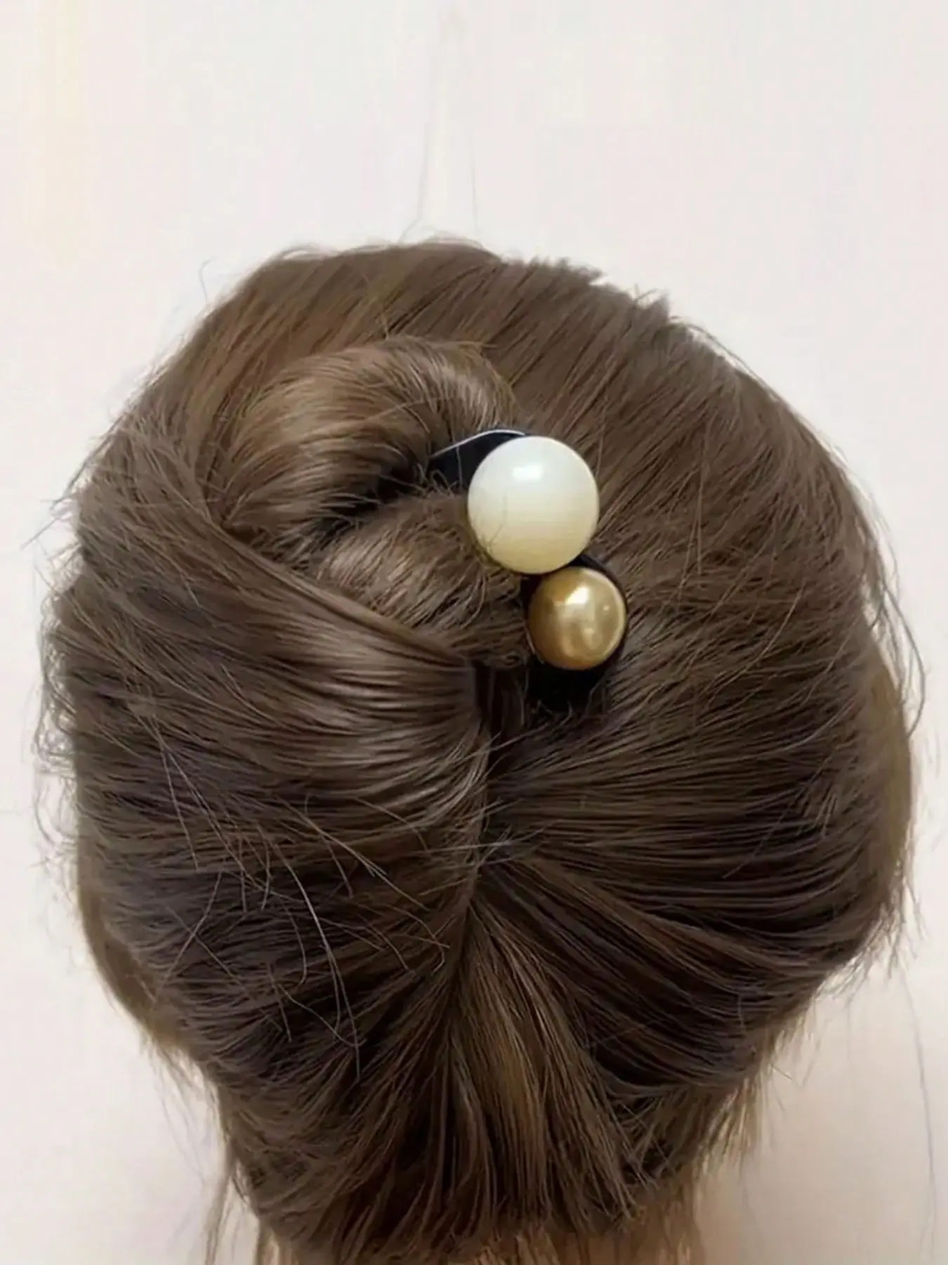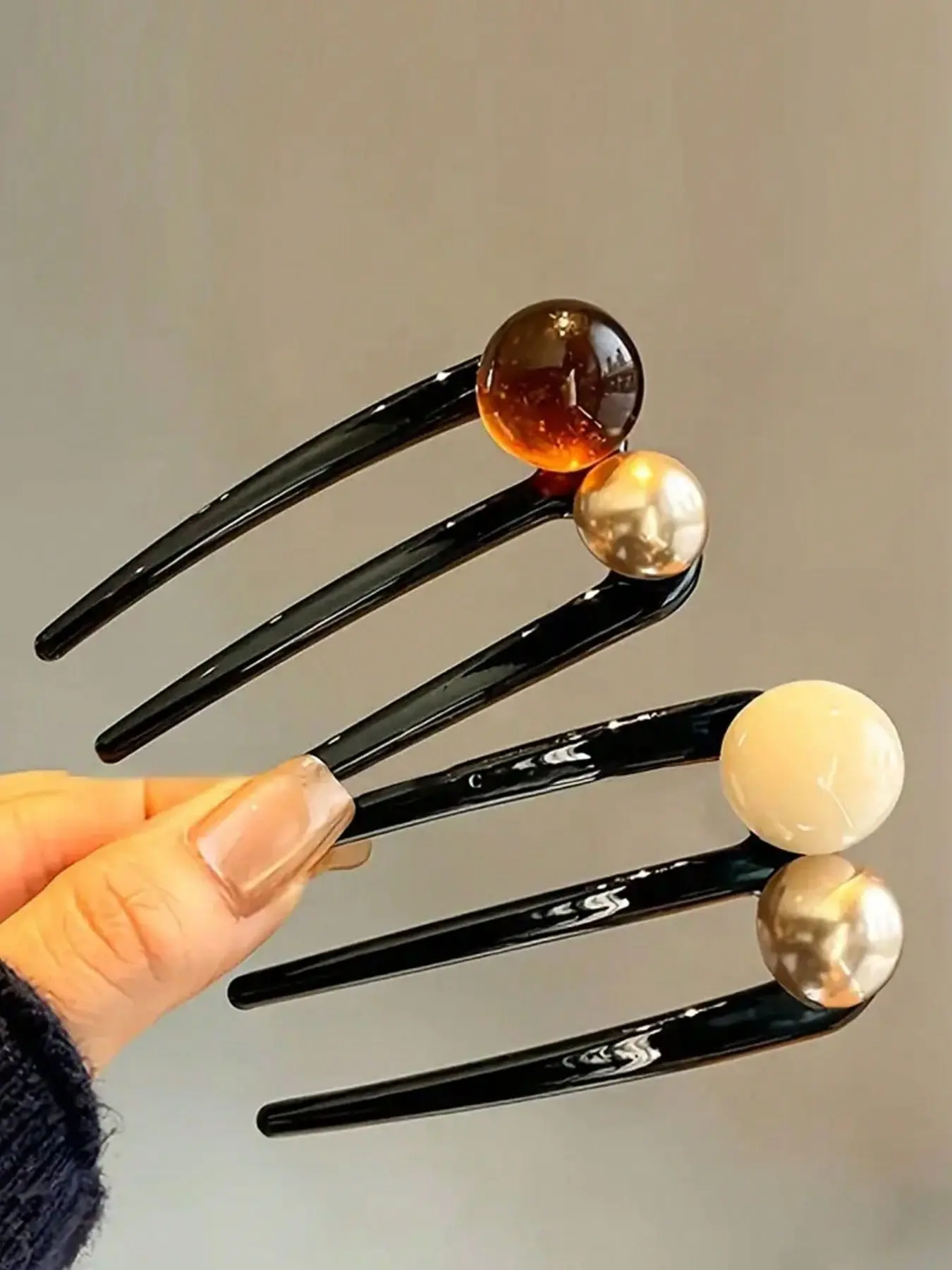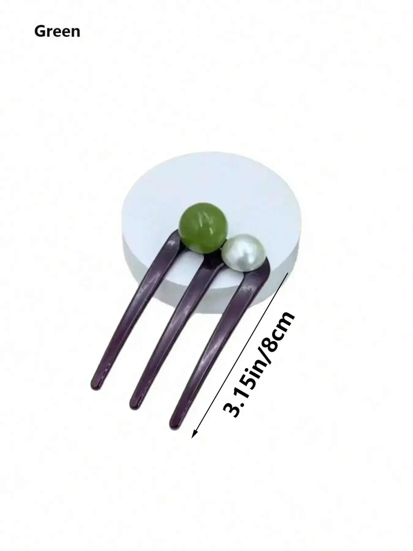 Elegant Three-Tooth Bead U-Shaped Hairpin,Bun Updo Hairpin, Vintage Hair Clips - Black & White with Green Synthetic Gemstonestone Accents, Versatile for Casual & Formal Occasions, All-Season girls Hair Accessories, Hair Accessories, Classic Hairpins,